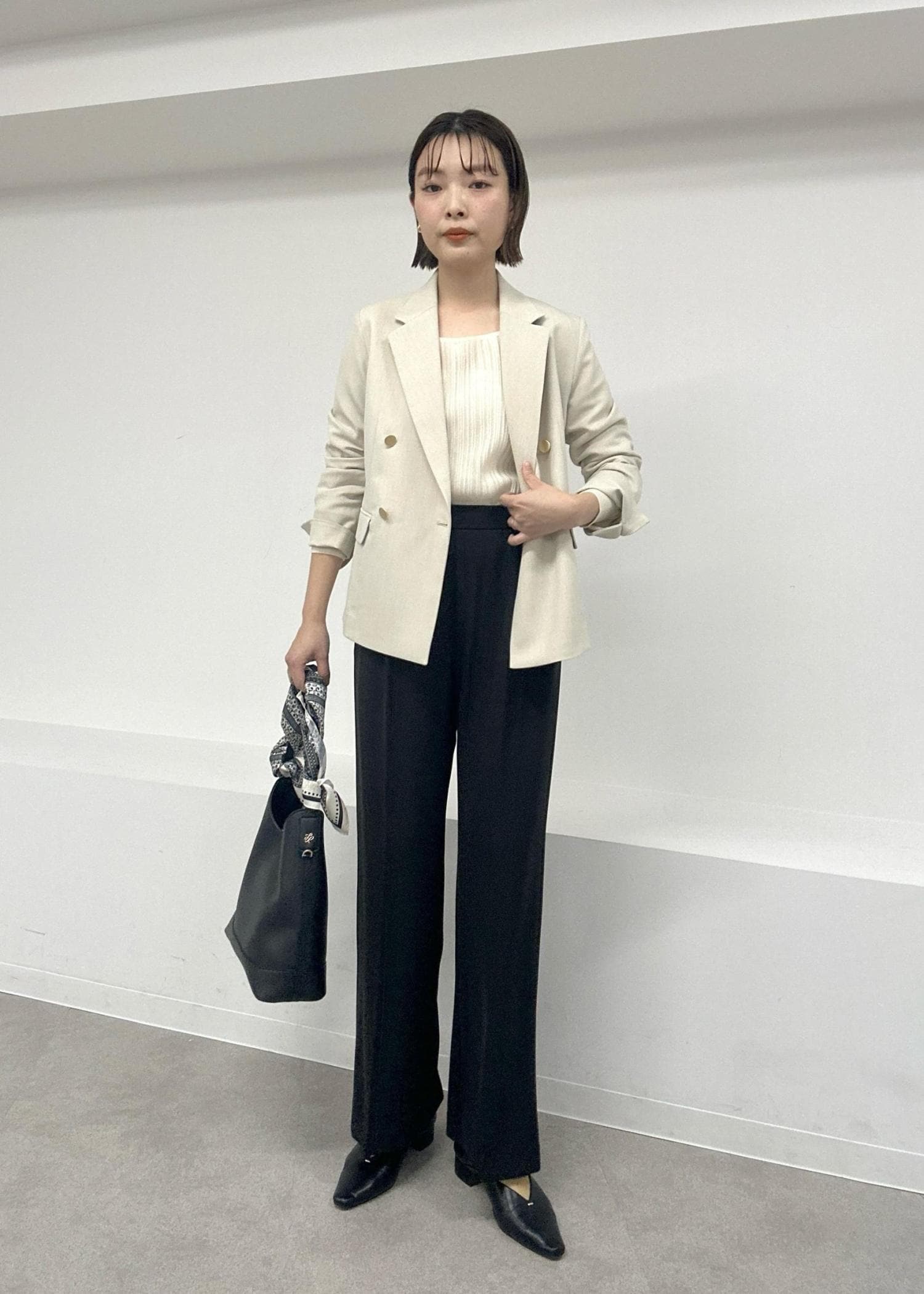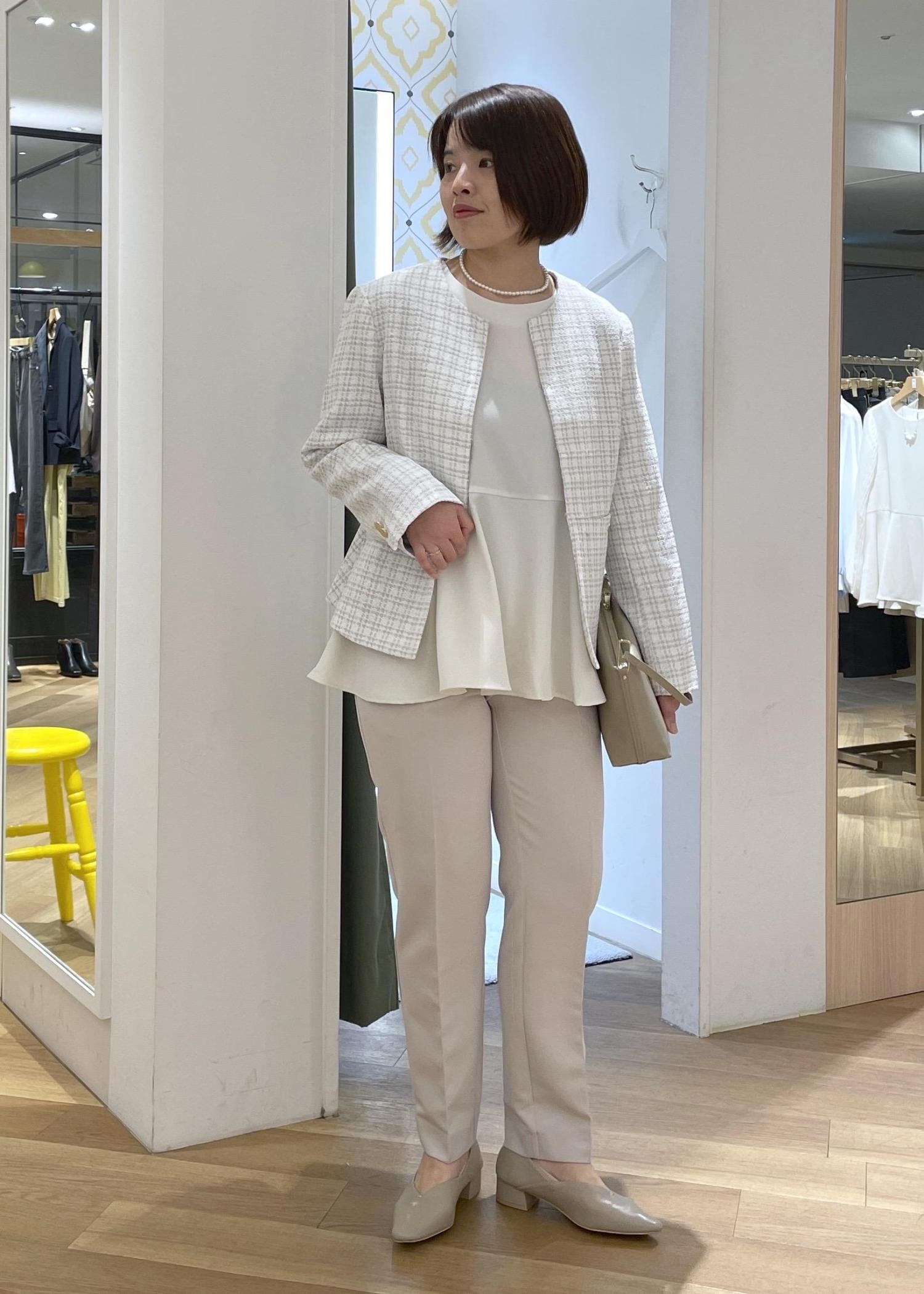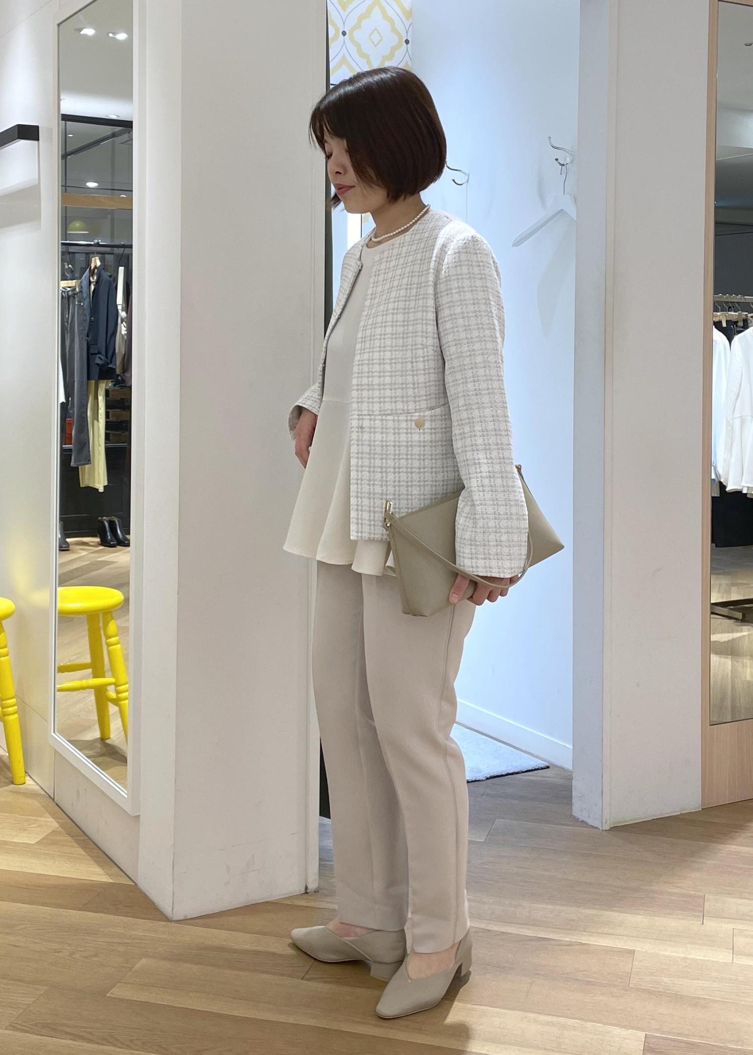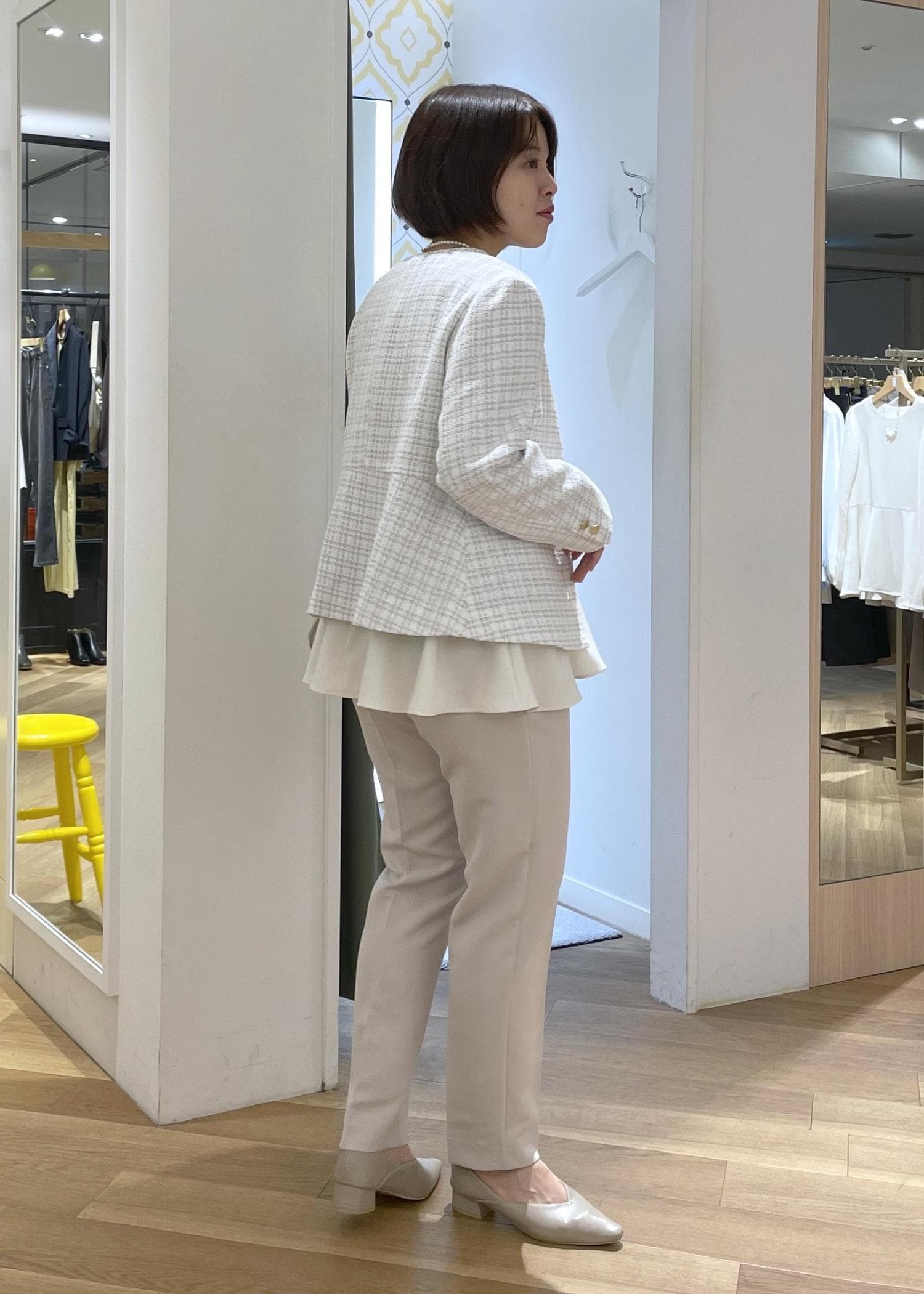 ブラウスとジャケットがフレアラインなので、今回はパンツはすっきりとテーパードラインで合わせました。