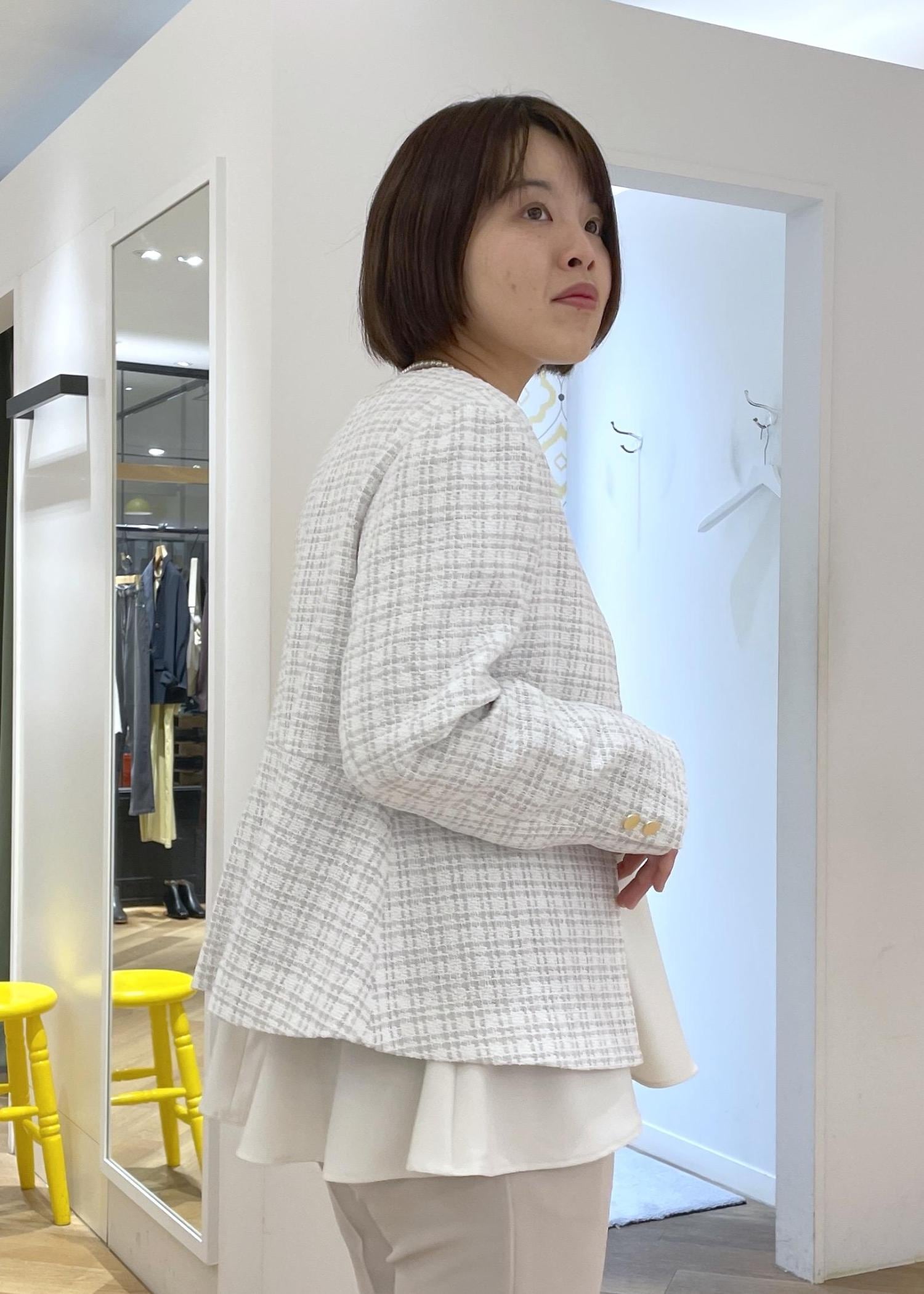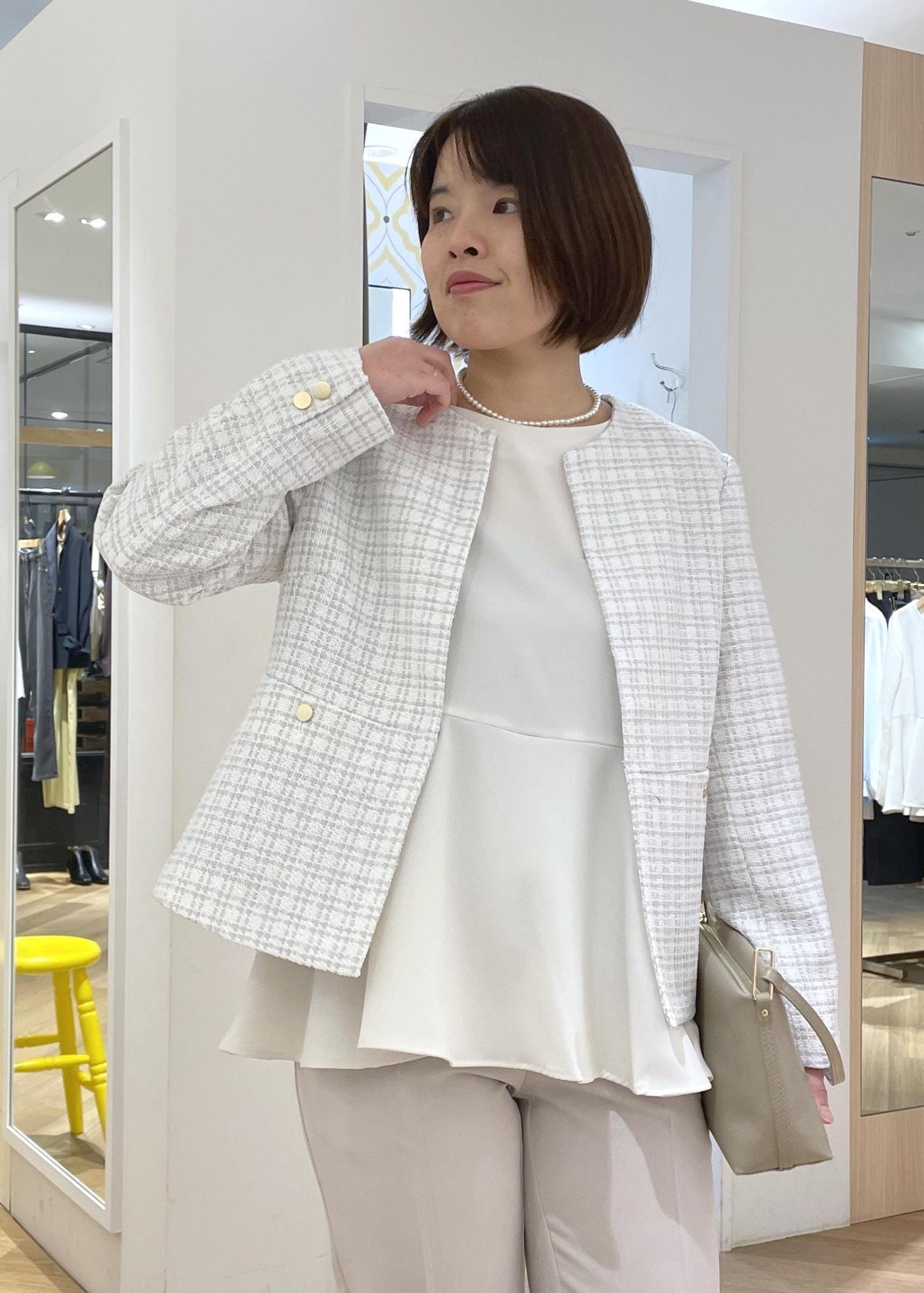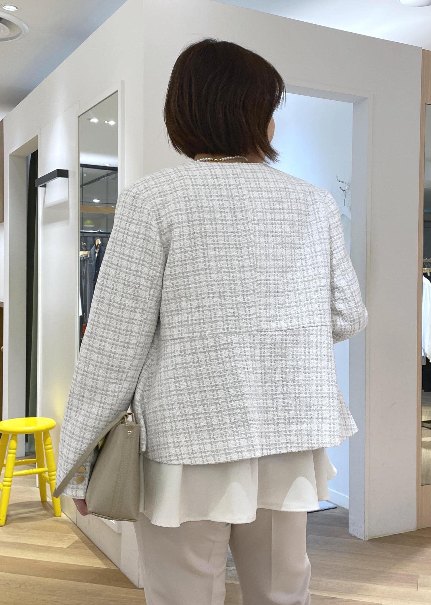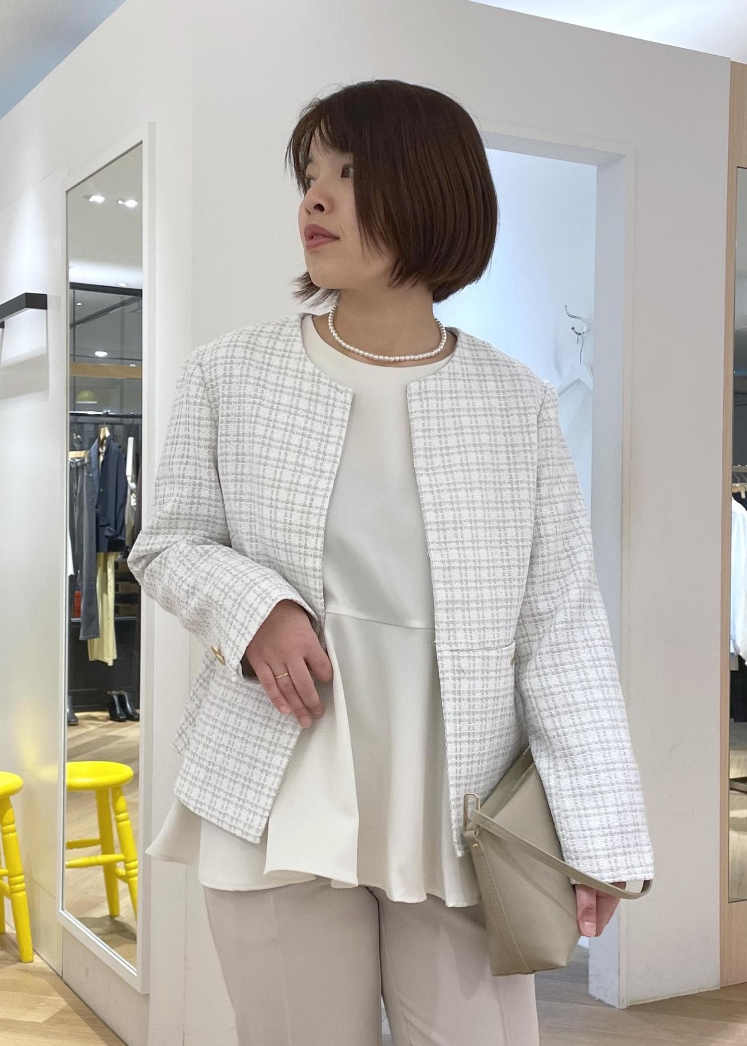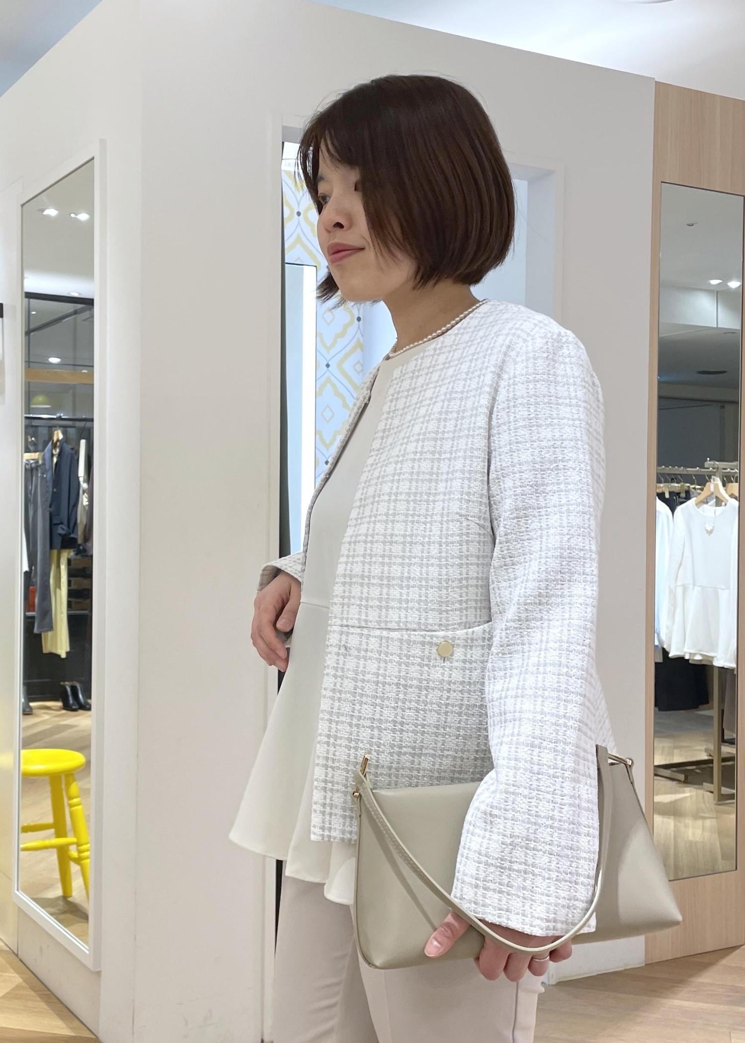 ライトグレーのツイードジャケットに同色系のパンツを合わせた、ワントーンのセレモニーコーデです!