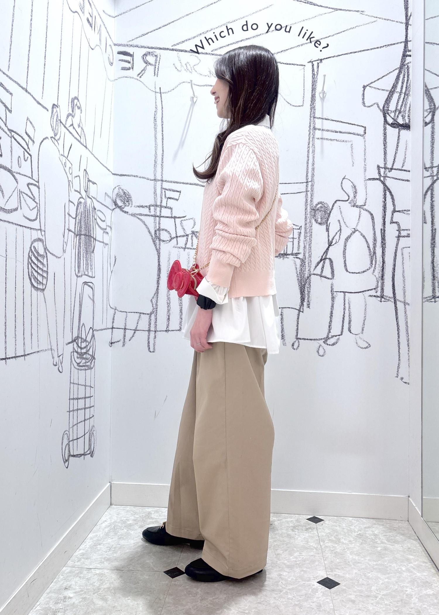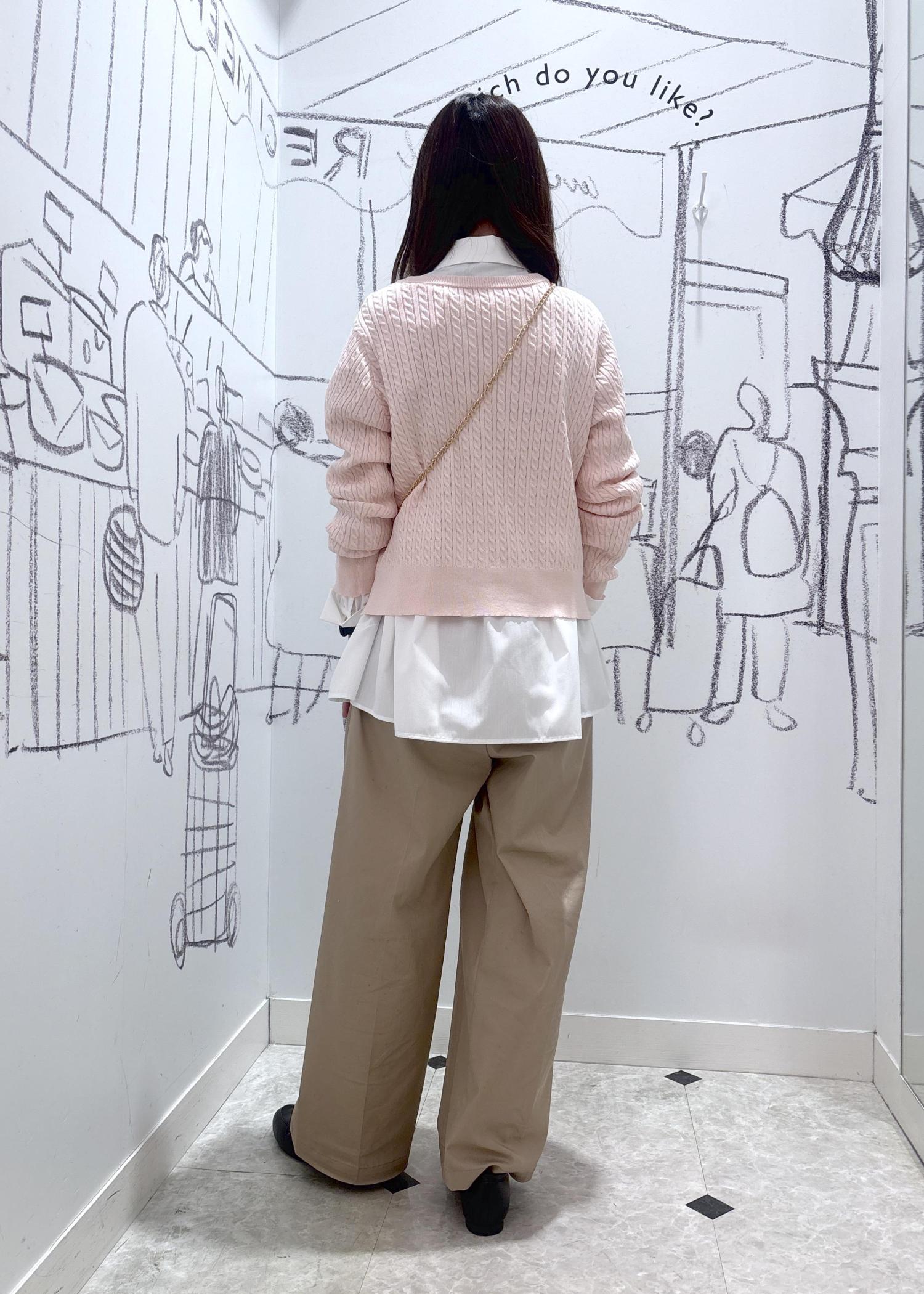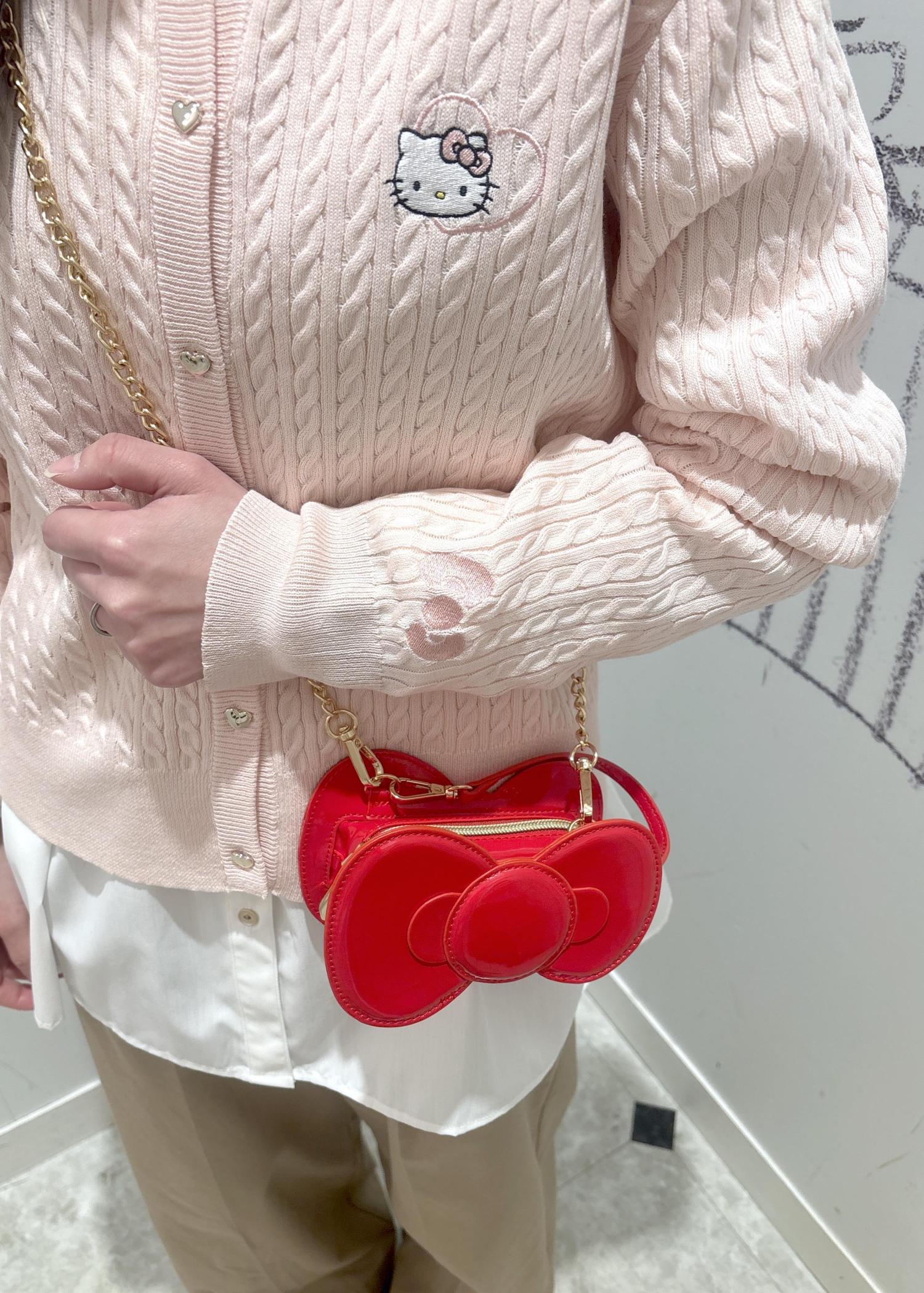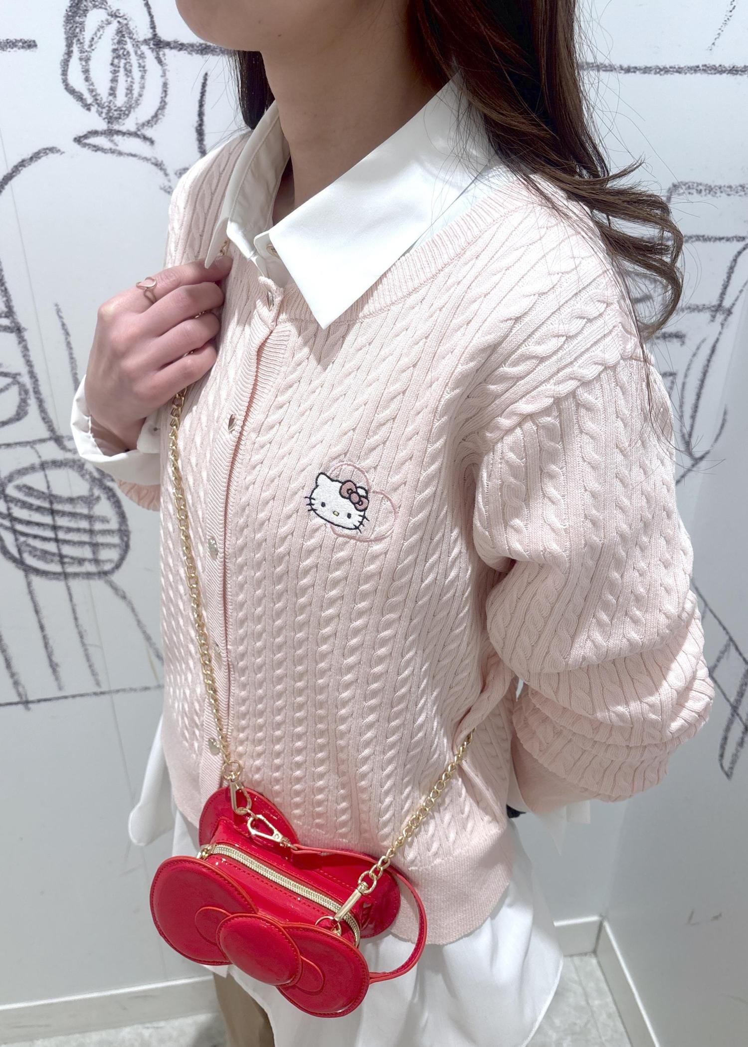 HELLO KITTYとのコラボアイテムのケーブルカーディガンをパンツで合わせたカジュアルなコーディネートです。