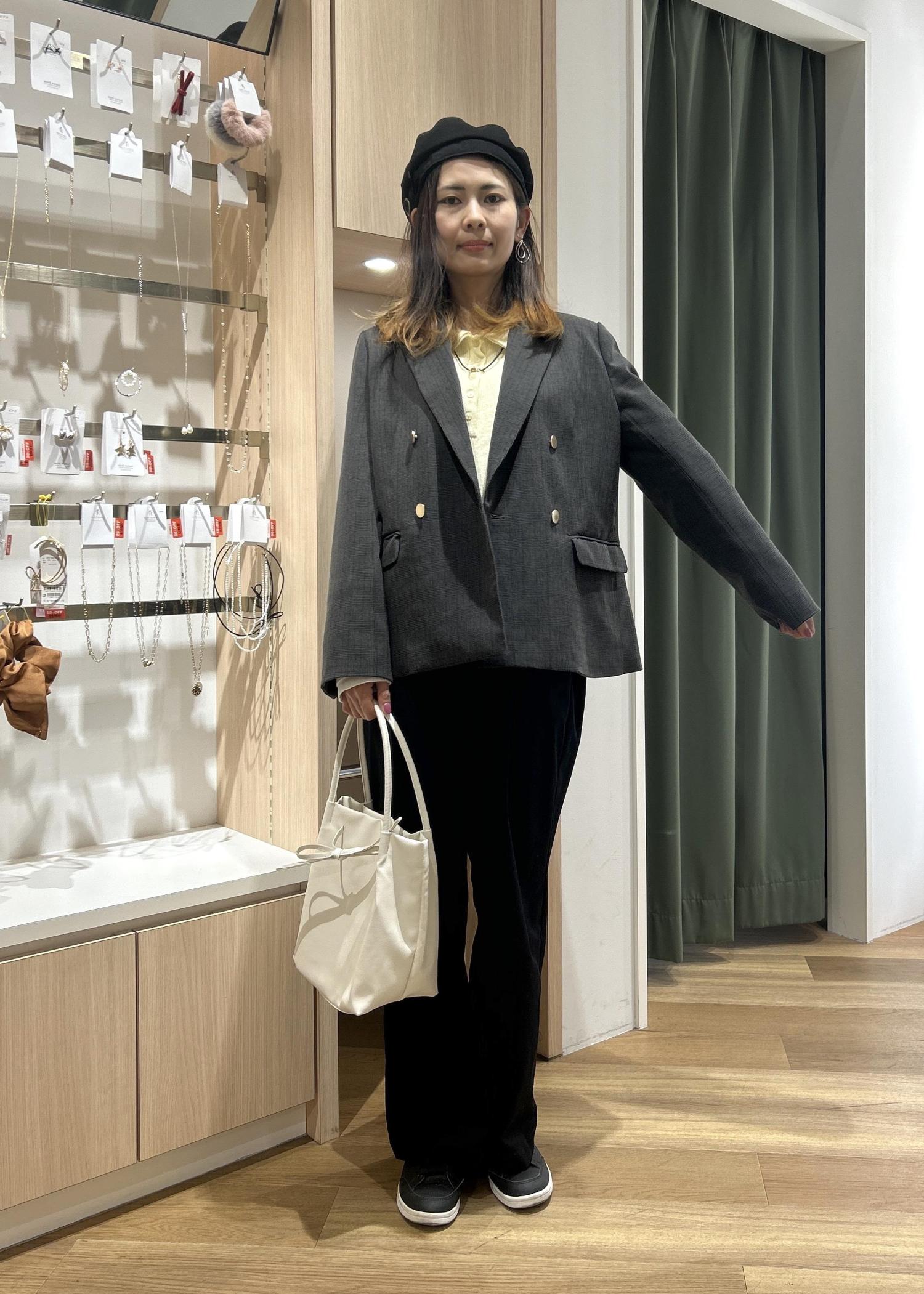 全体をシックに決めつつ、春カラーをポイントで取り入れて、大人なコーデに仕上げました。