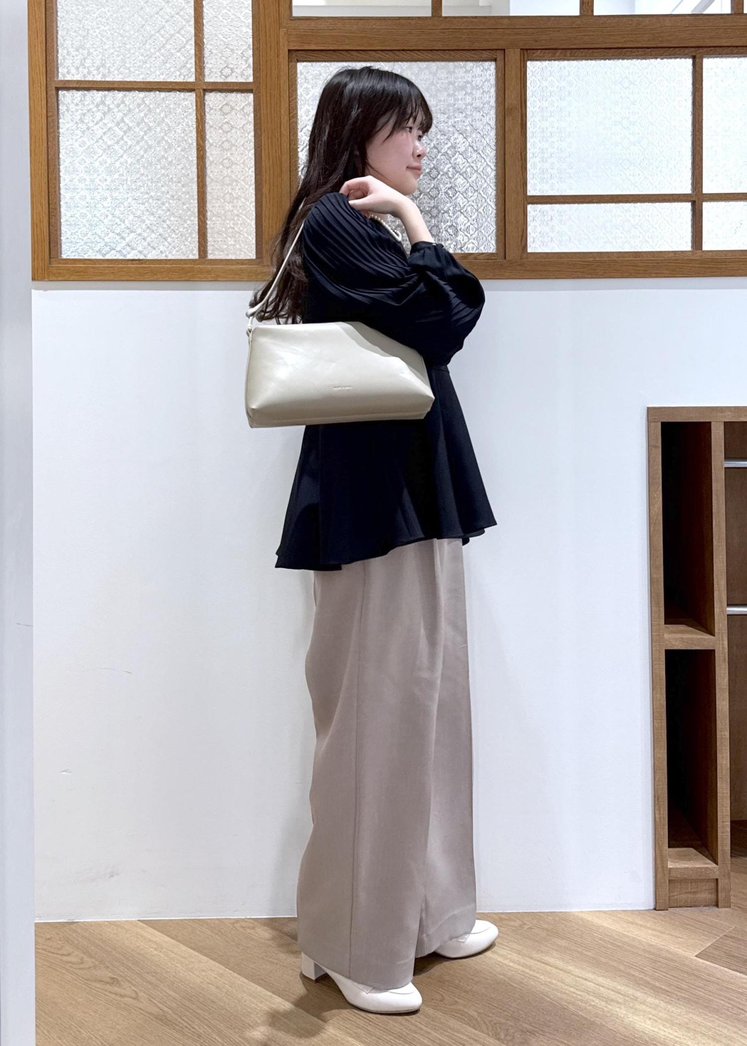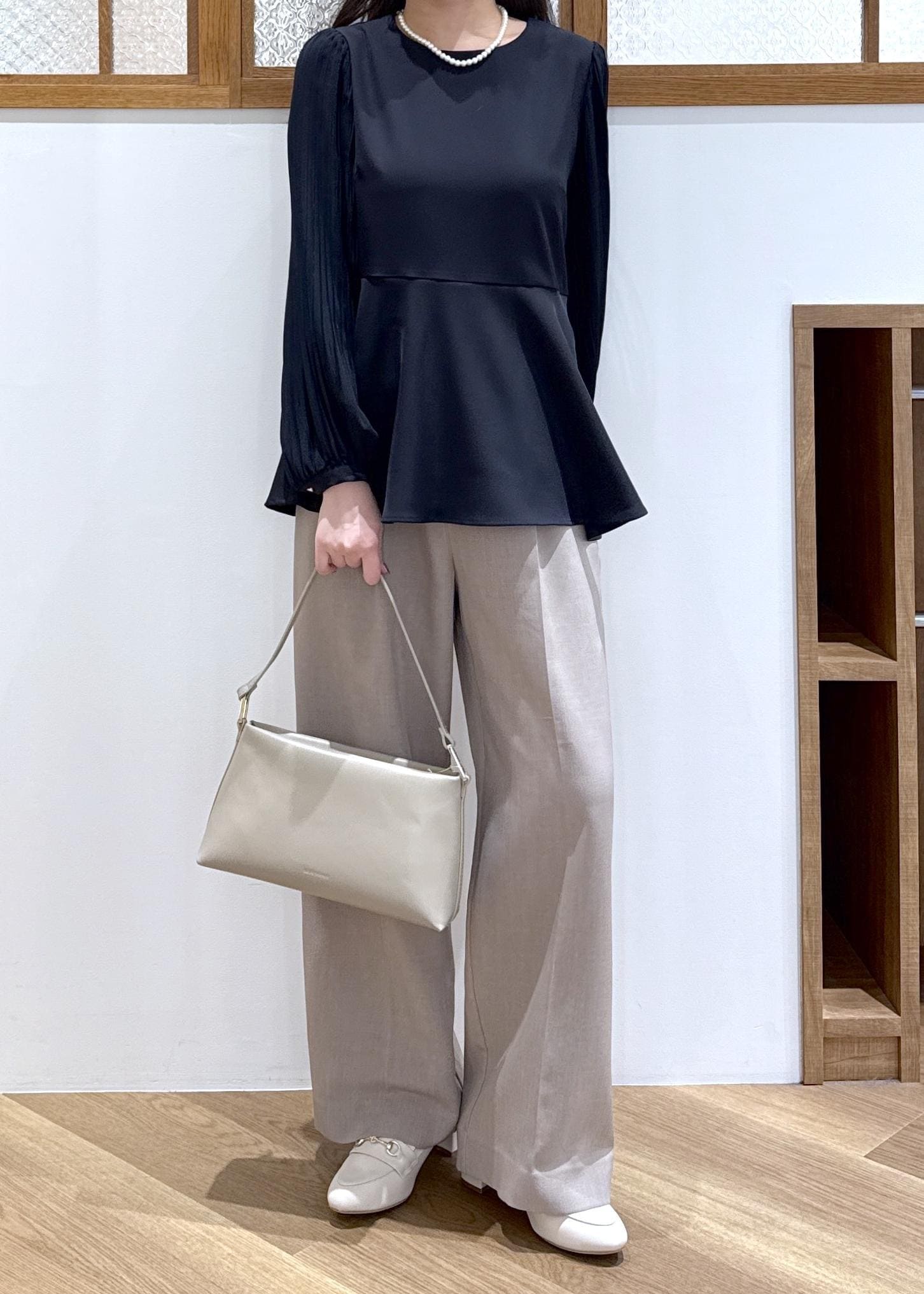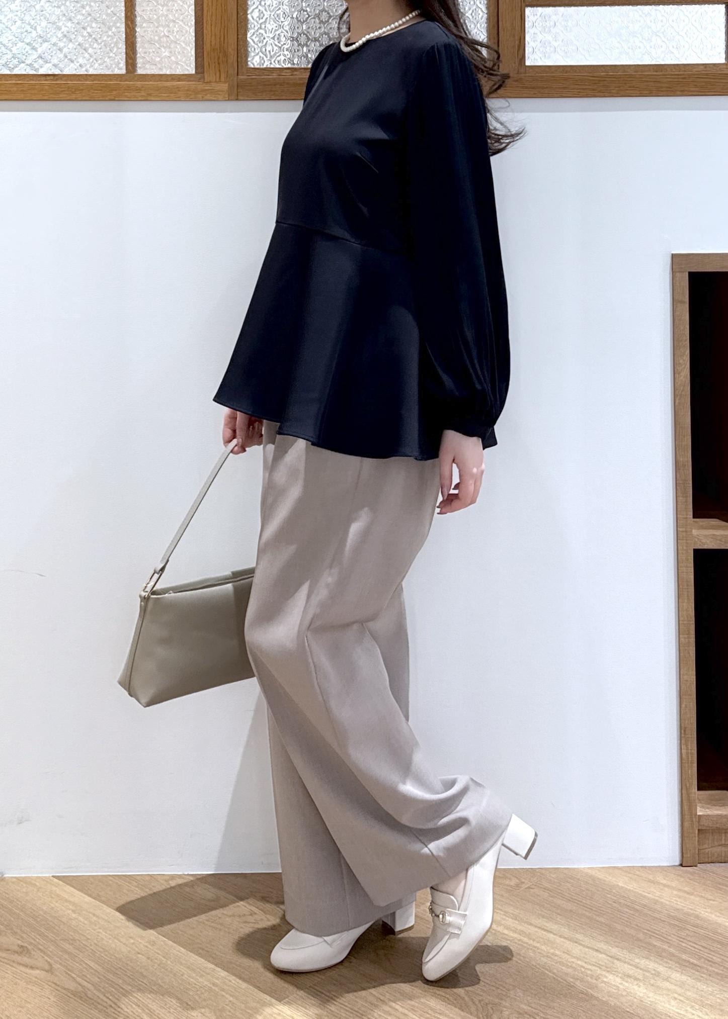 ネイビーのブラウスにベージュのパンツとバッグを合わせたシックな綺麗めコーデです。