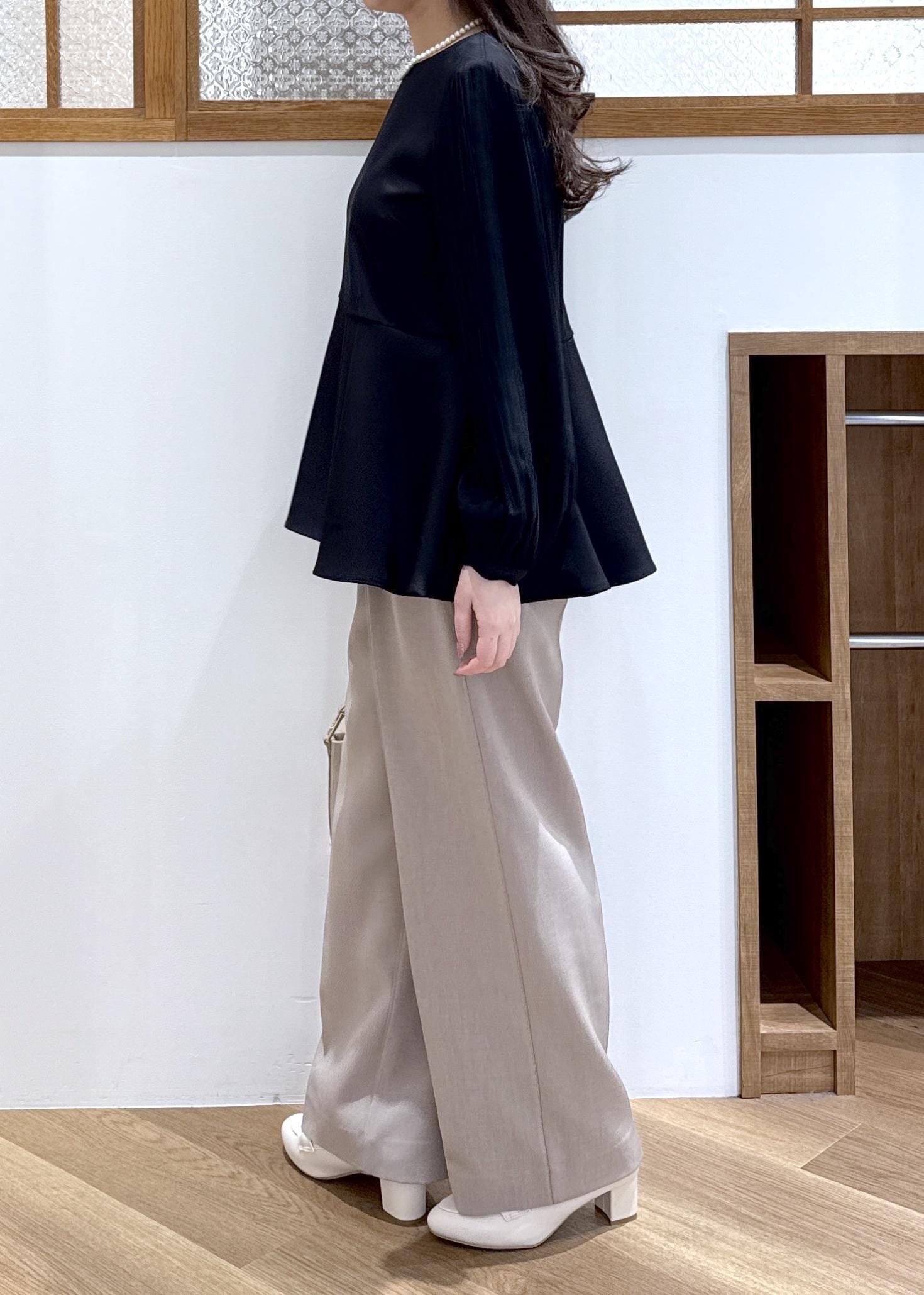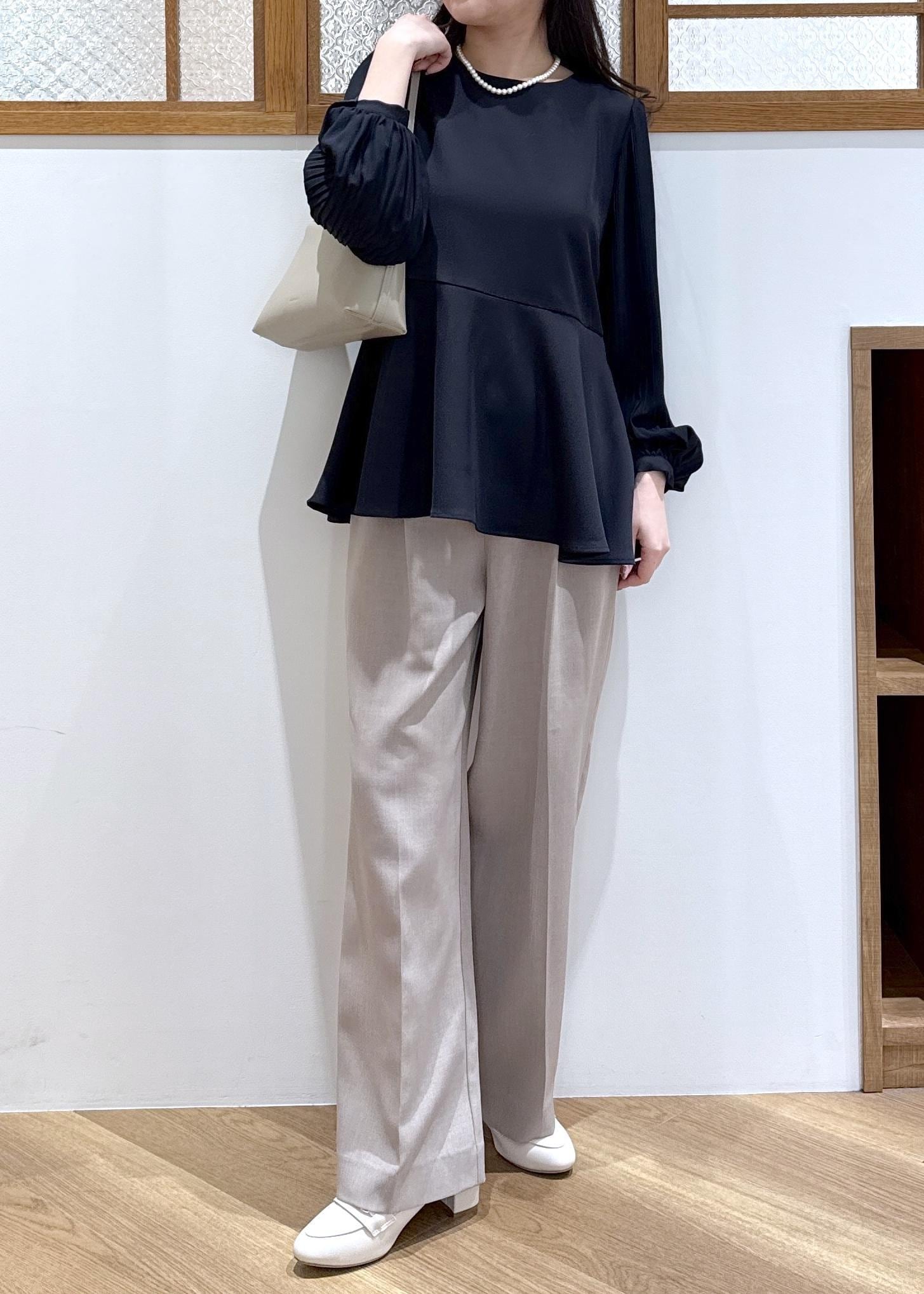 ペプラムの形が大人かわいいコーディネートに仕上がります。
