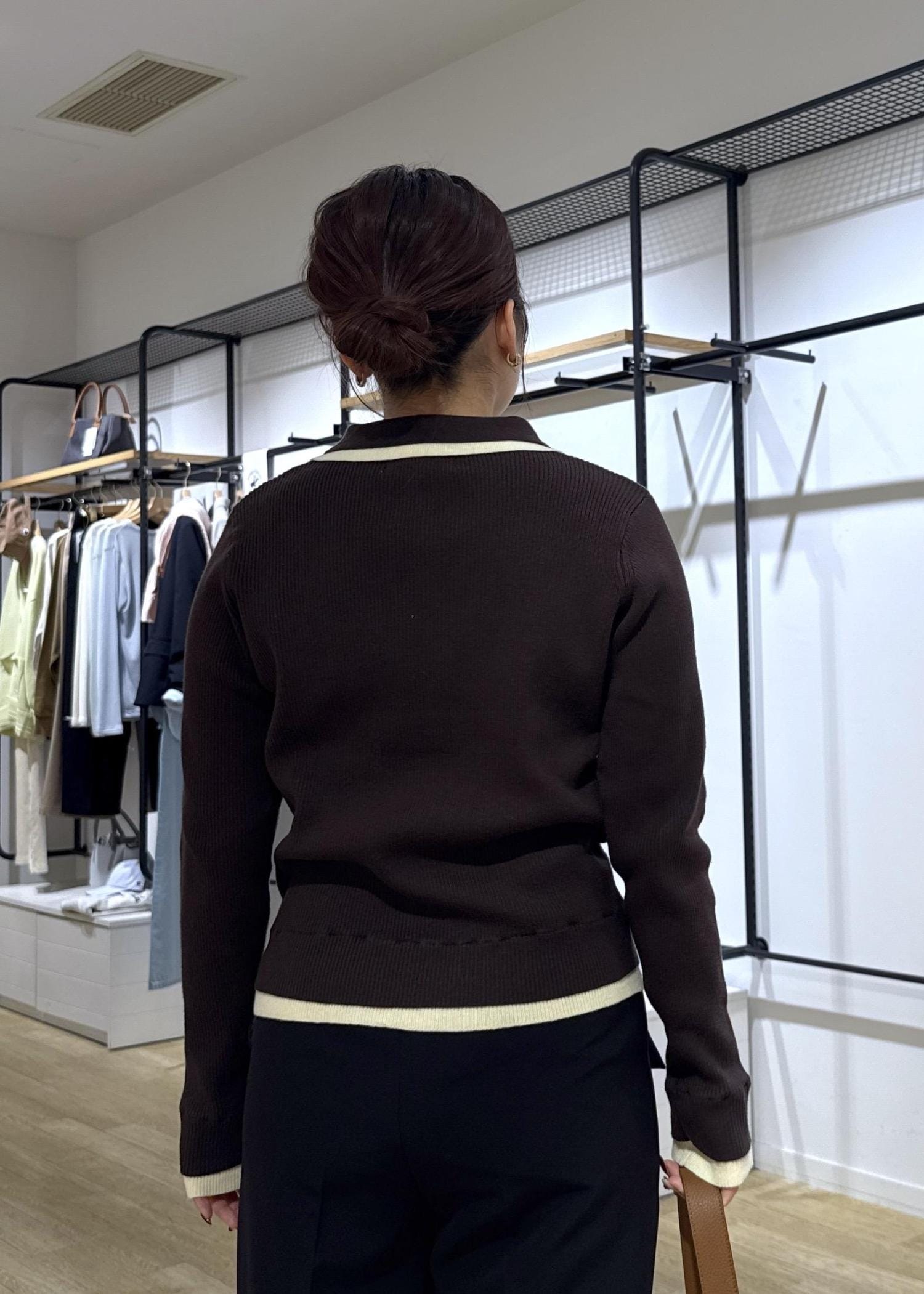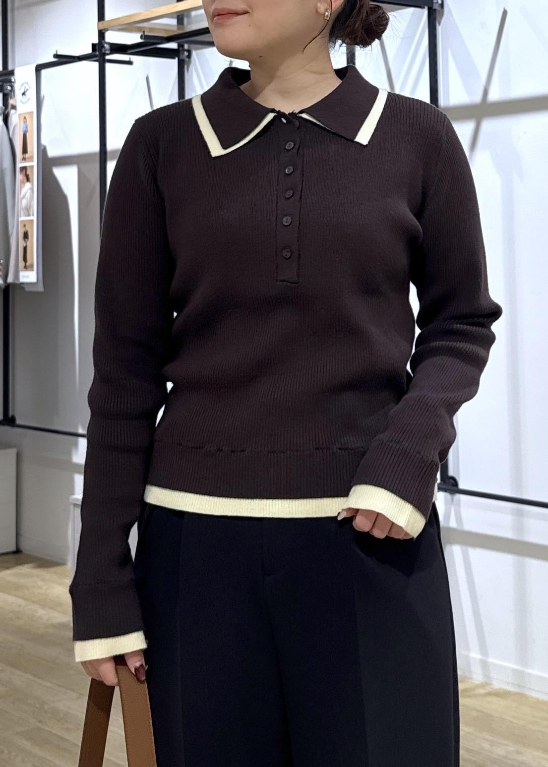 トップスはトレンド感のある配色レイヤードがポイントのポロニットで
