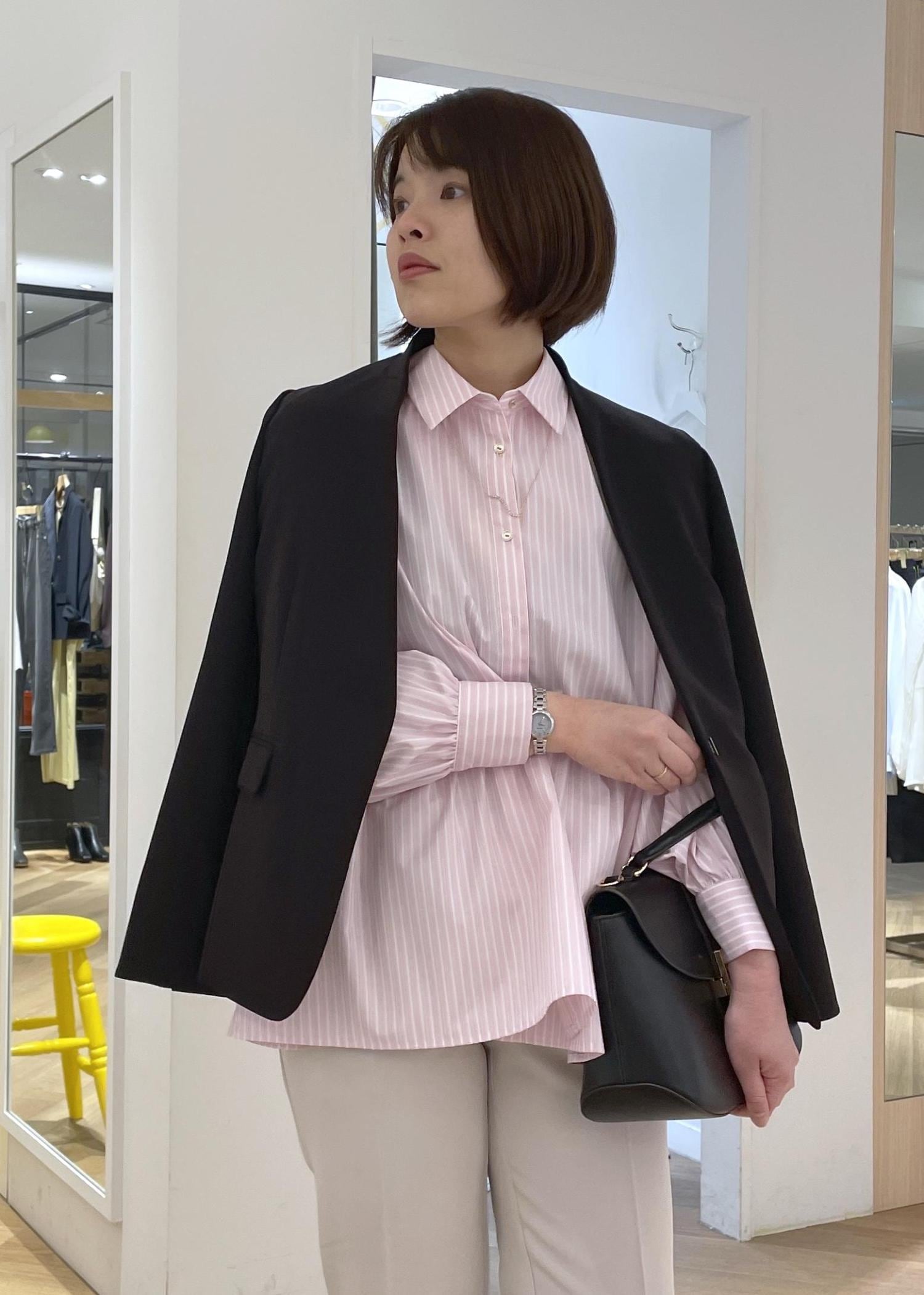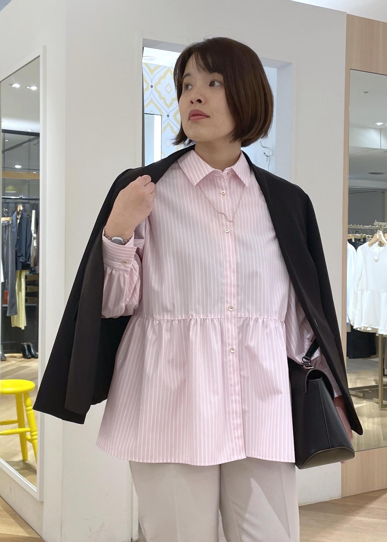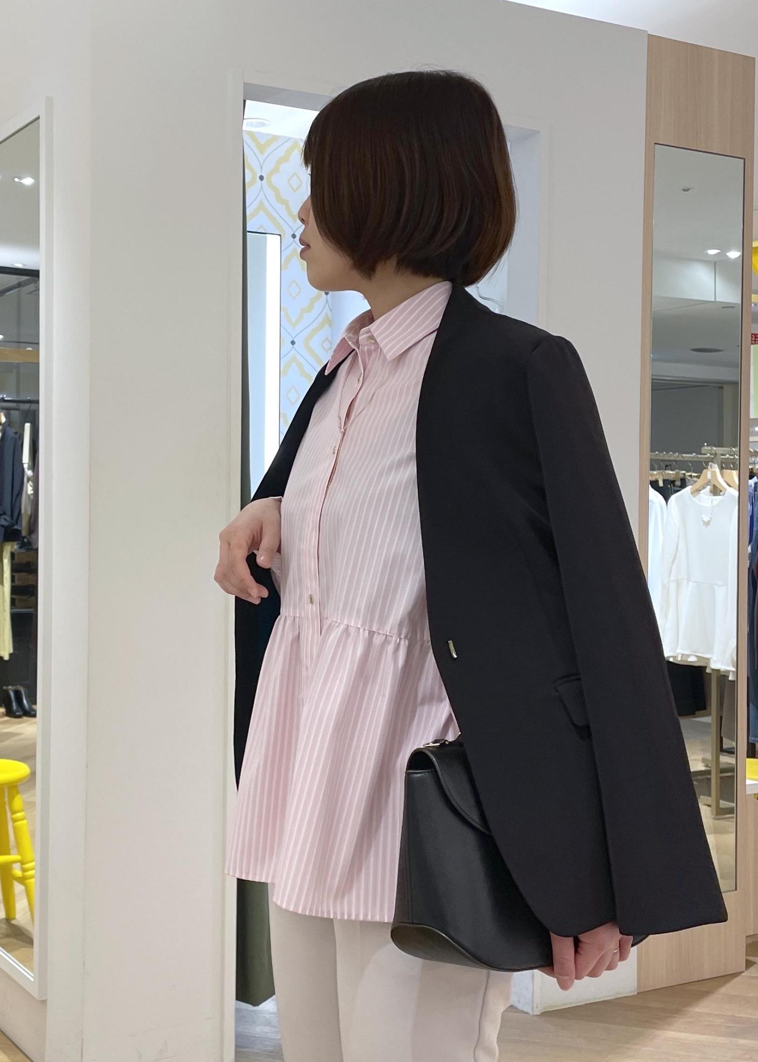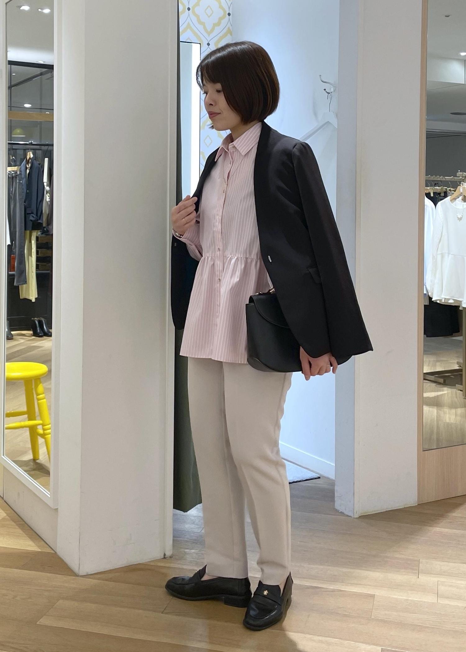 明るいグレーが爽やかなテーパードパンツにピンクのペプラムシャツを合わせたきれいめカジュアルコーデです!