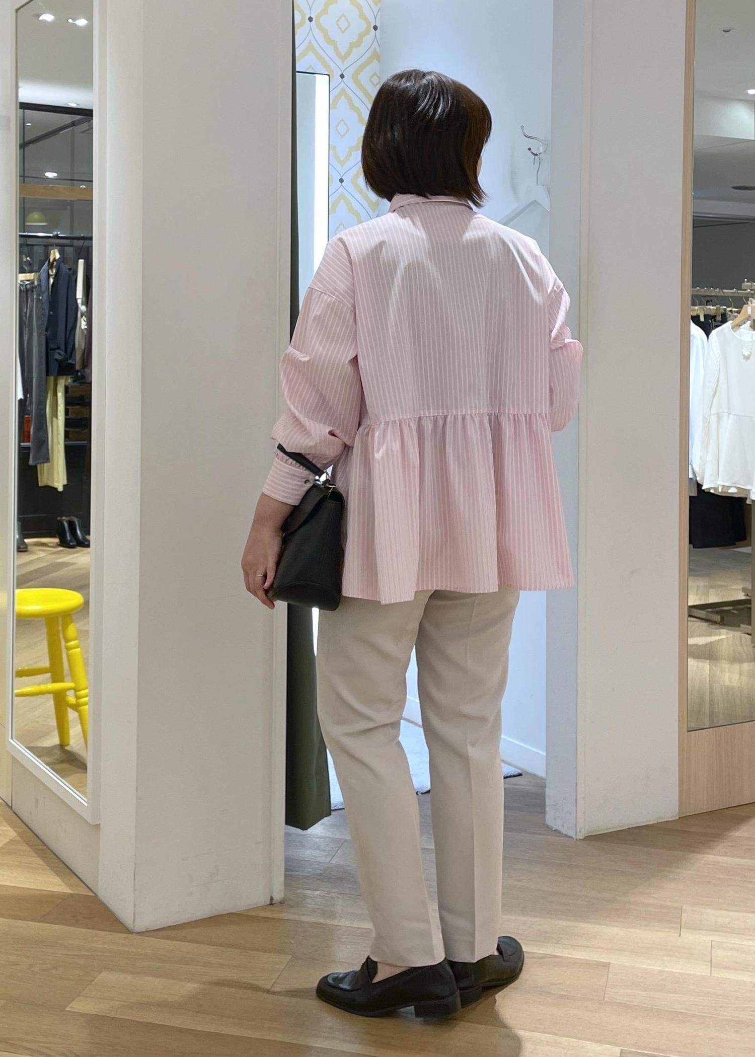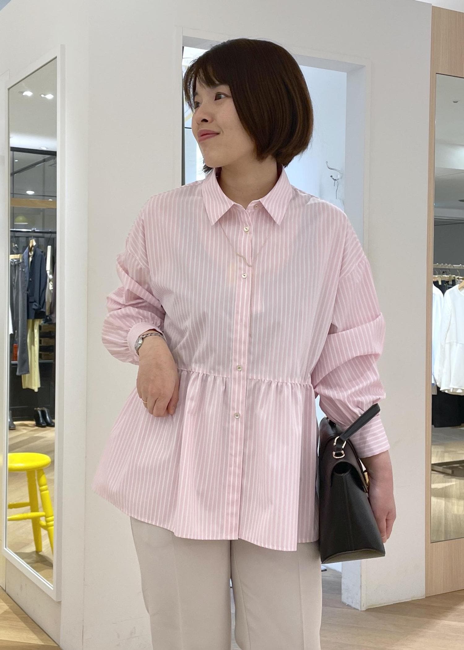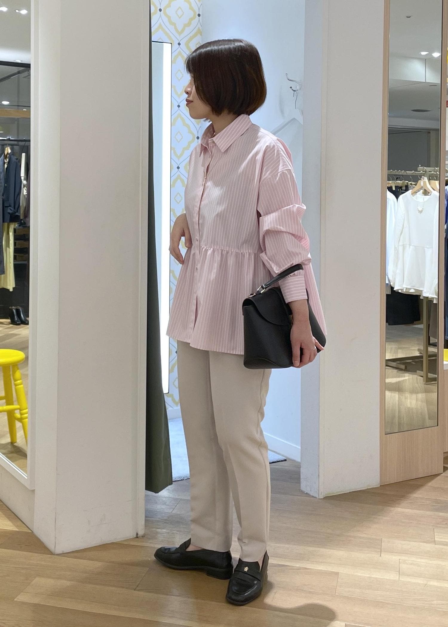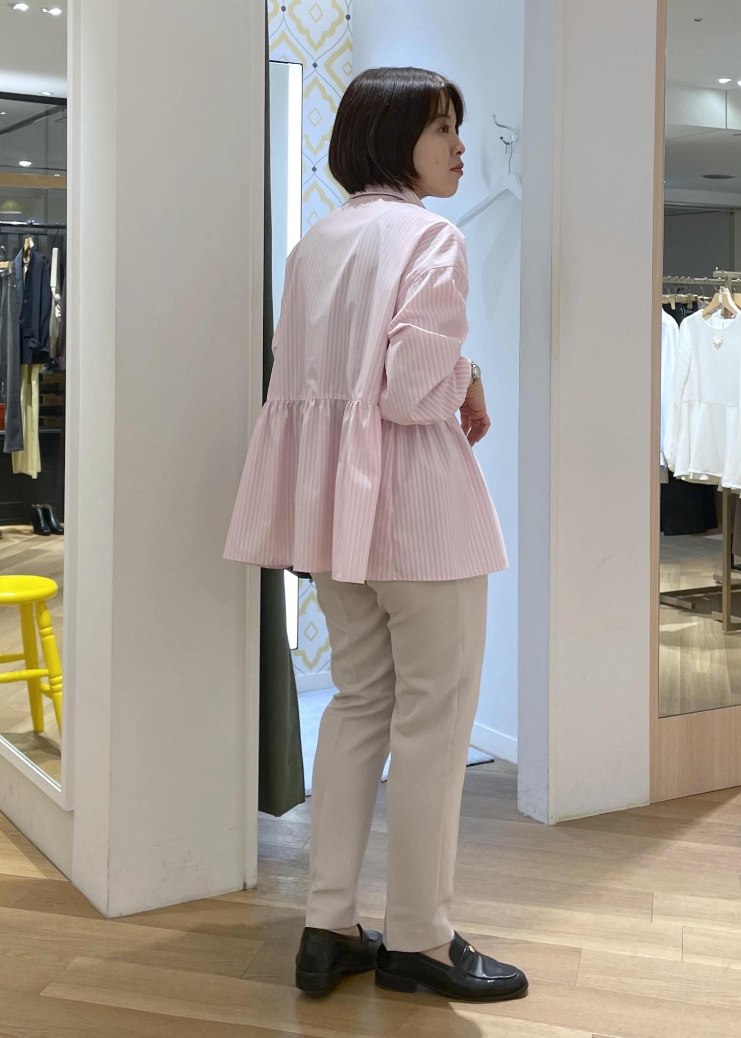 可愛らしいピンクのペプラムシャツにライトグレーのテーパードパンツを合わせた、きれいめカジュアルコーデです!