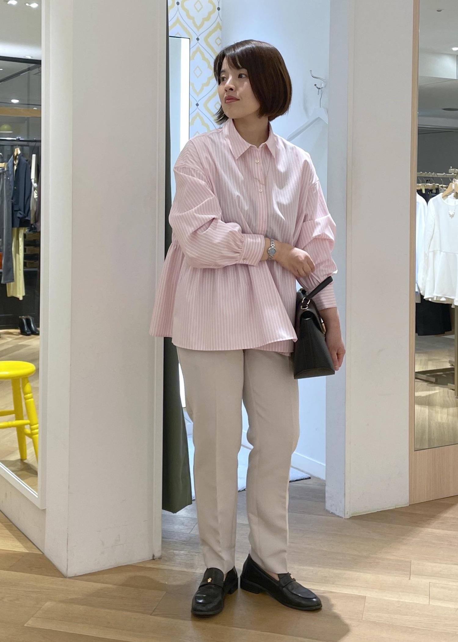 淡いカラーの合わせだったので、バッグとシューズは黒を合わせてメリハリのあるコーデに◎