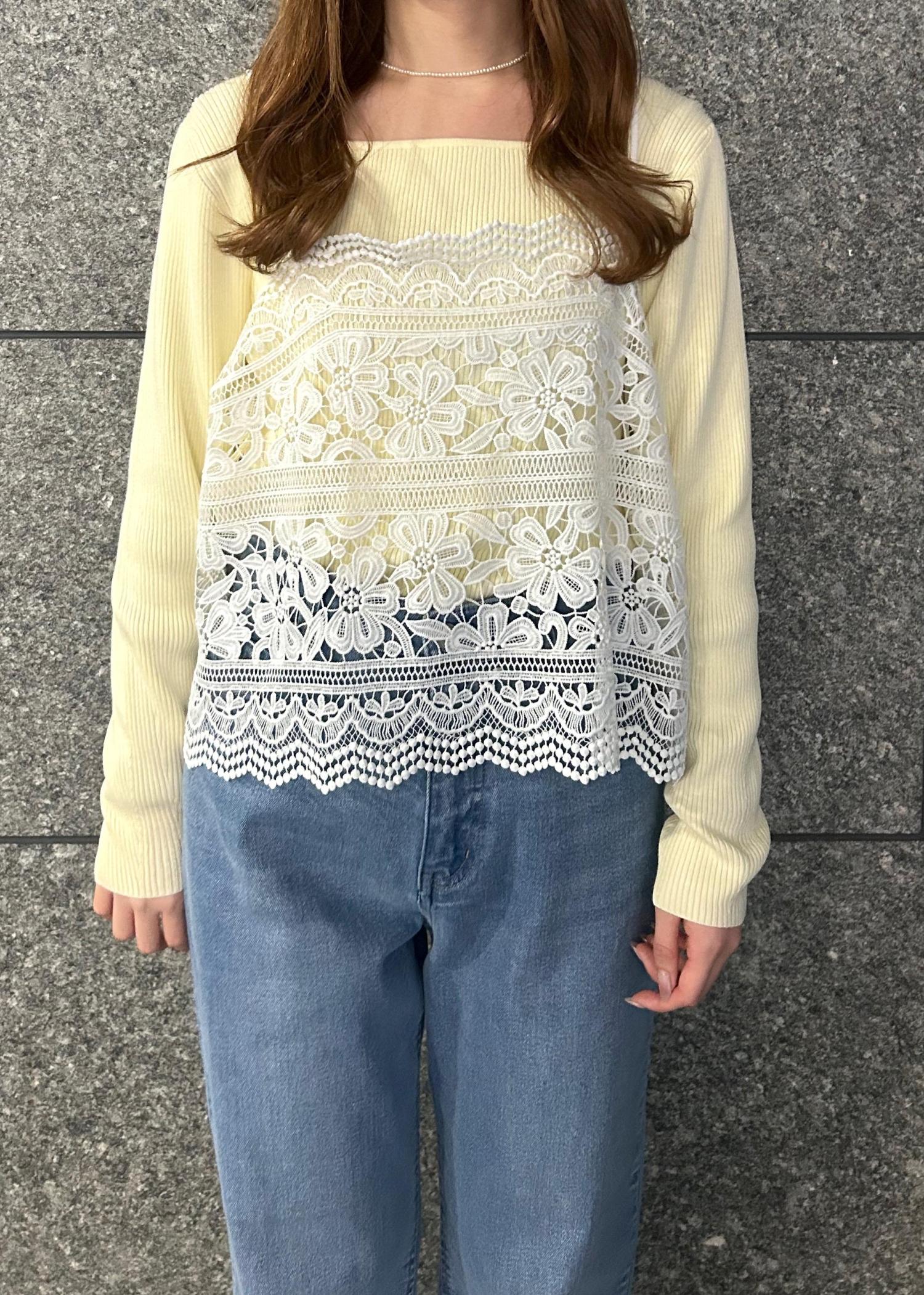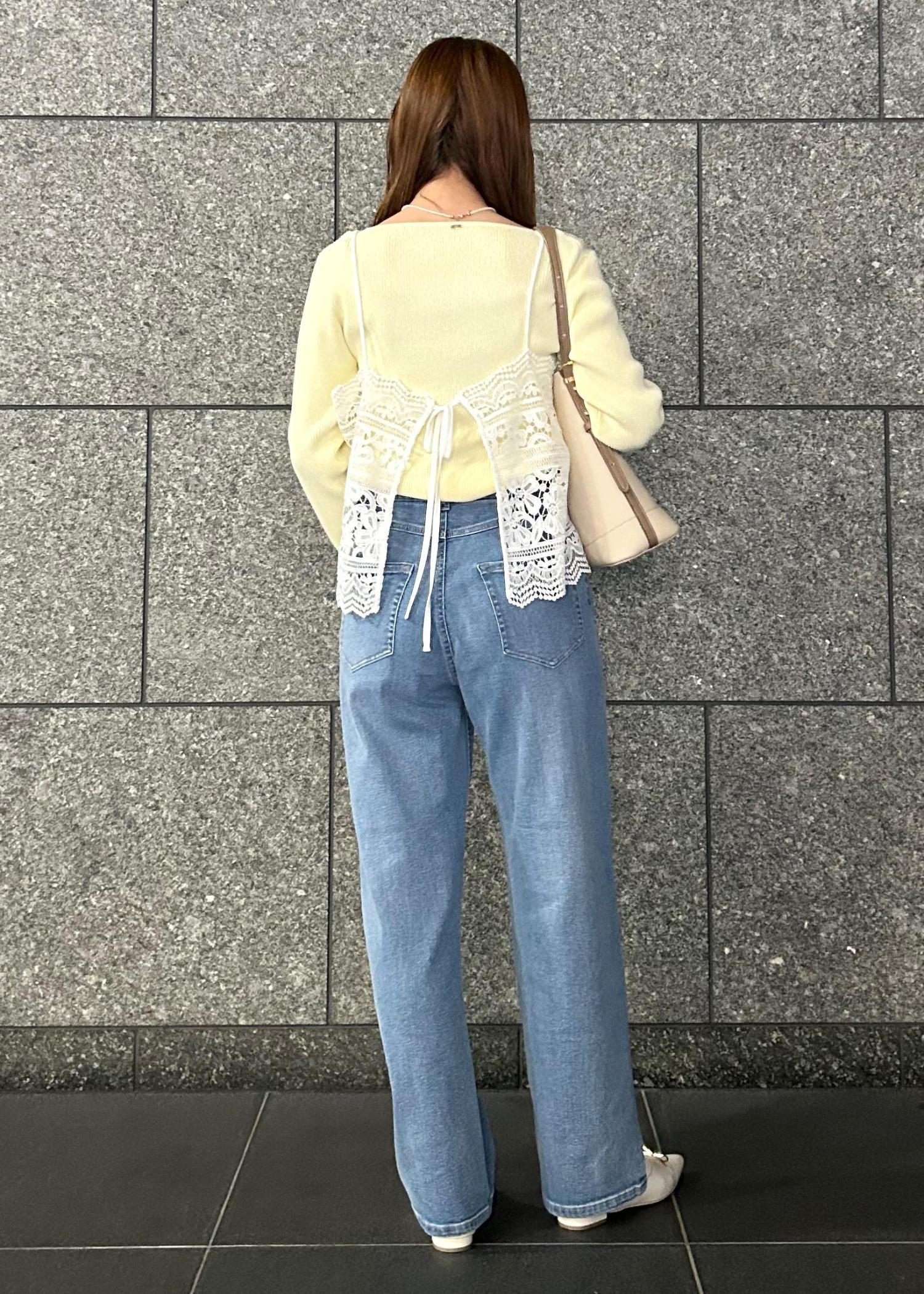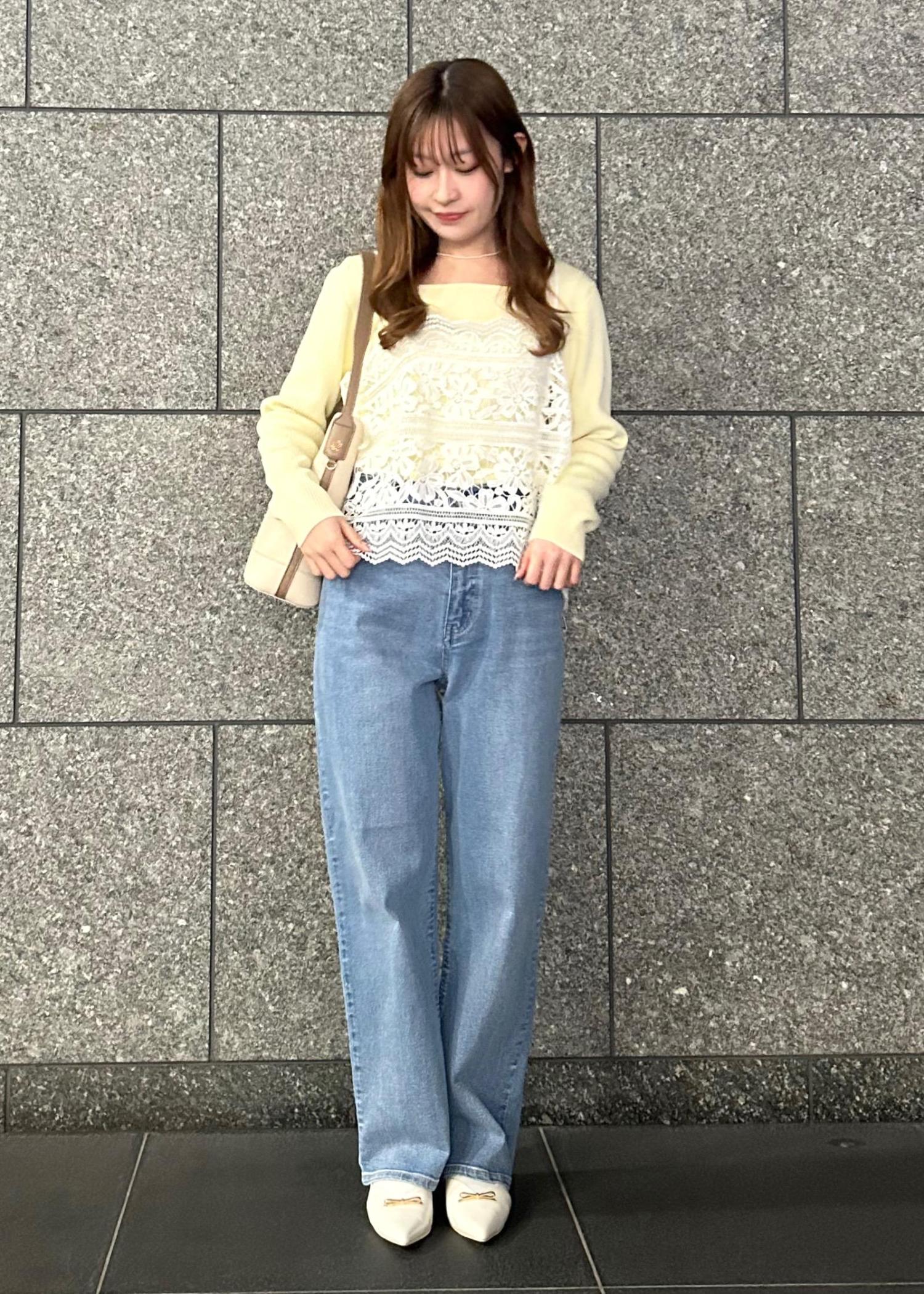 イエローのニットと明るい水色のデニムパンツで春らしいコーデに仕上げました!カジュアルになりすぎないようにレースのビスチェで可愛さもプラスしました!