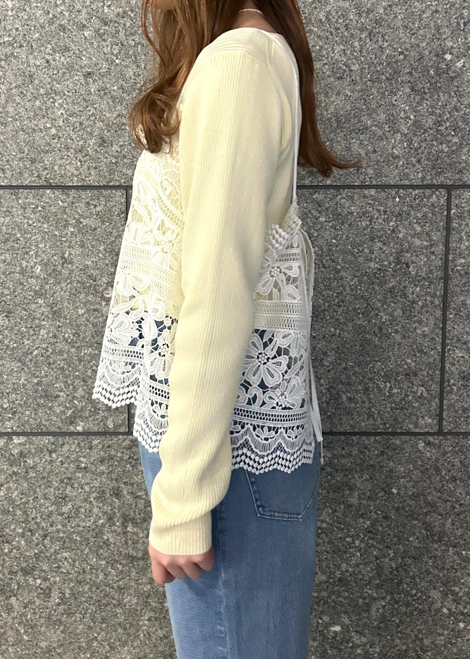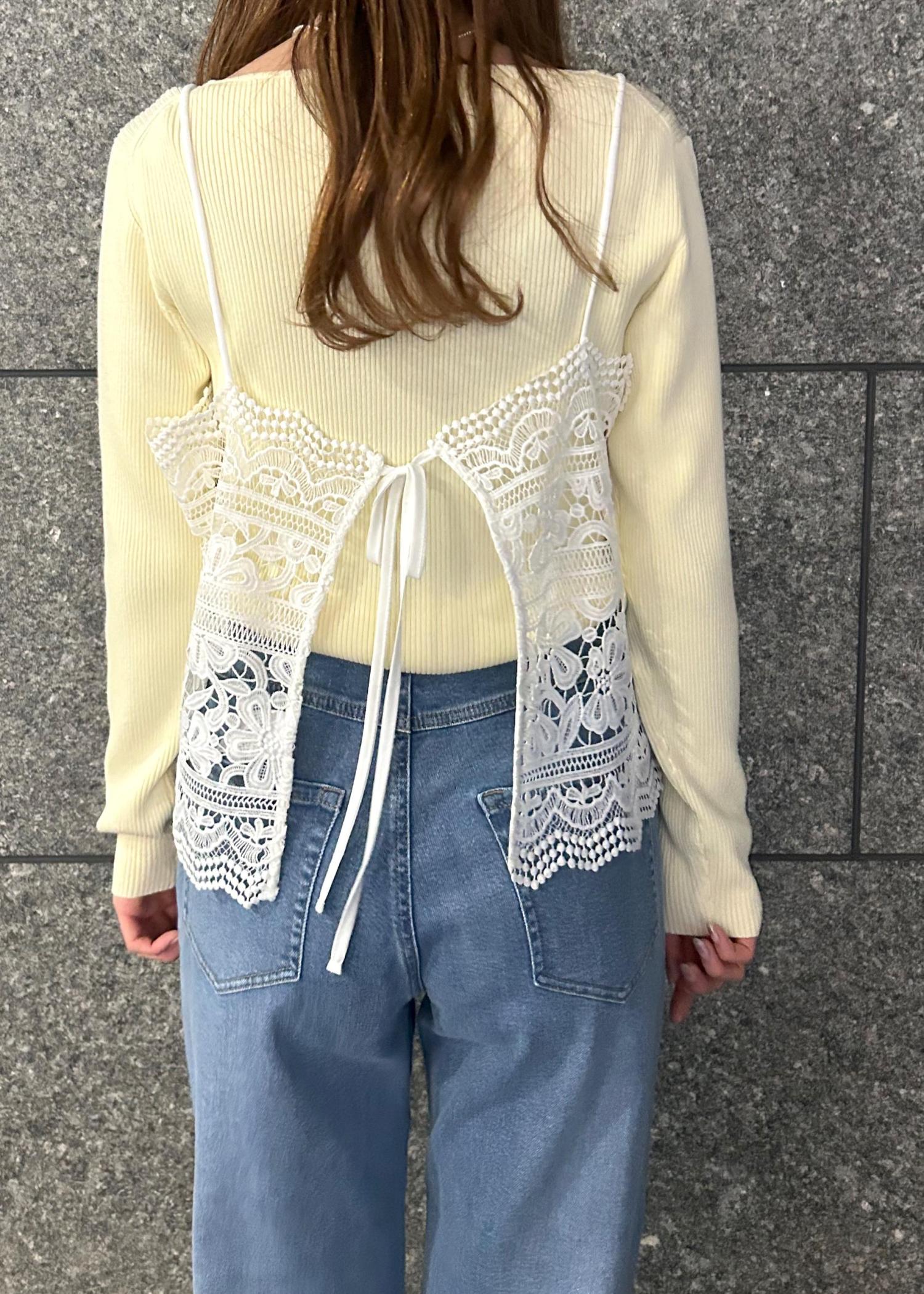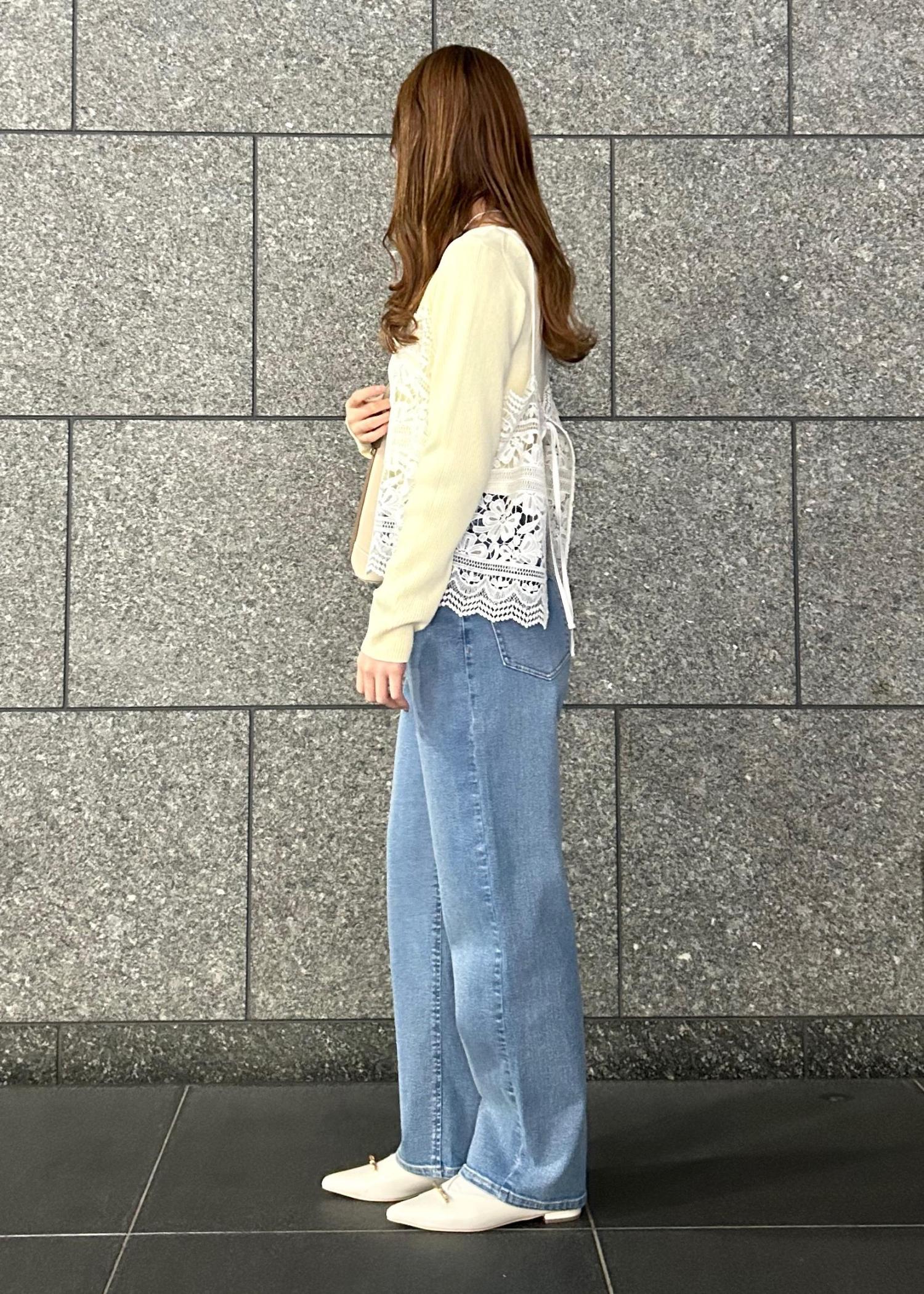 イエローのニットと明るい水色のデニムパンツで春らしいコーデに仕上げました!カジュアルになりすぎないようにレースのビスチェで可愛さもプラスしました!