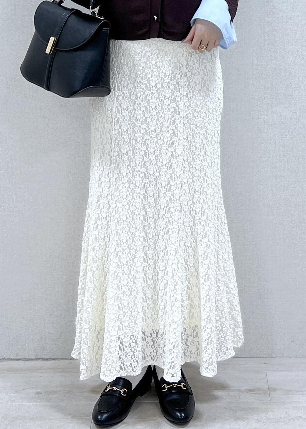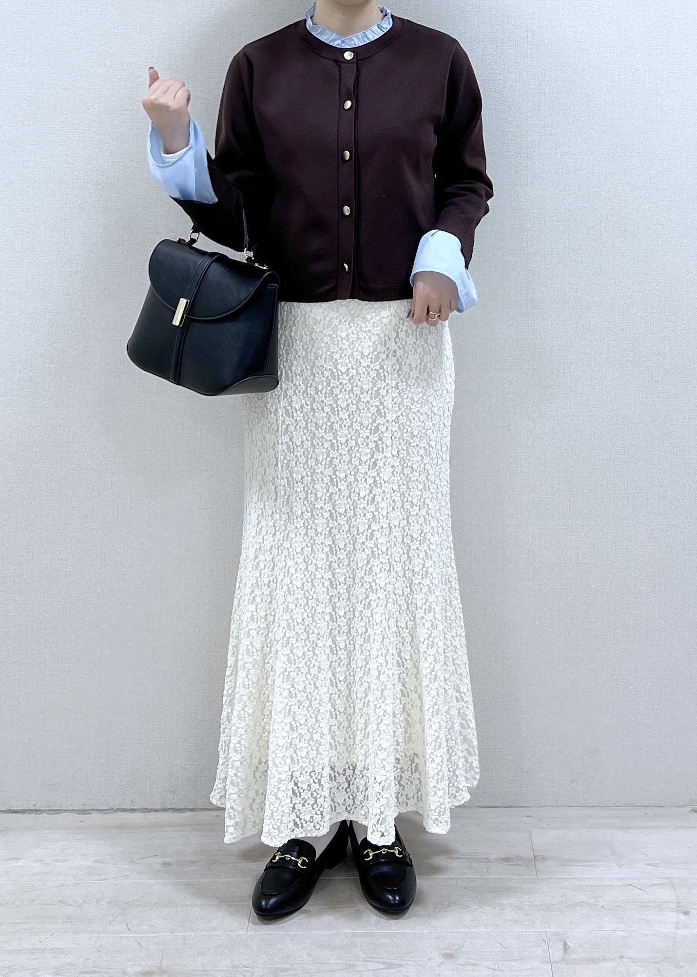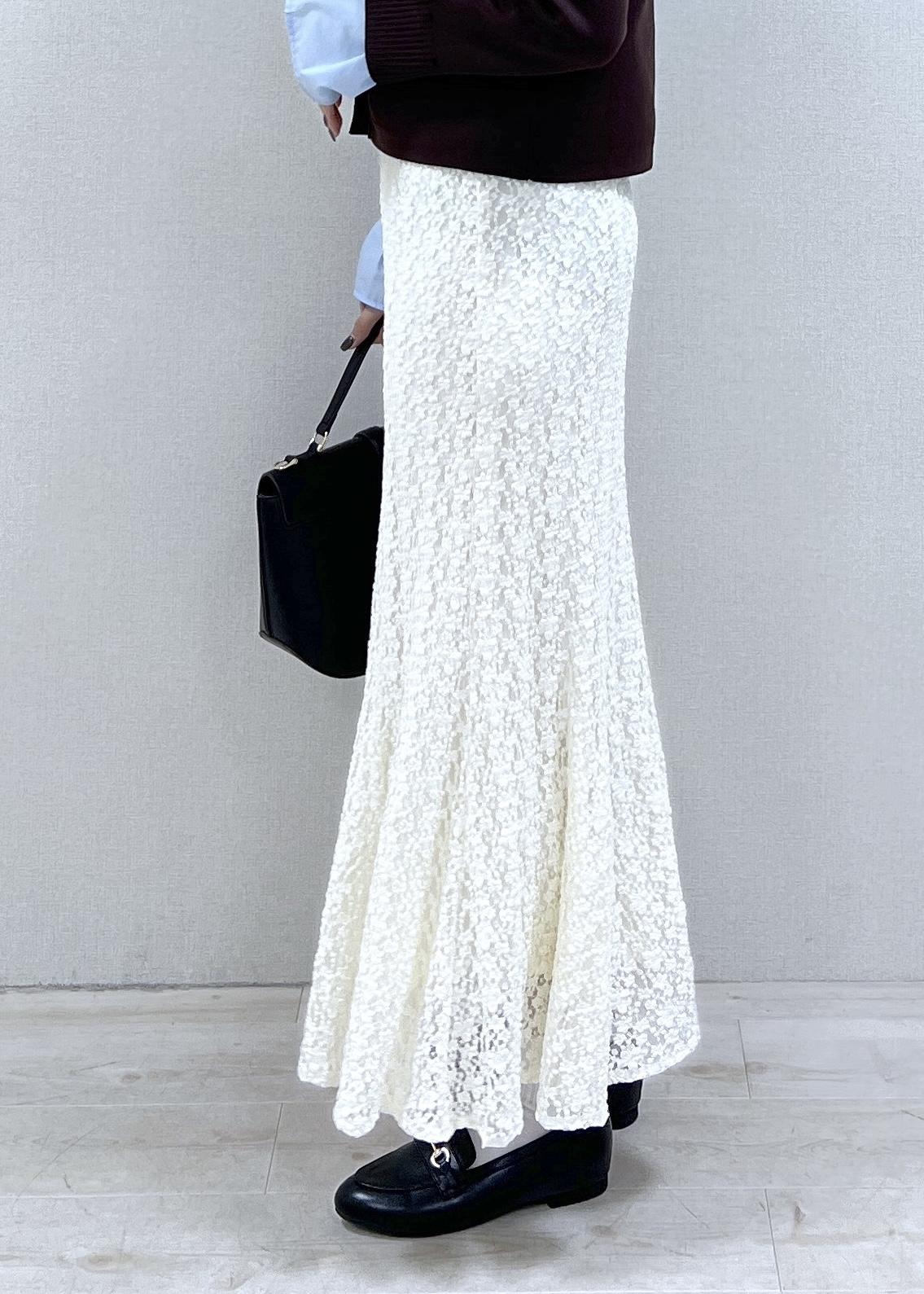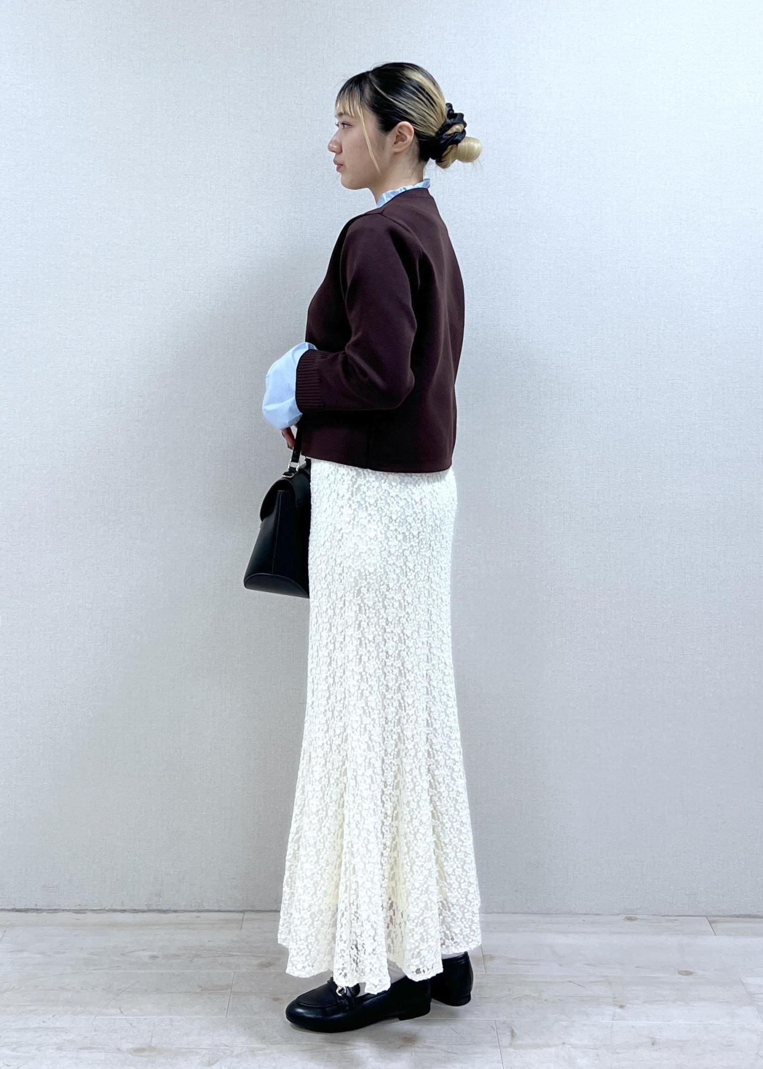 白のマーメイドスカートを合わせることで女性らしさがプラスされます。