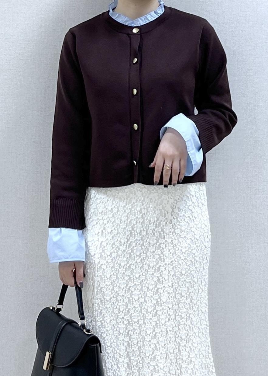 ブラウンのカーディガンで落ち着きのある大人の印象にしました◎