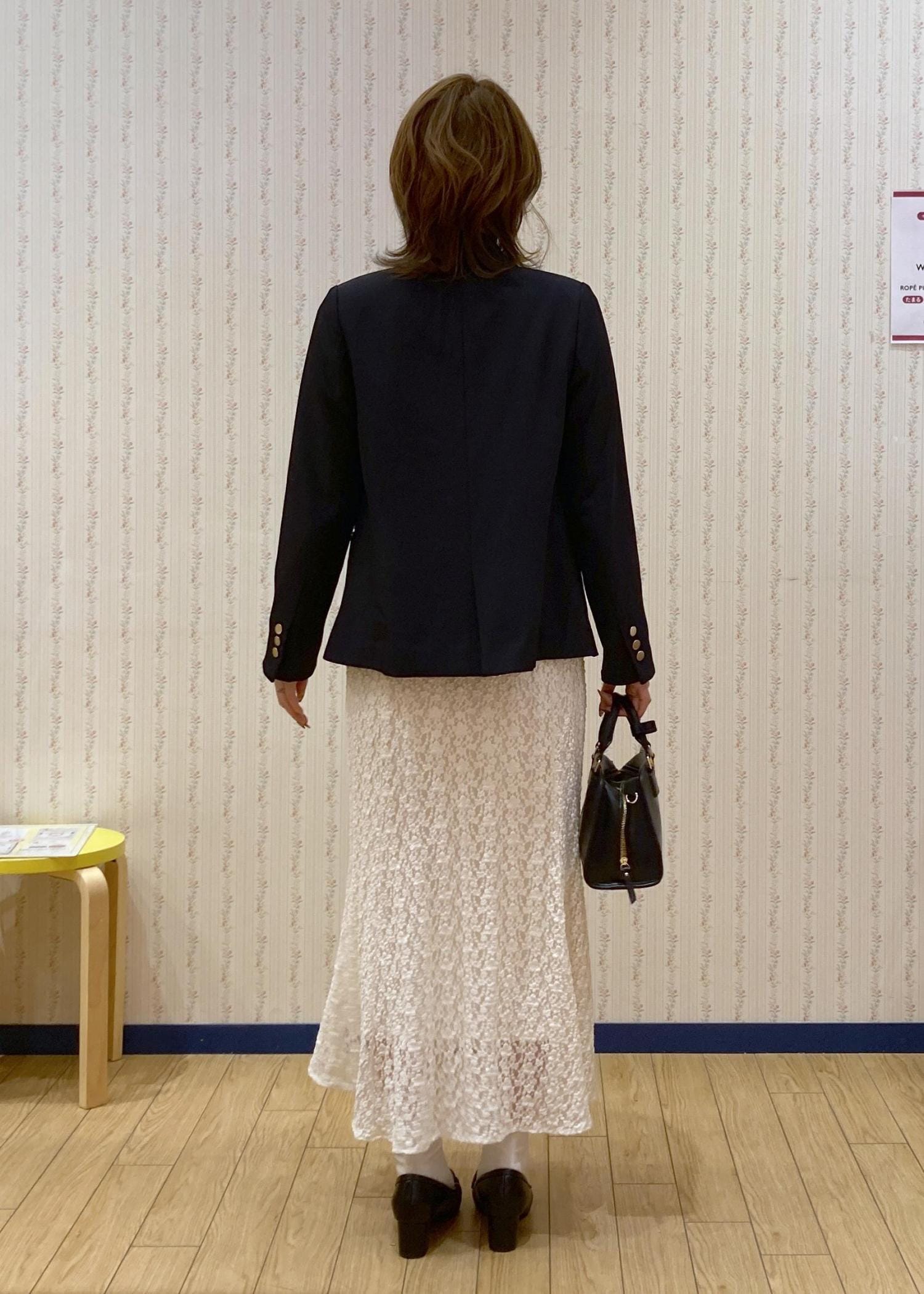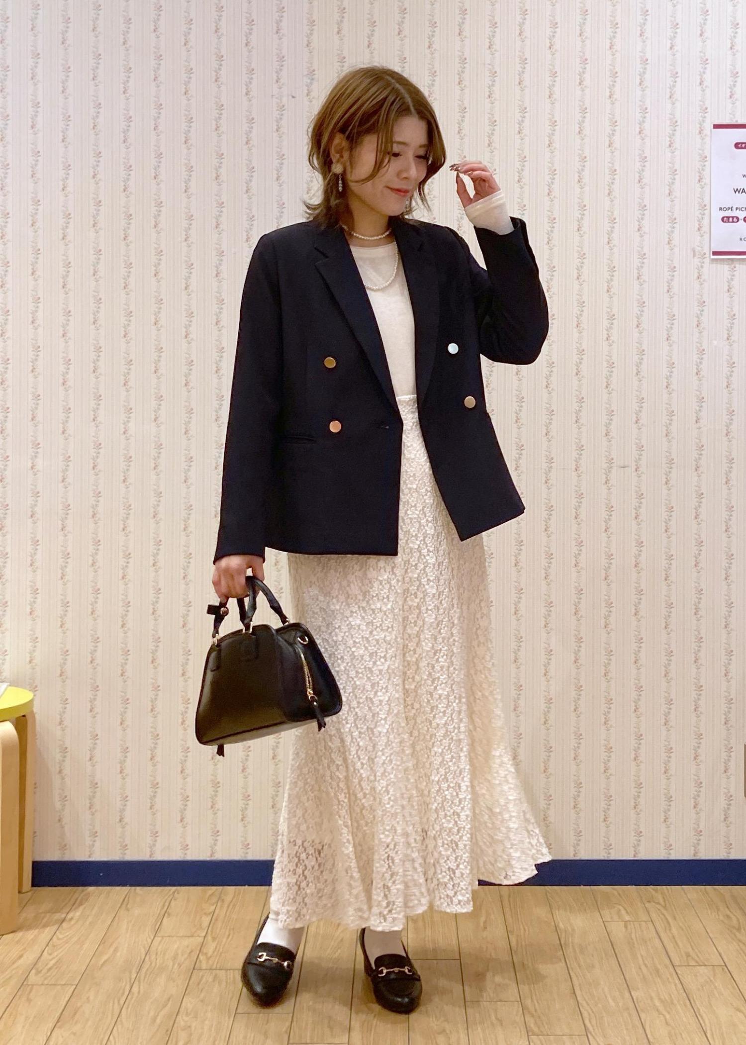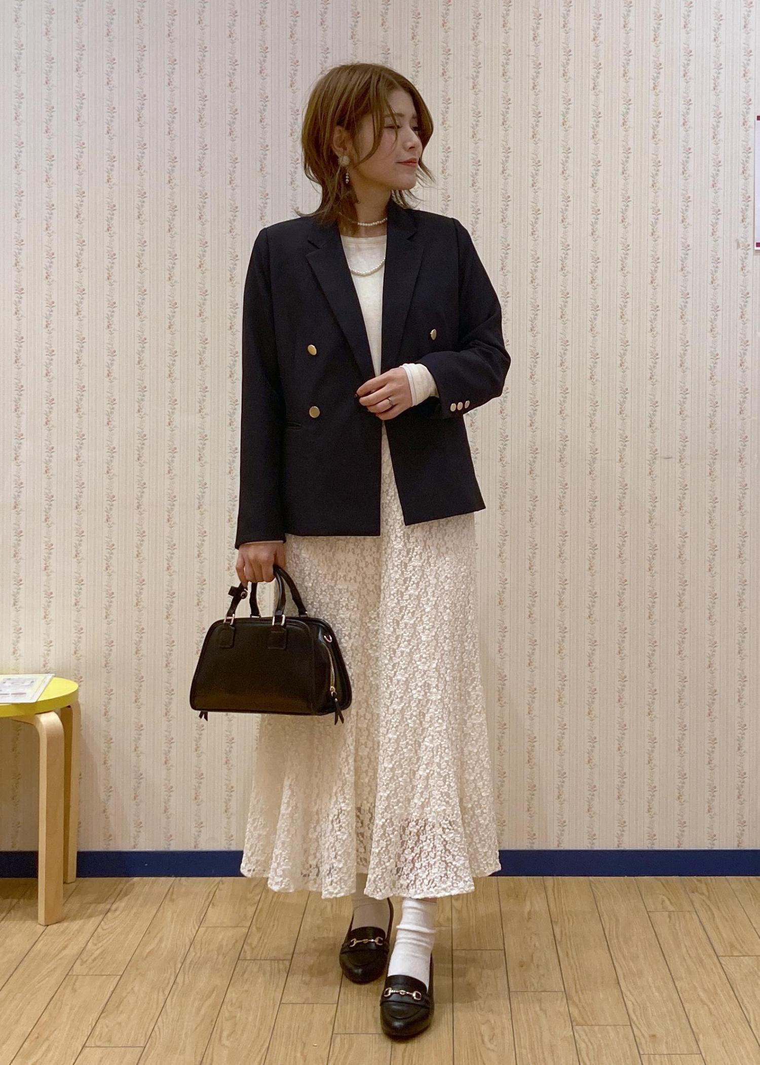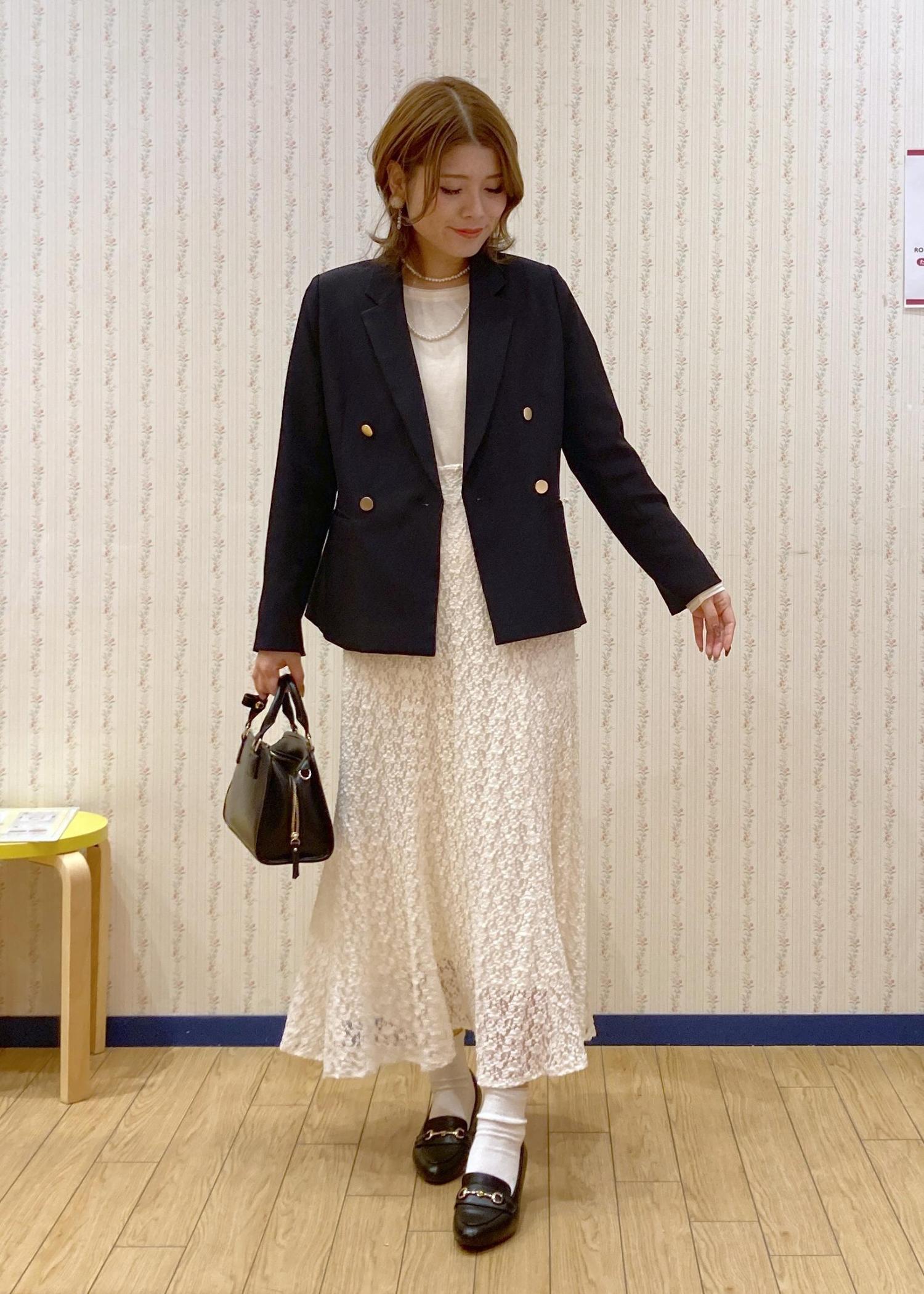 フェミニンなレースマーメイドスカートにネイビージャケットを羽織った大人っぽいフェミニンコーディネートです。