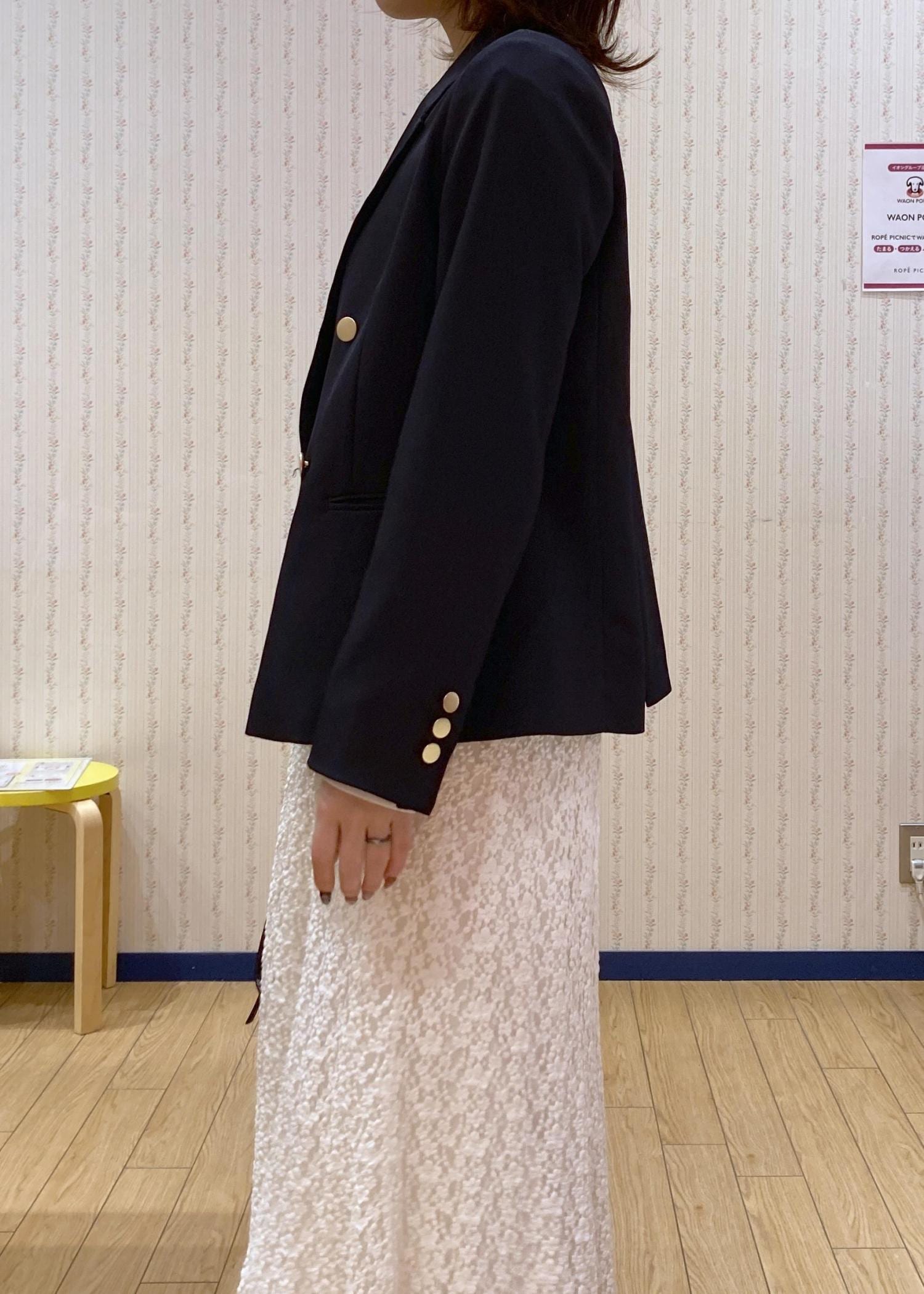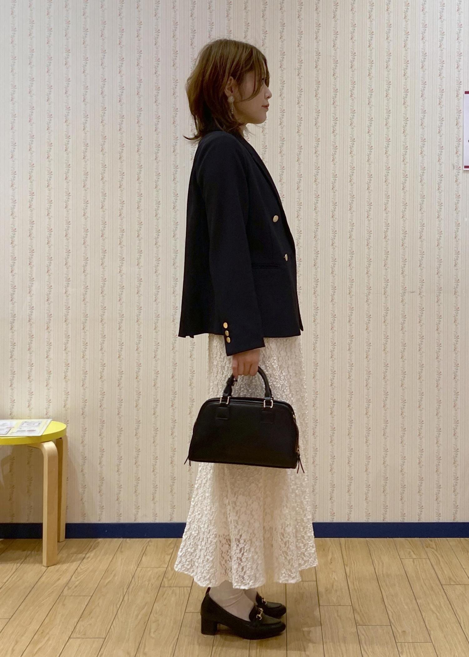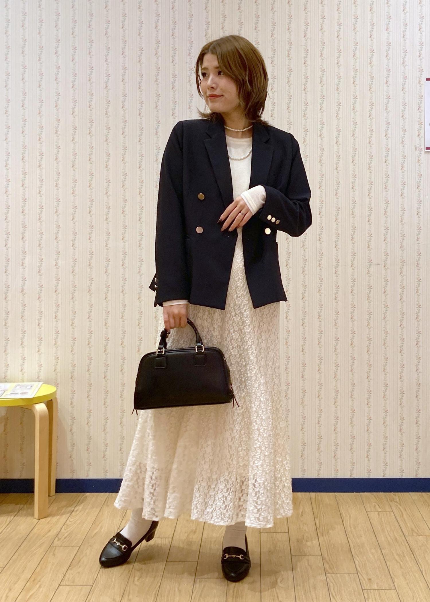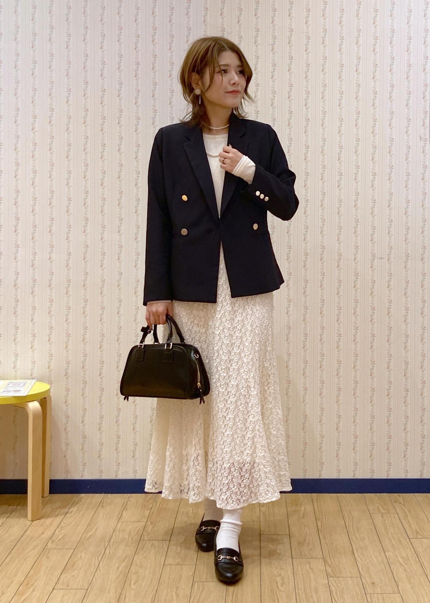 フェミニンなレースマーメイドスカートにネイビージャケットを羽織った大人っぽいフェミニンコーディネートです。