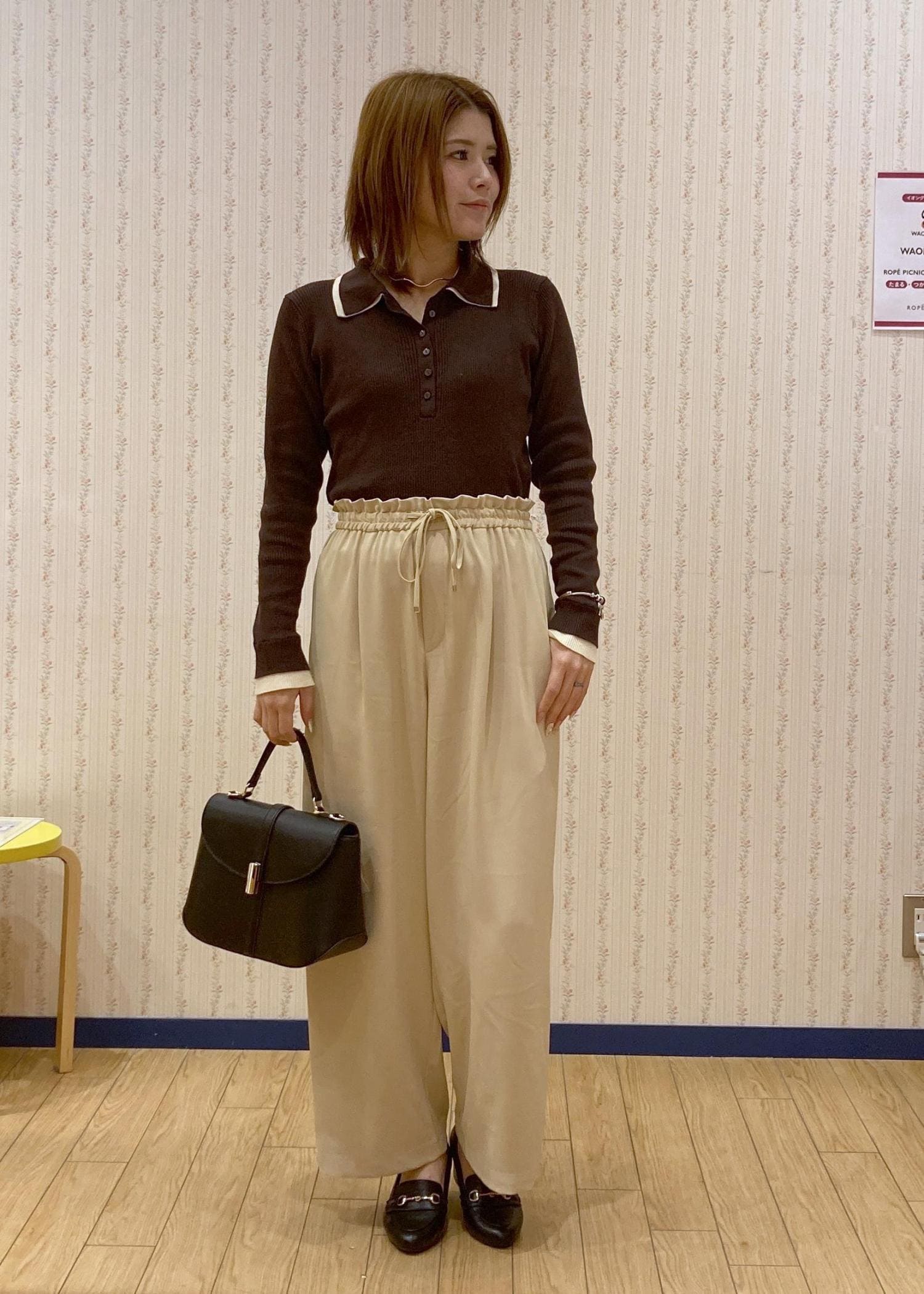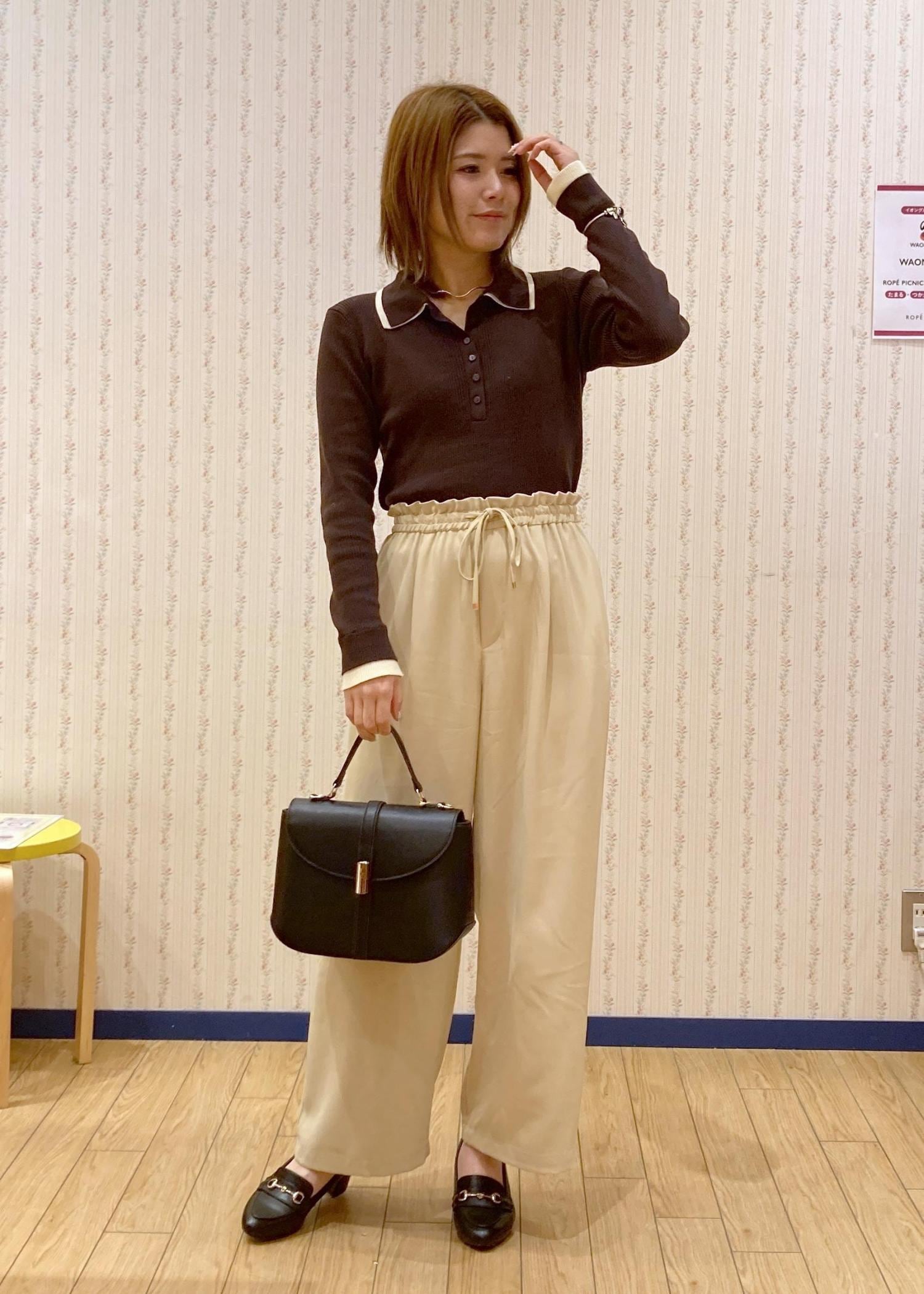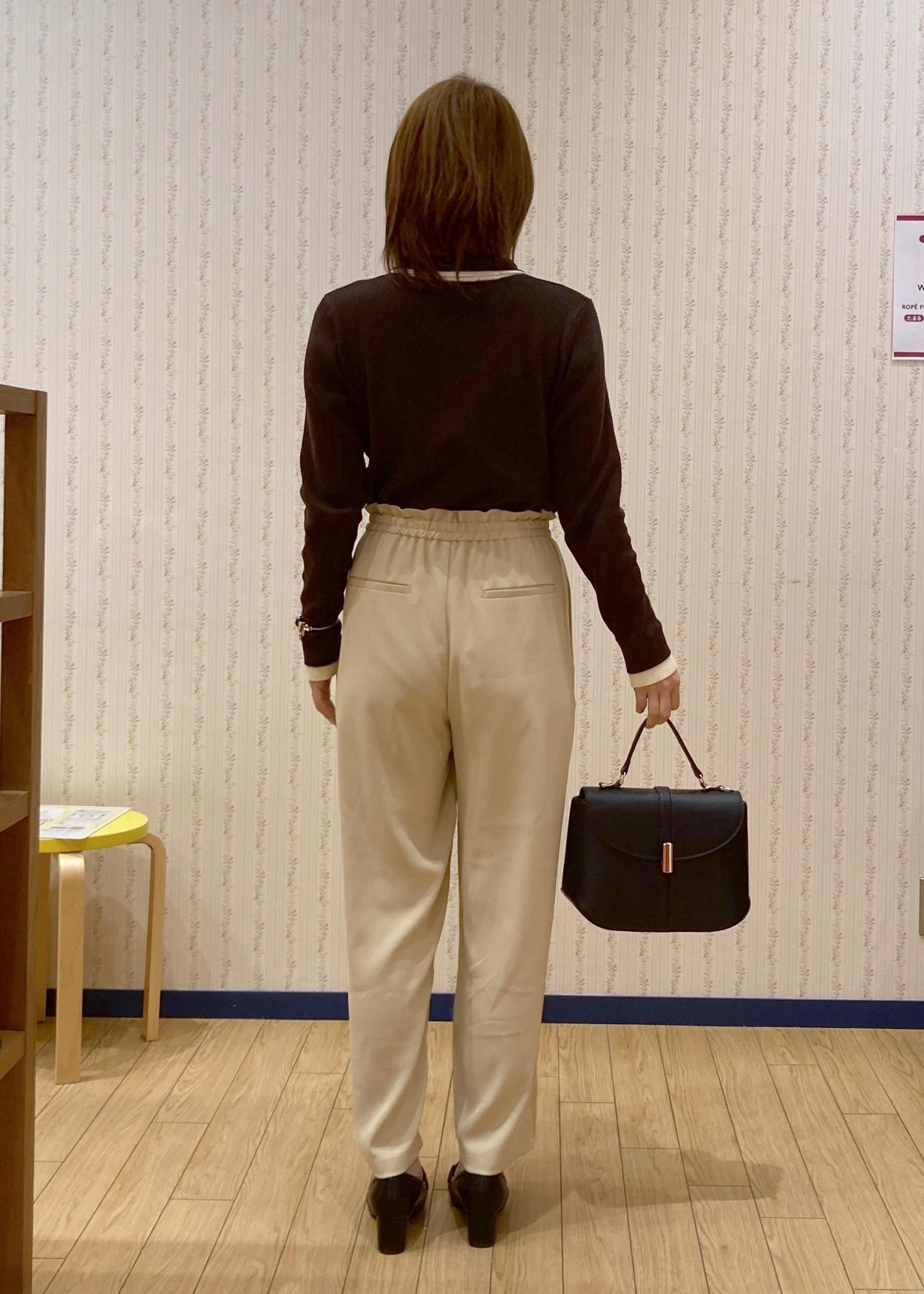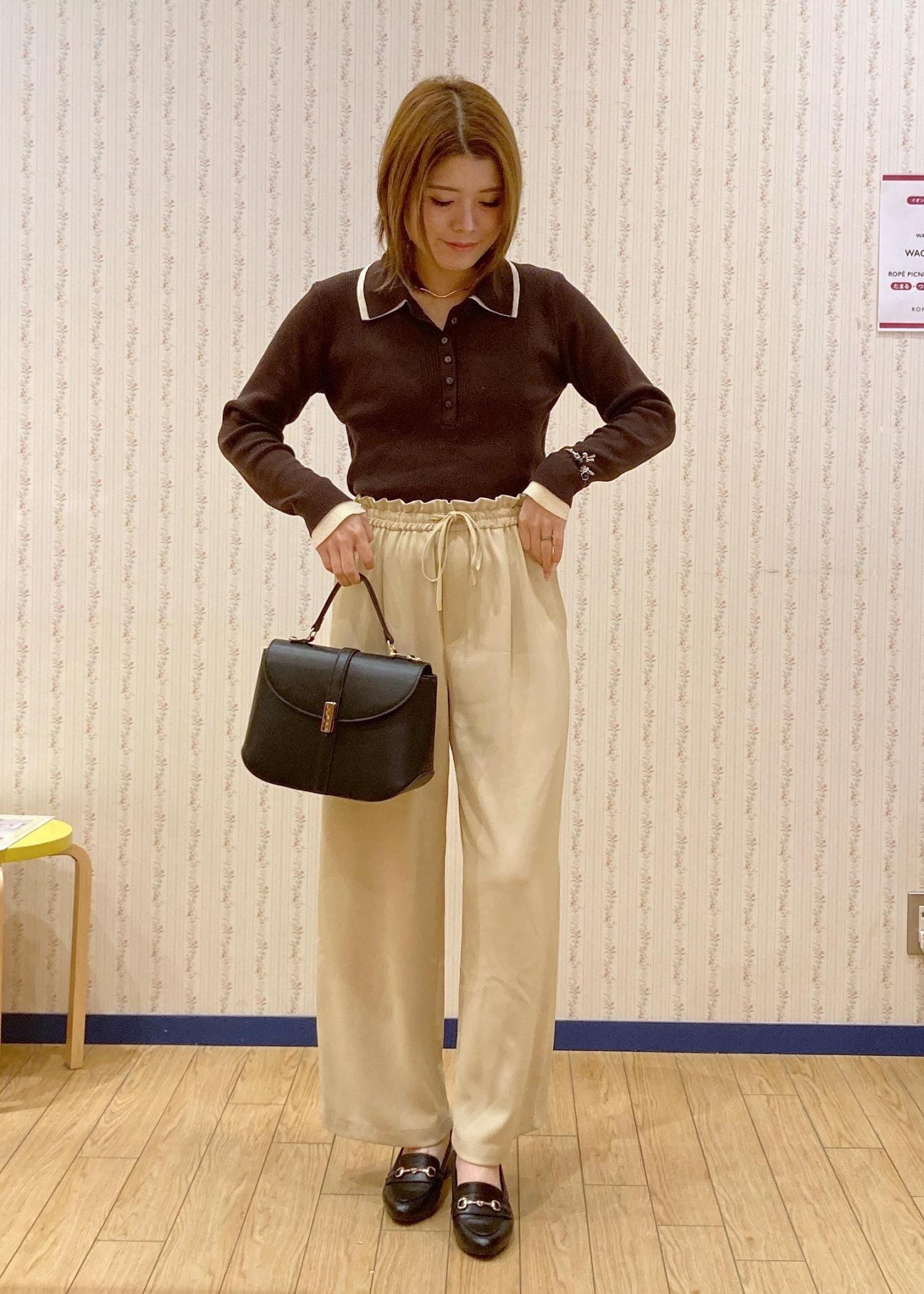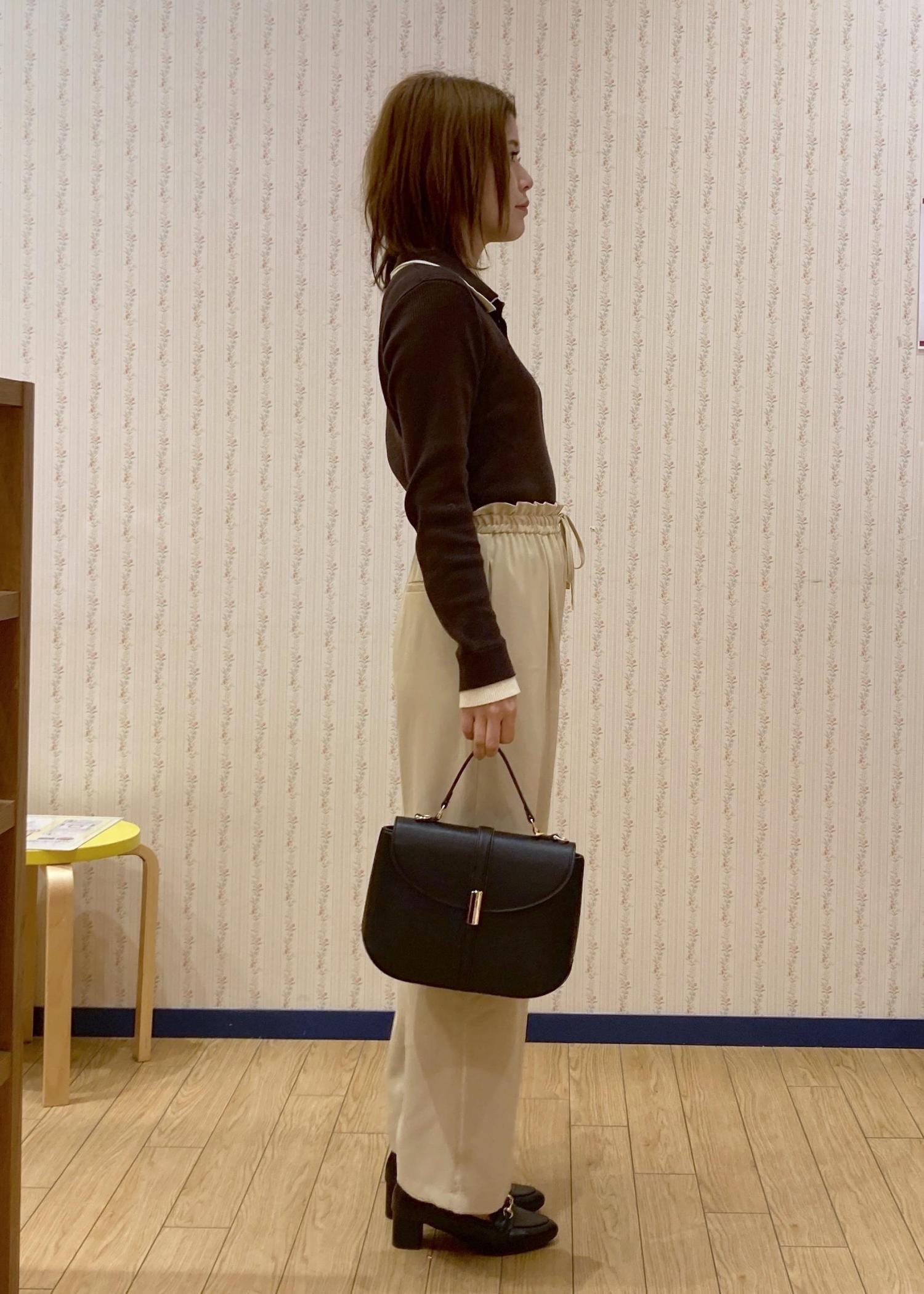 イエローのパンツを主役にブラウンとブラックでまとめて大人っぽさもありつつ春っぽさも取り入れたのがポイントです。