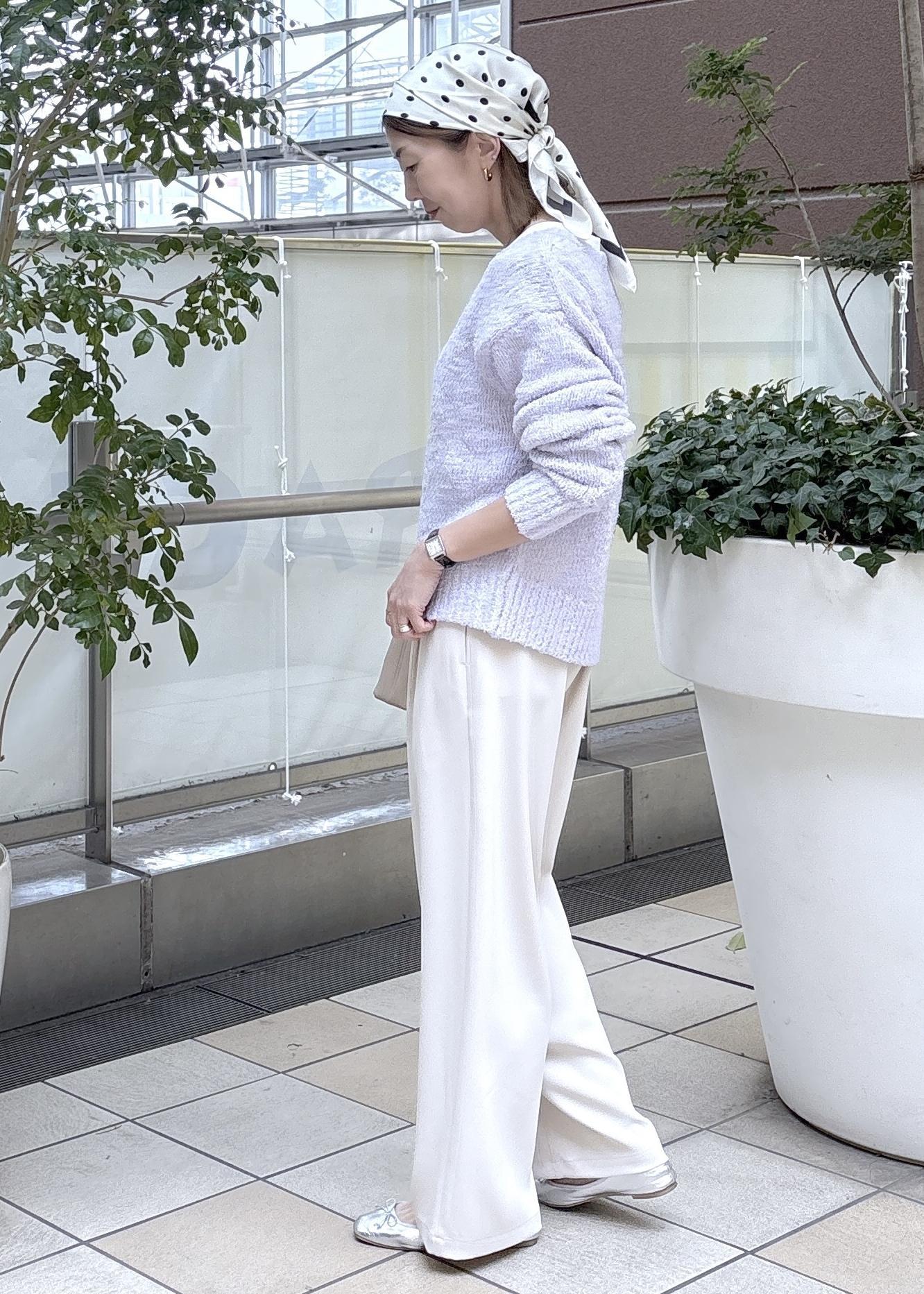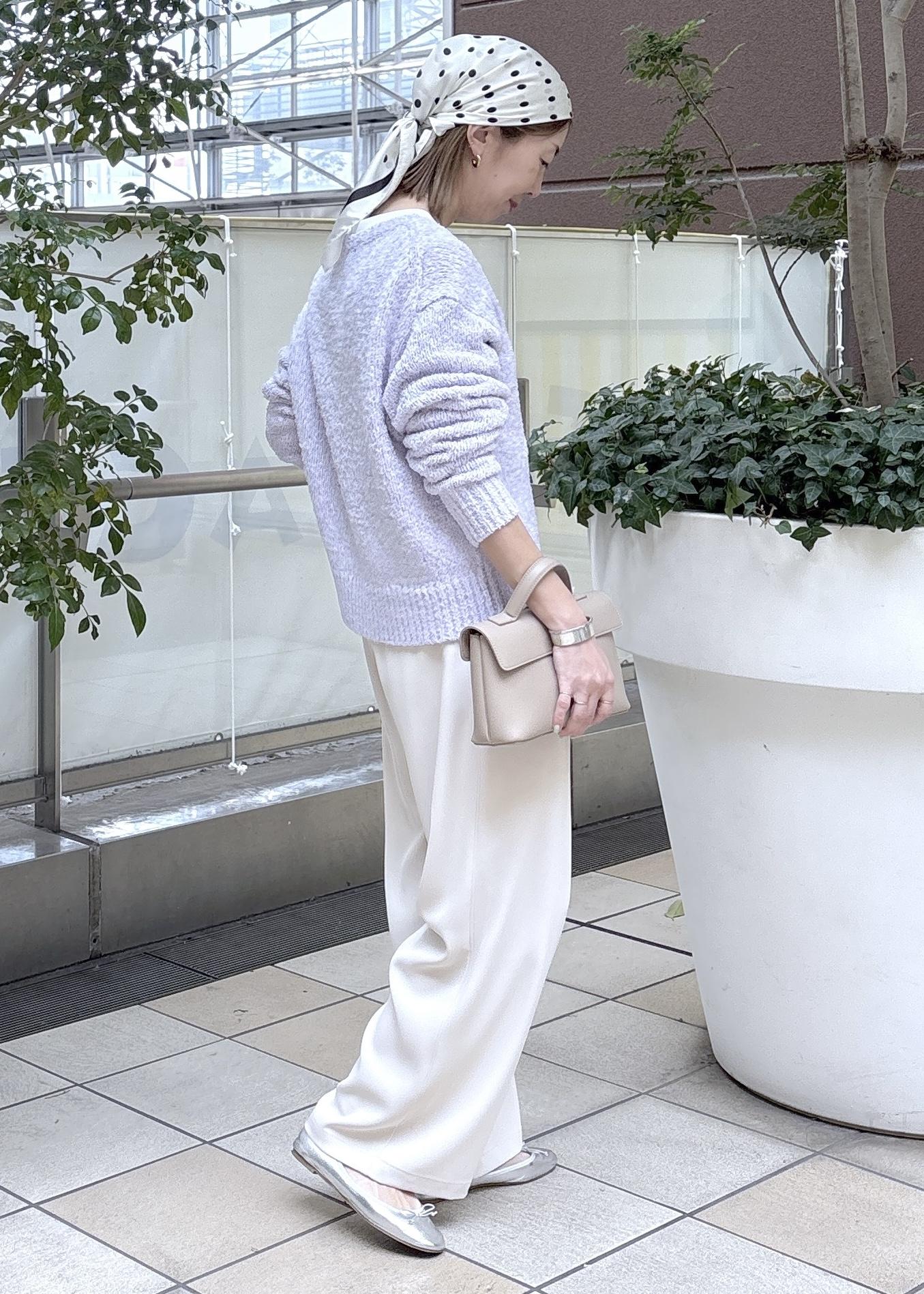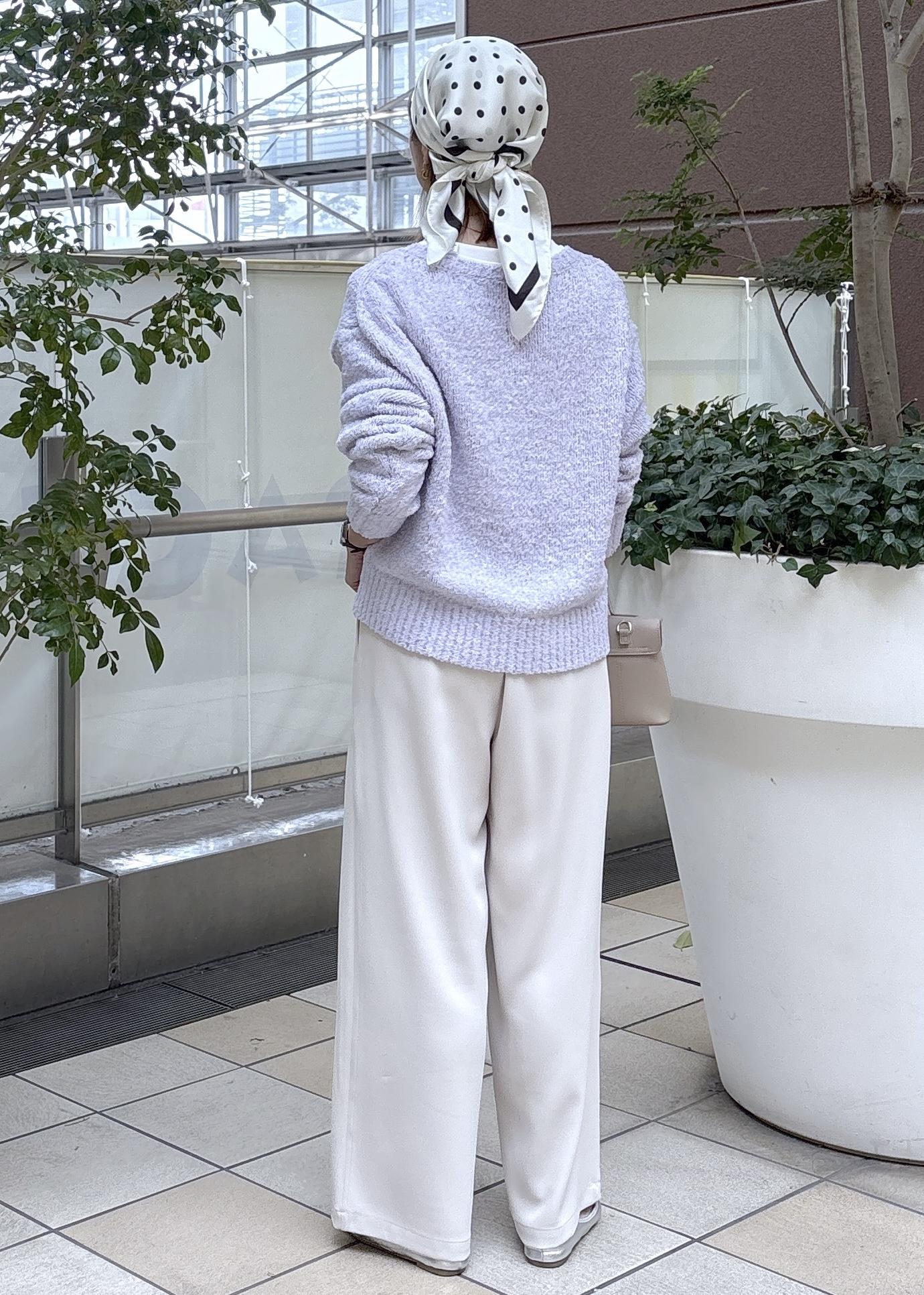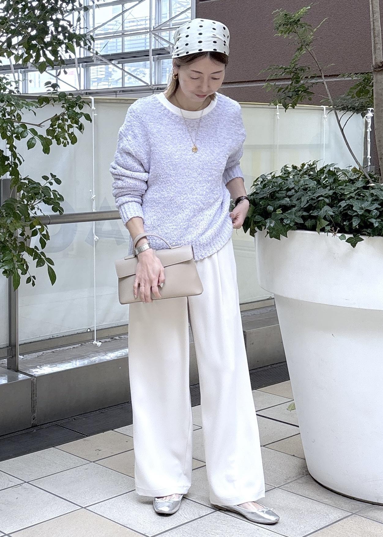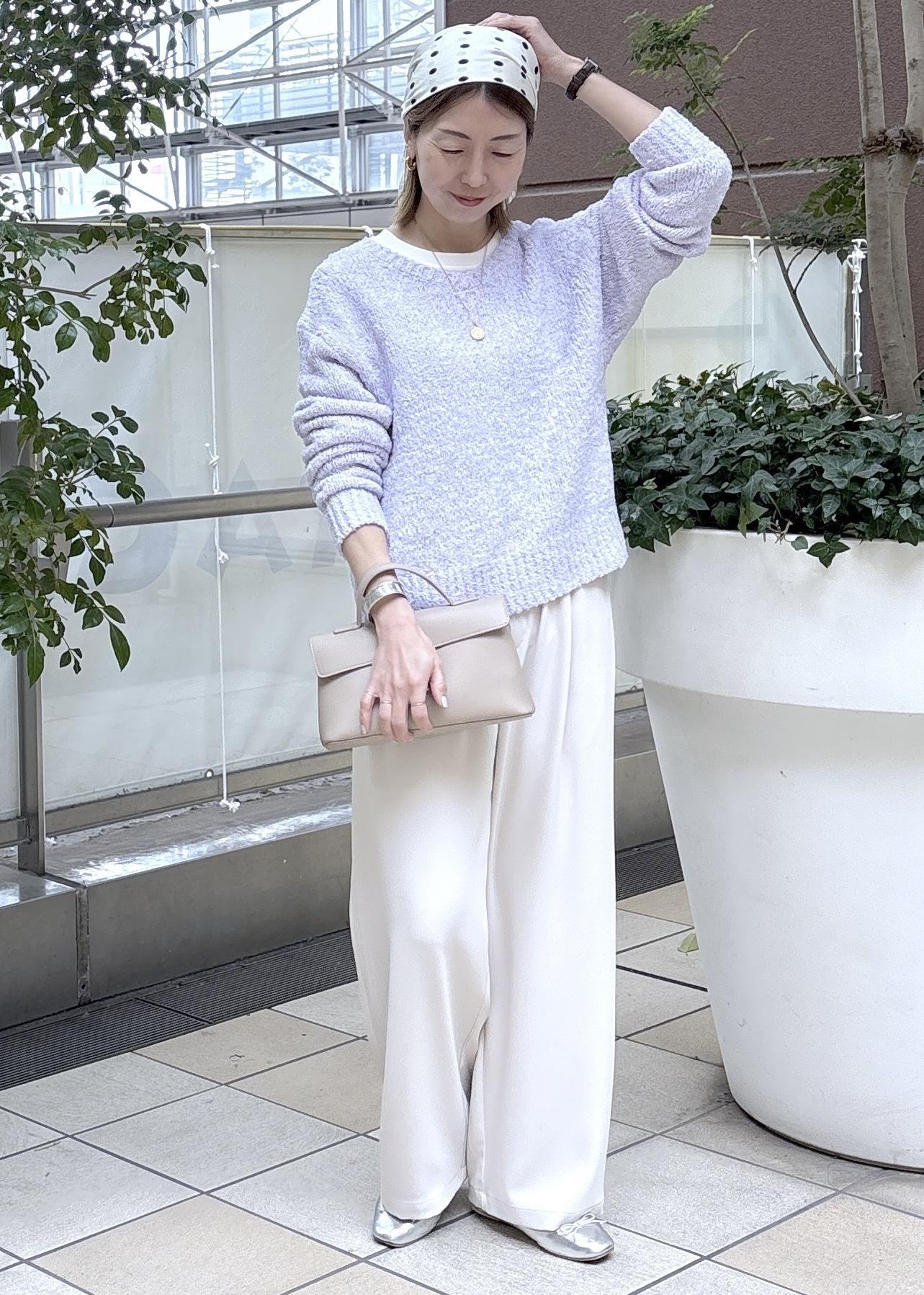 春らしく柔らかなパープルのニットの春ニットコーデ