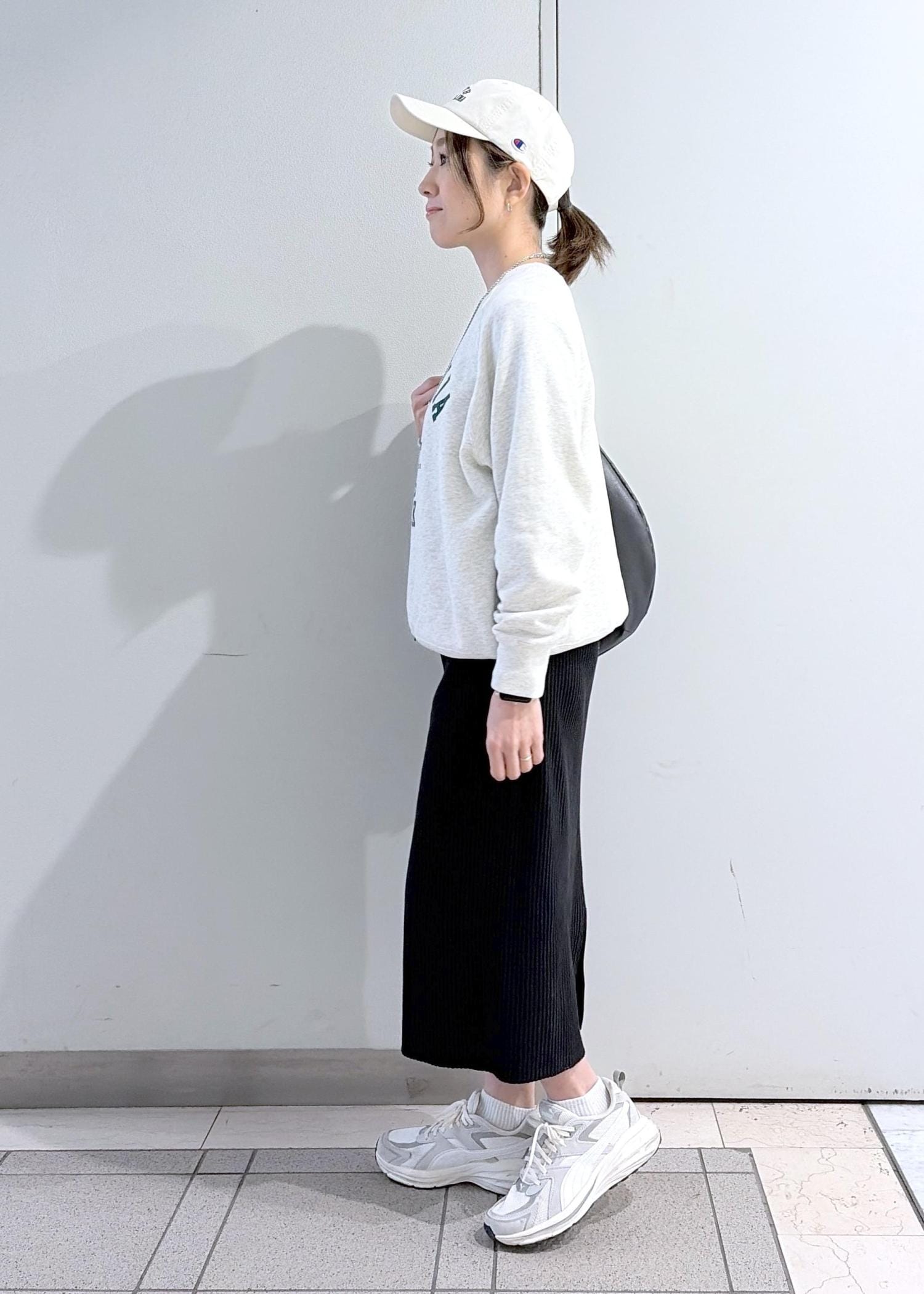 着丈は足首が見える長さで、低身長さんにも嬉しいスッキリとしたデザインです。