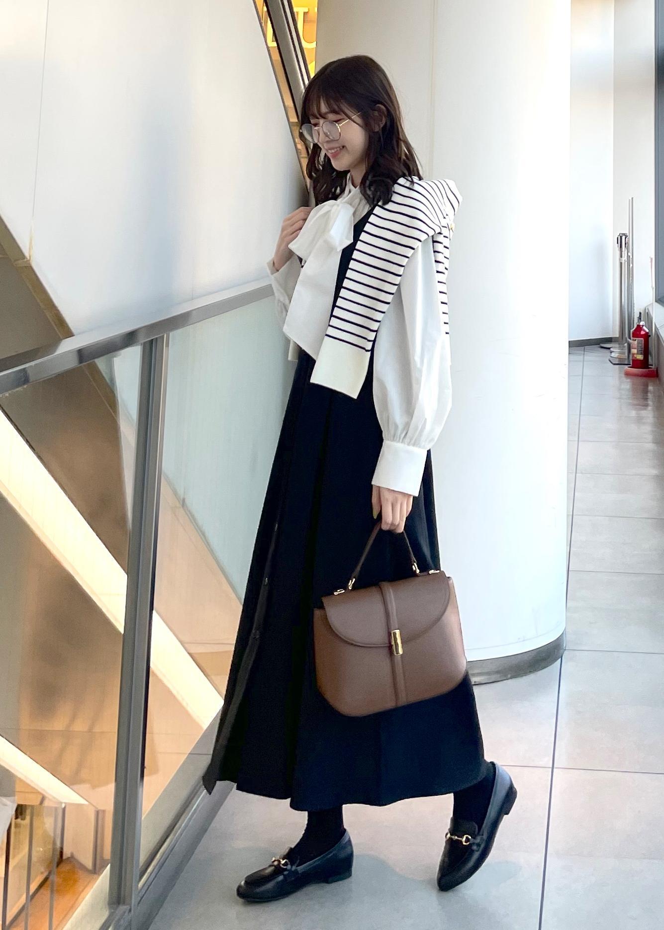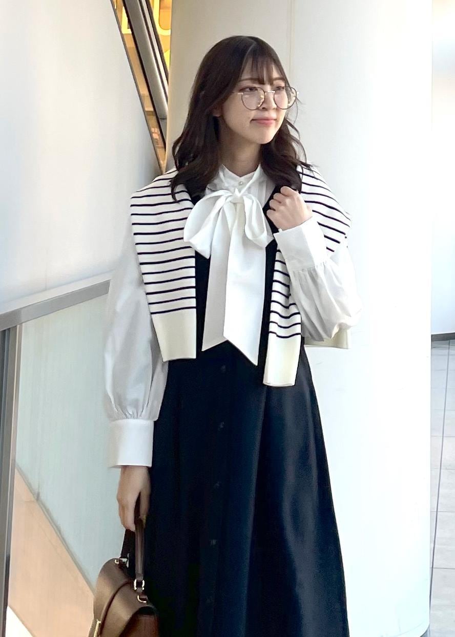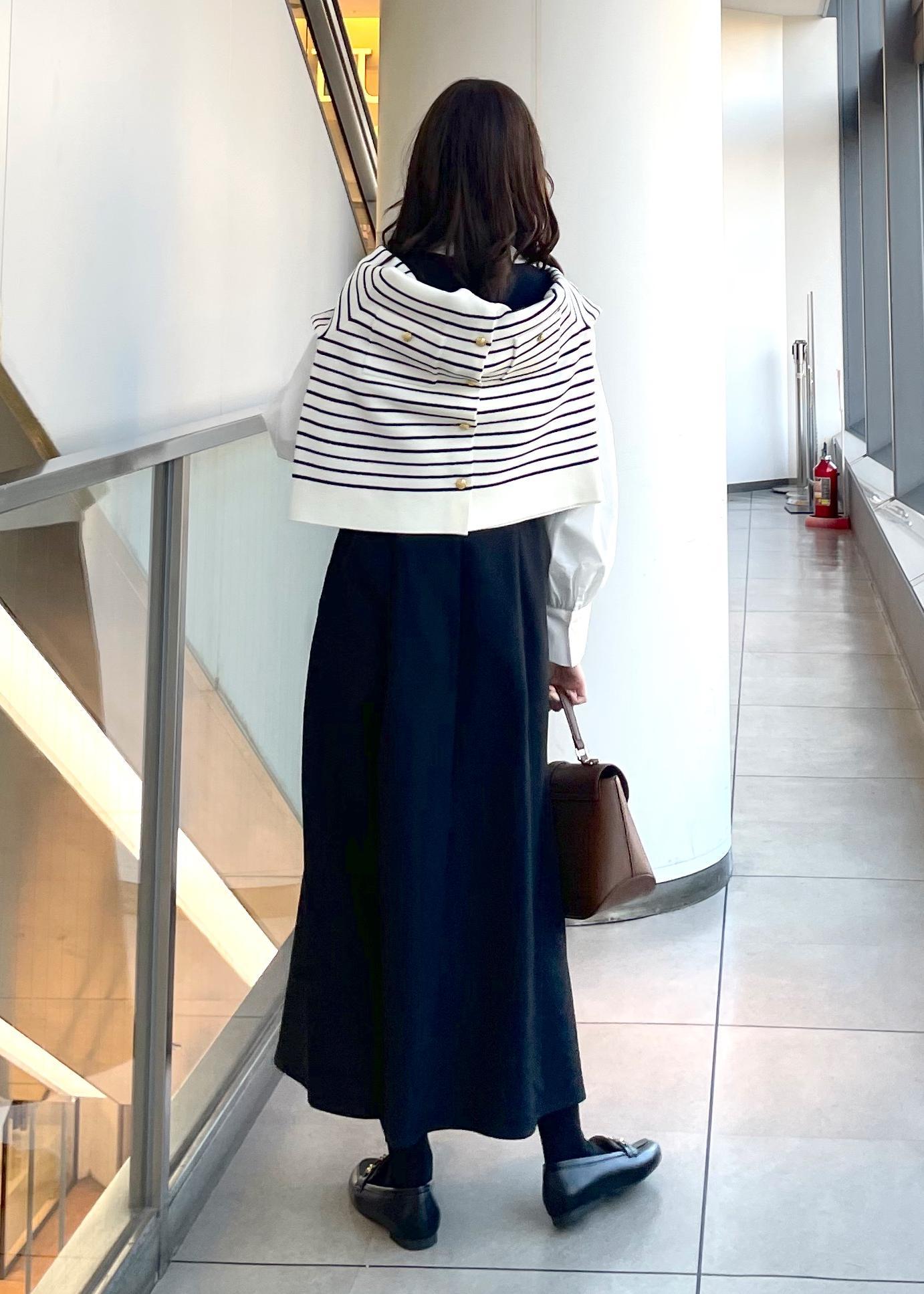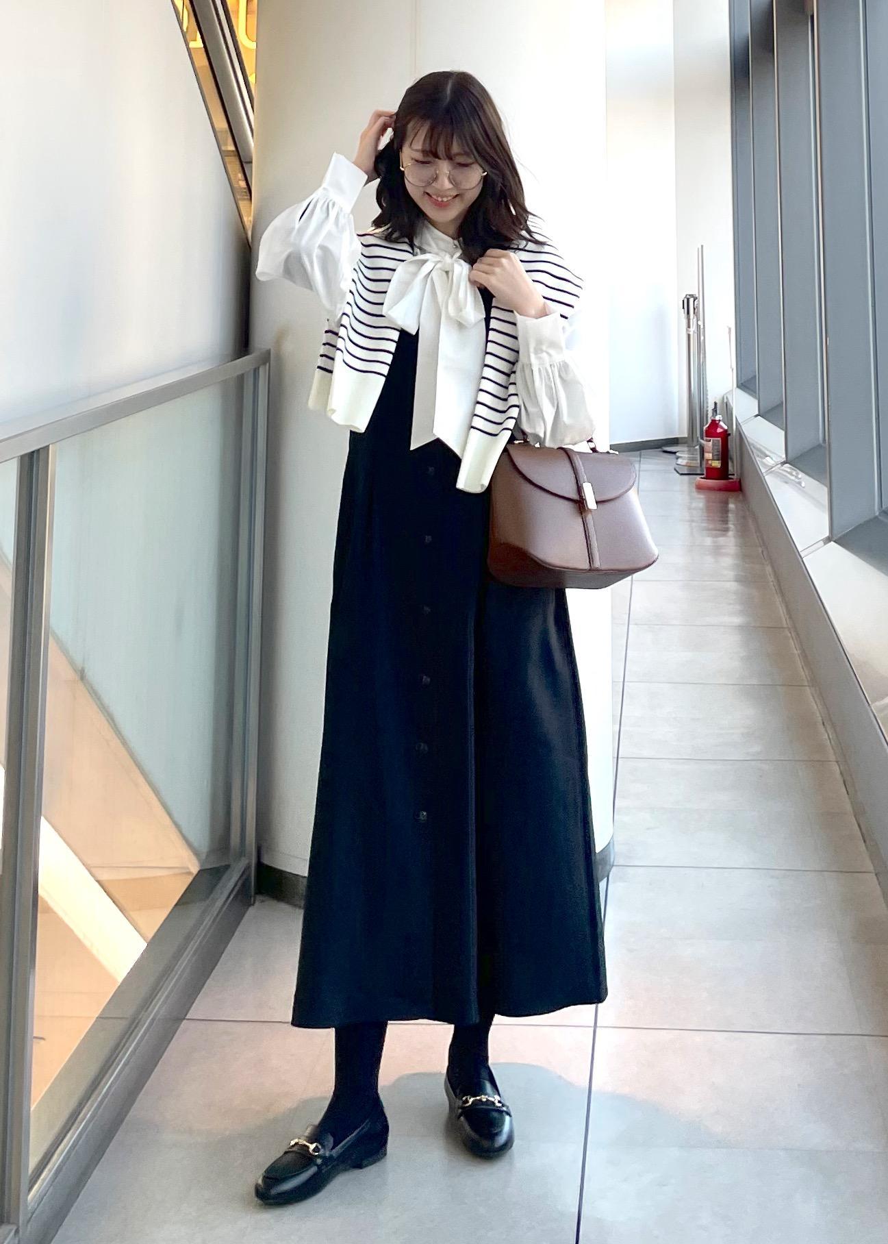 春のお出かけにピッタリな楽ちんジャンパースカートスタイルです。ワンポイントにボーダーのカーディガンを肩掛けし、こなれた印象に。