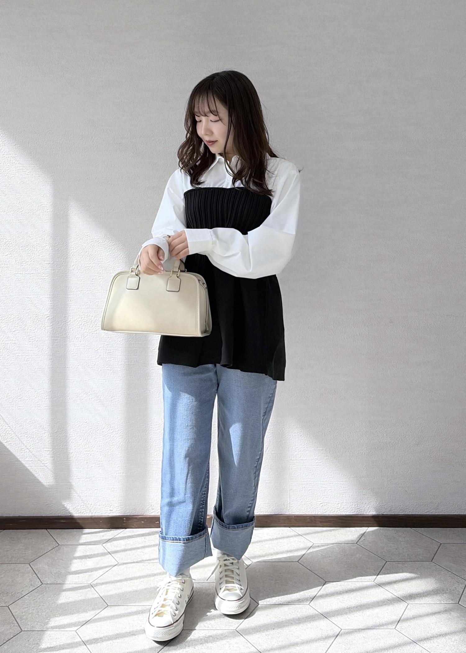 足元やバッグは春なのでホワイトで軽やかな印象に◎