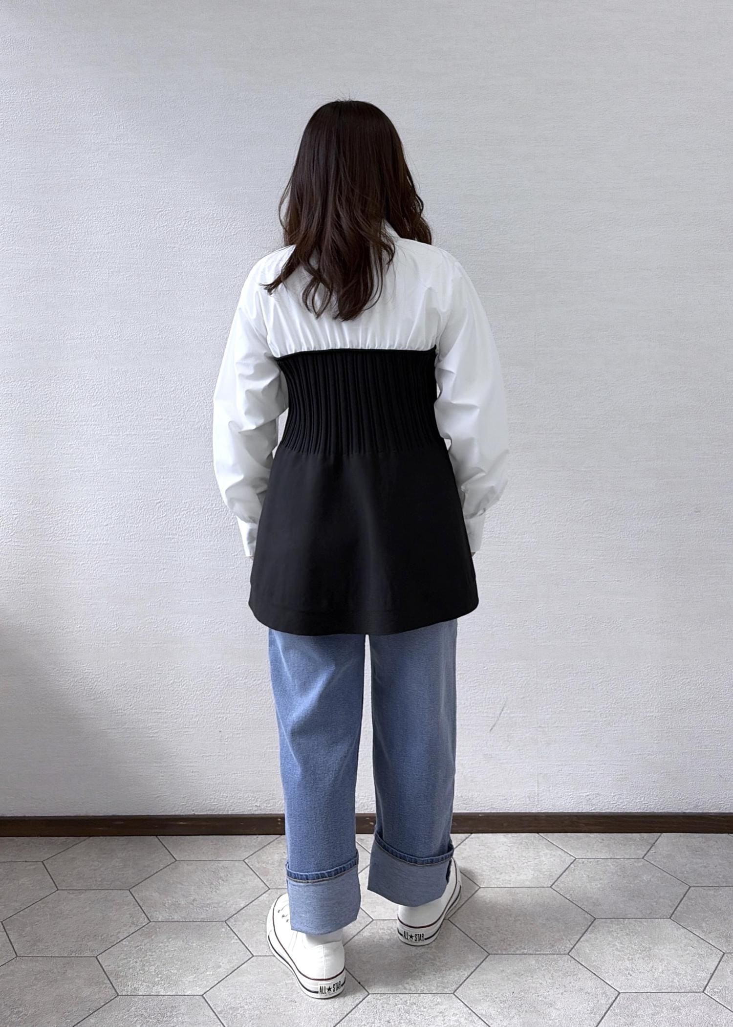 細身のパンツなので裾が地面につくことはないですが、長いので大きめにロールアップして履いています!