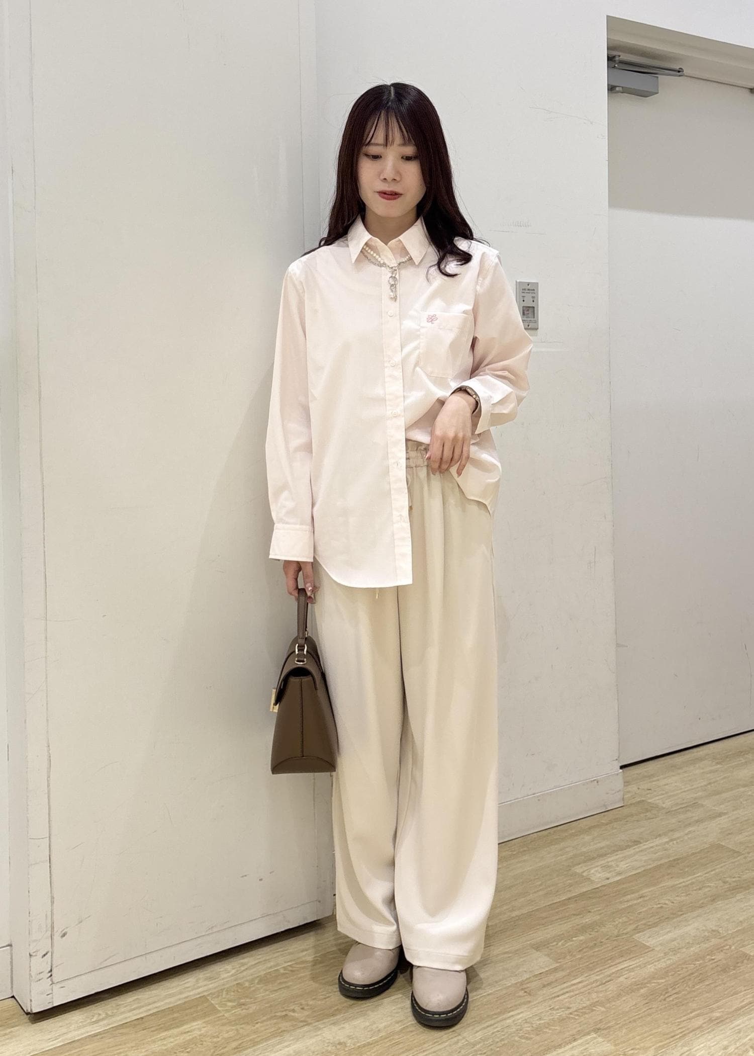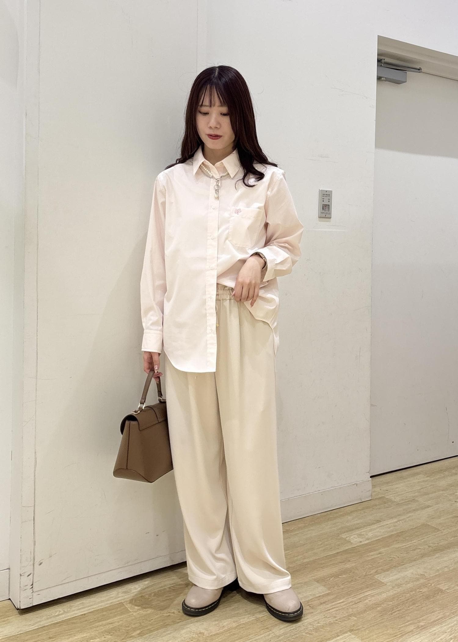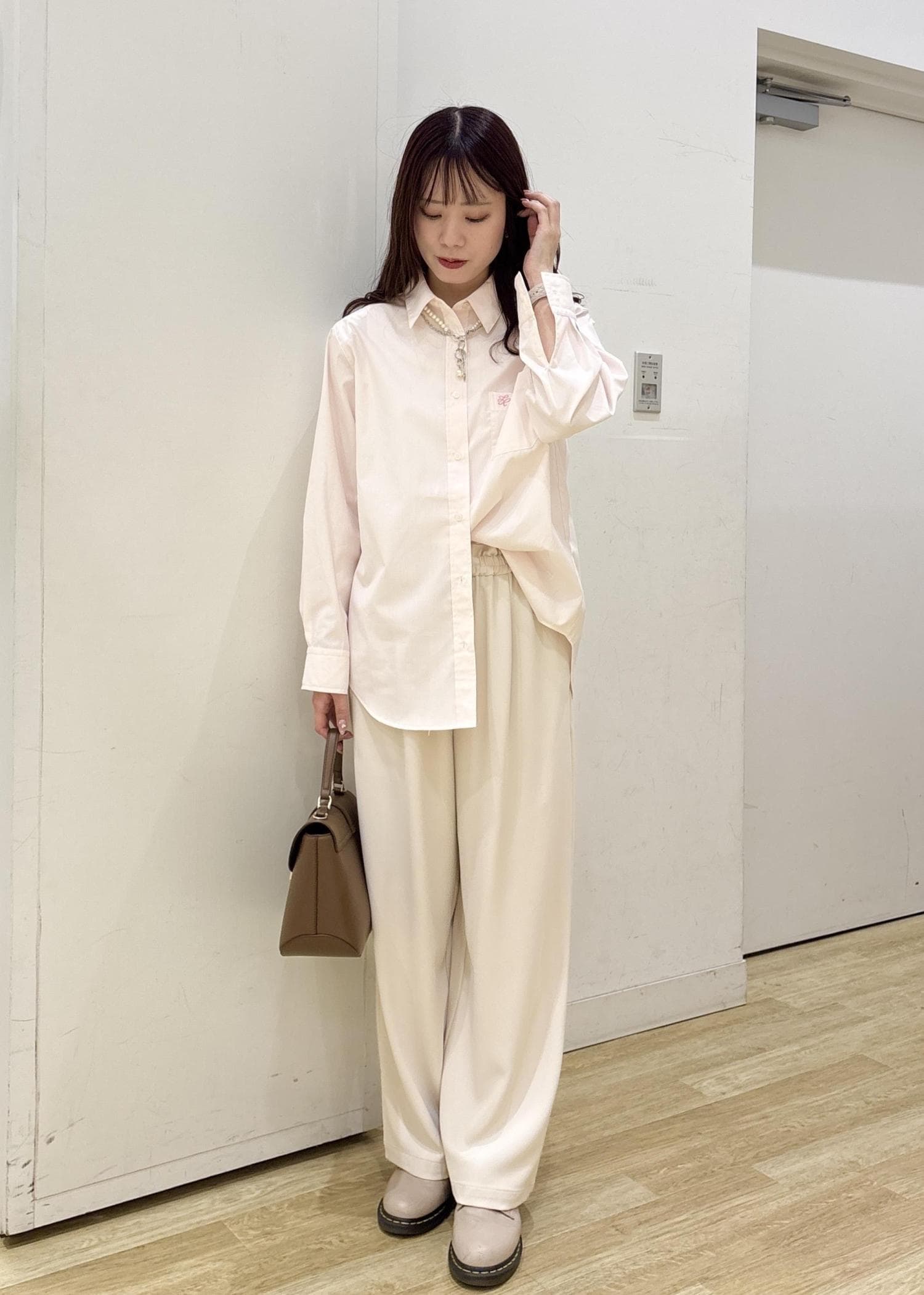 ピンクシャツとジョグパンツを合わせて春らしいコーディネートに仕上げました◎