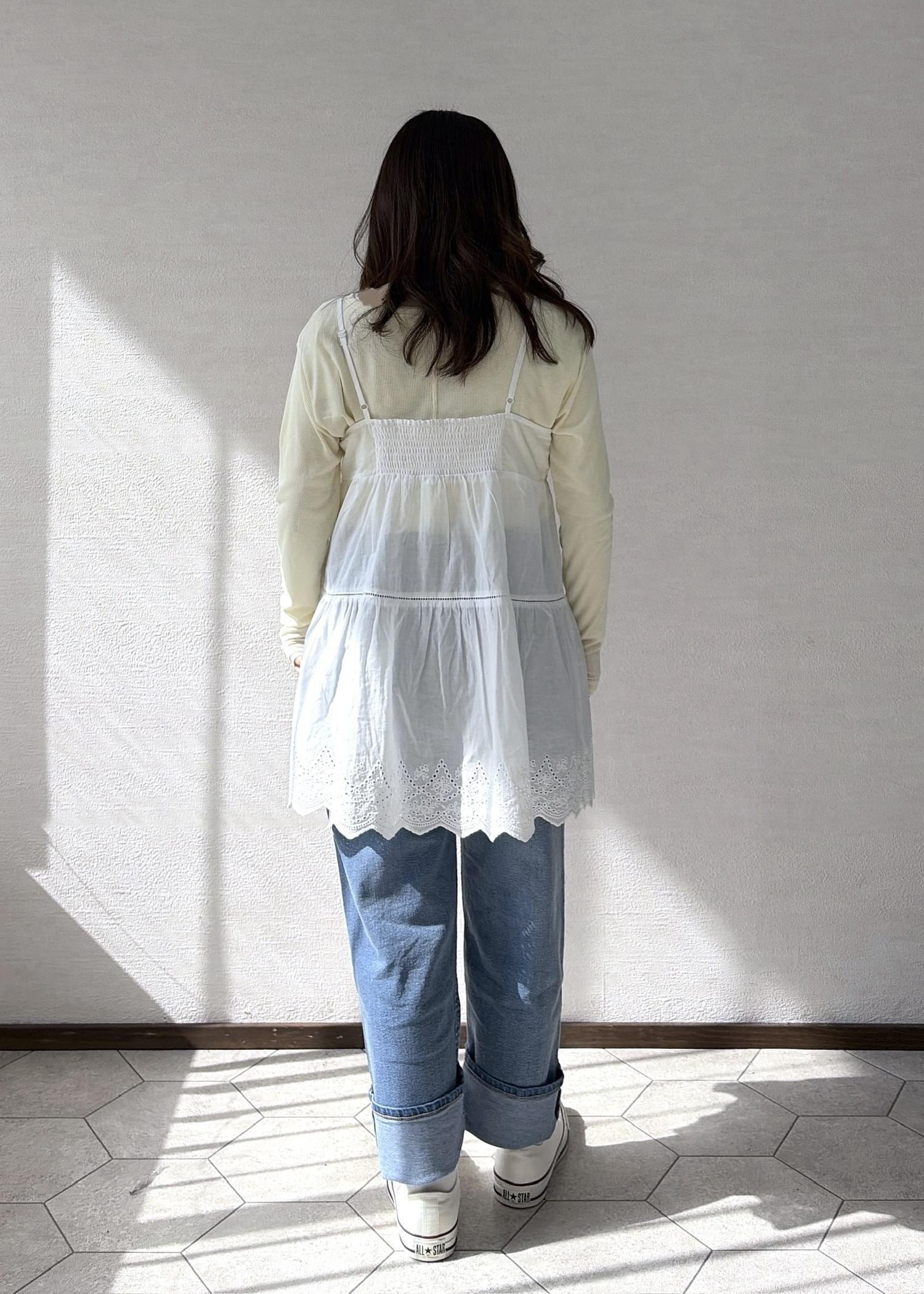 Tシャツの上からでも、ニットの下から裾のレースだけ見せるのも可愛いです!