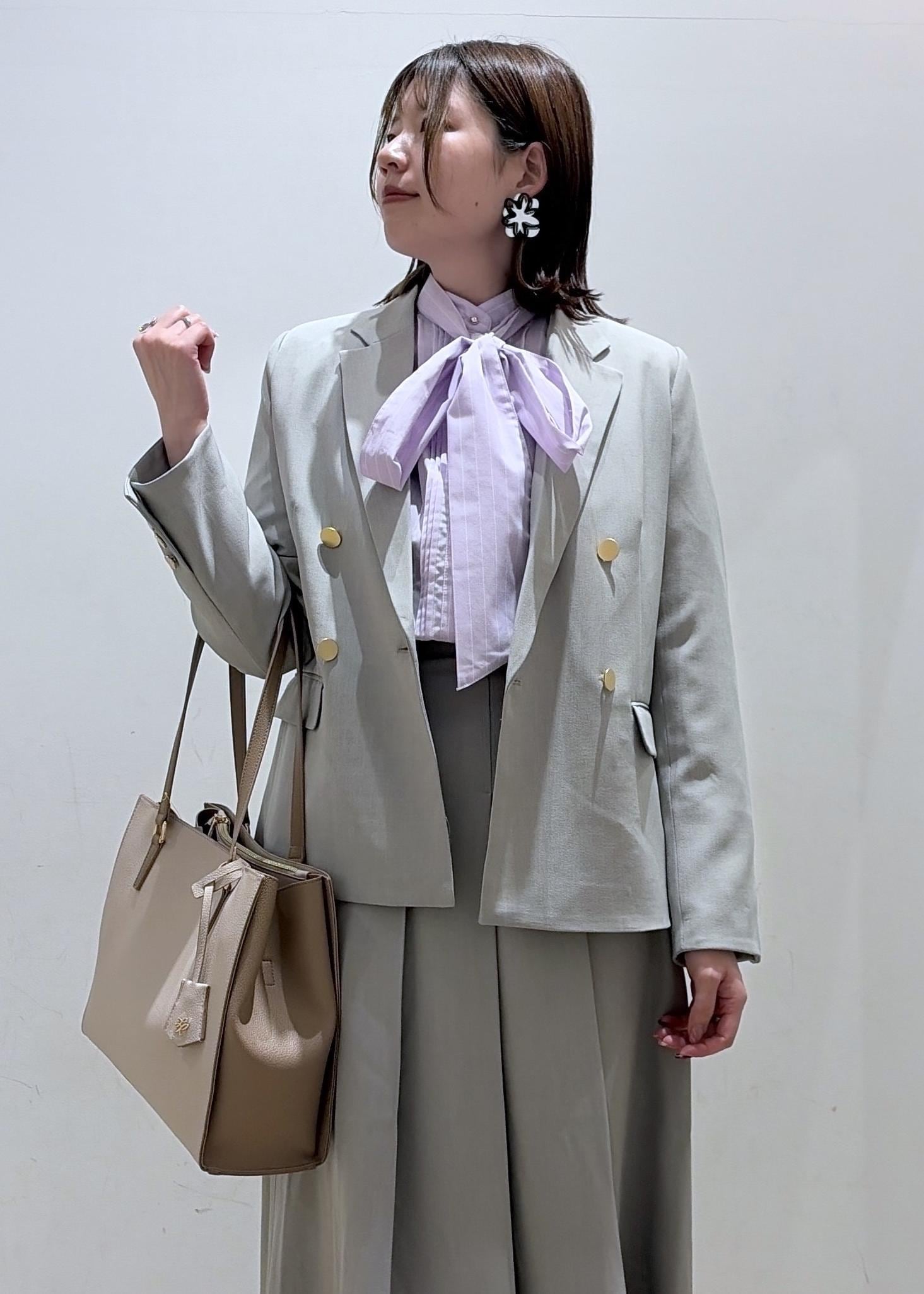 ジャケット×スカートできちんと感をしっかり出して、リボン付きシャツで可愛さもプラス♪