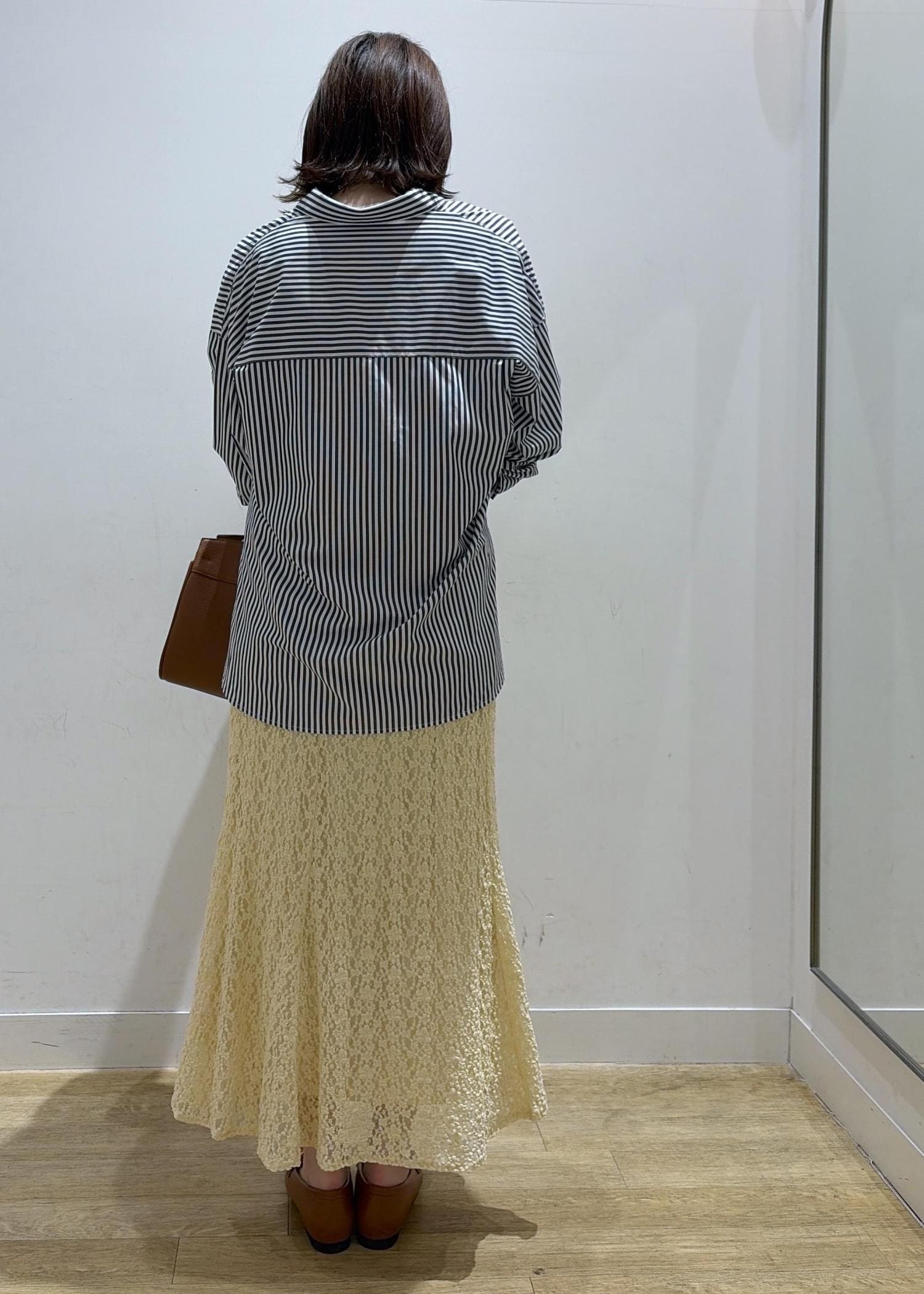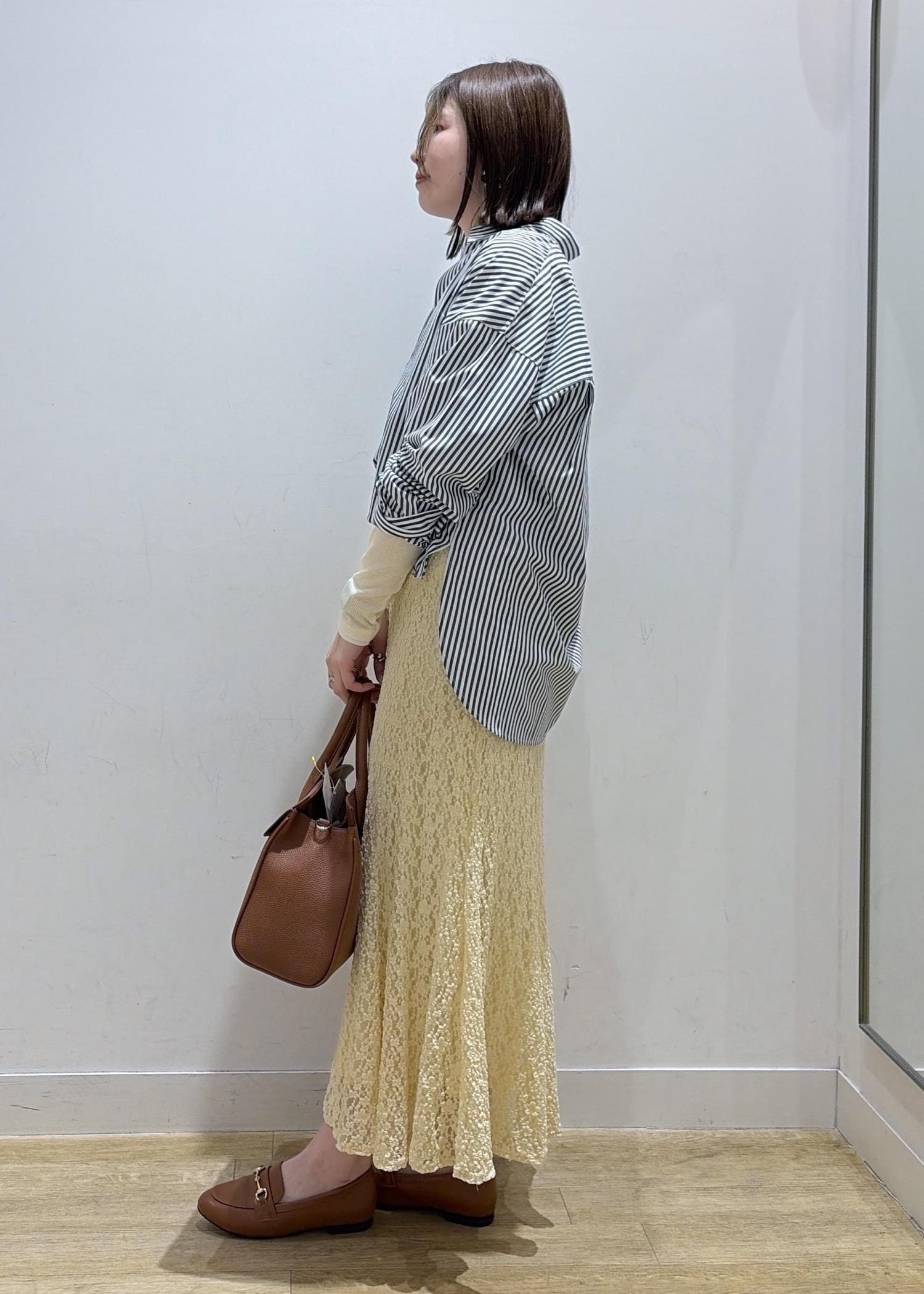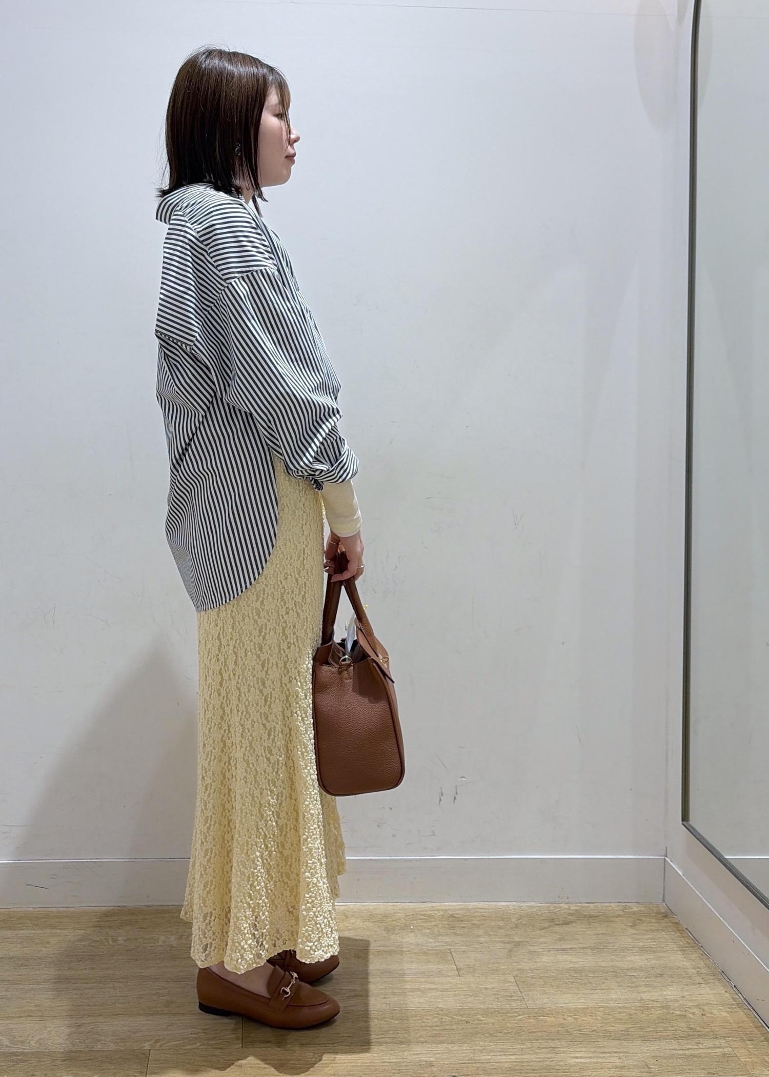 今回は、カジュアルなストライプシャツにキレイめスカートを組み合わせた大人カジュアルコーデ♪