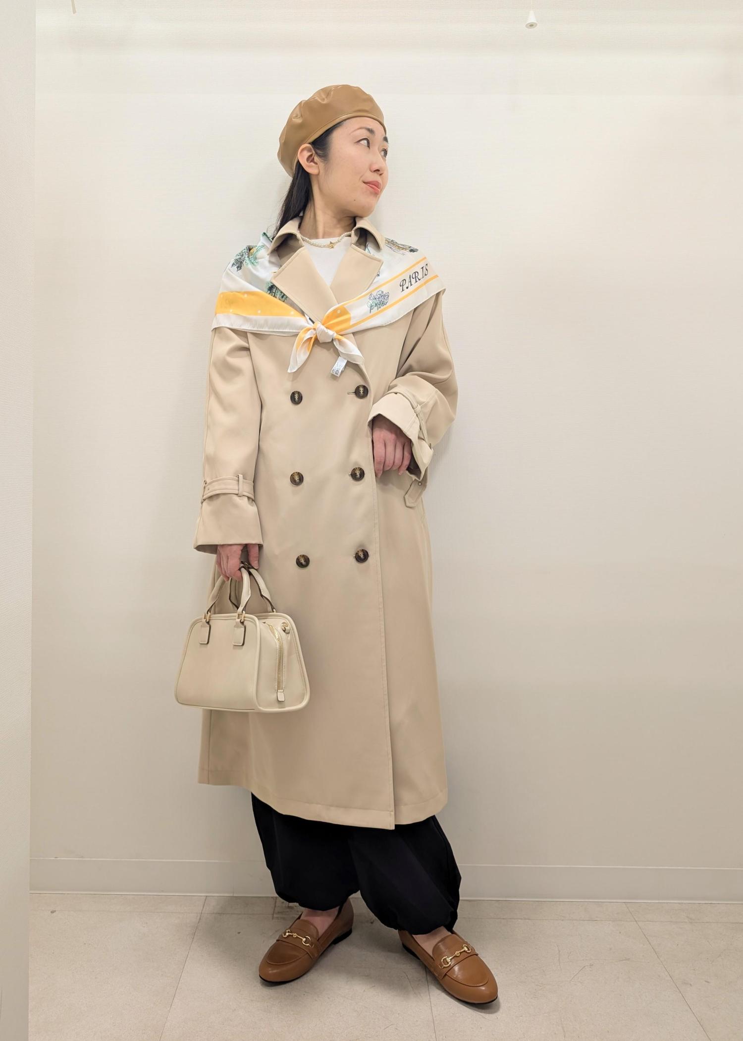 定番のトレンチコートにスカーフを合わせて、ベーシックながら洒落感のあるコーディネートにしました(^^)