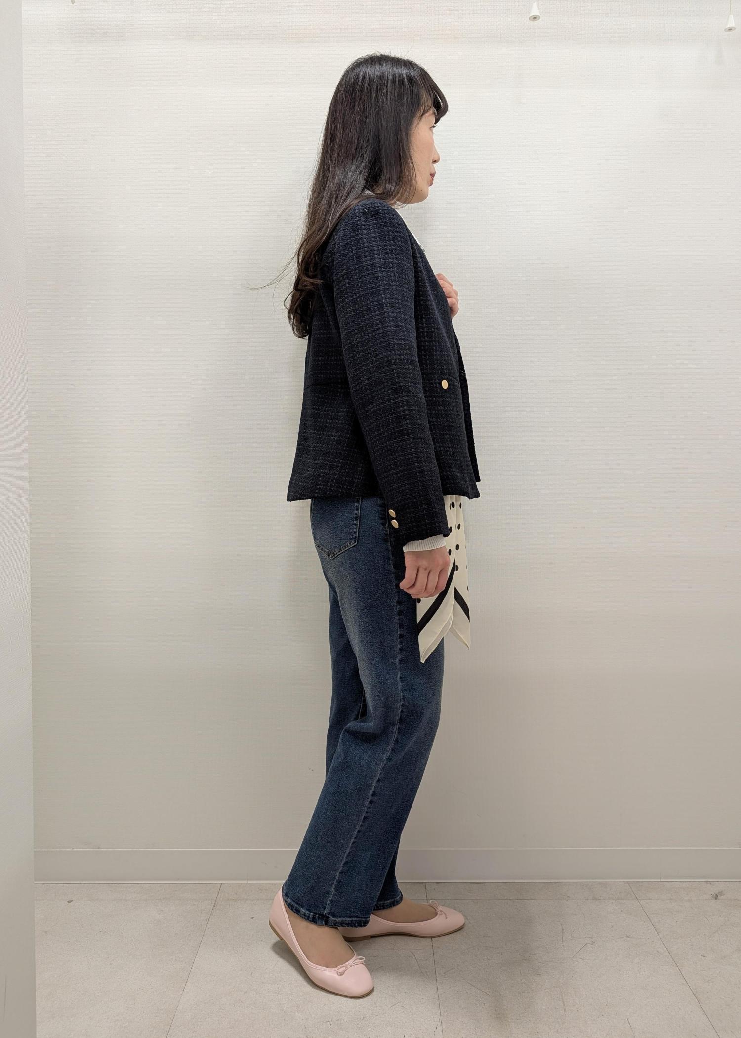 ツイードジャケットにデニムを合わせたカジュアルダウンコーデ。