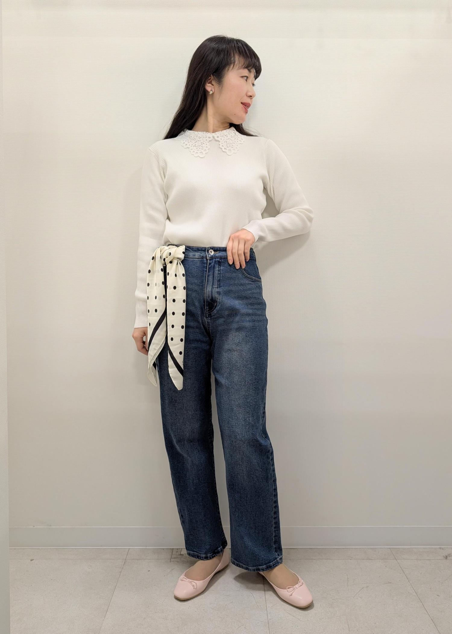 ノーカラーを活かしてインナーはレース襟ニットを選びました(^.^)