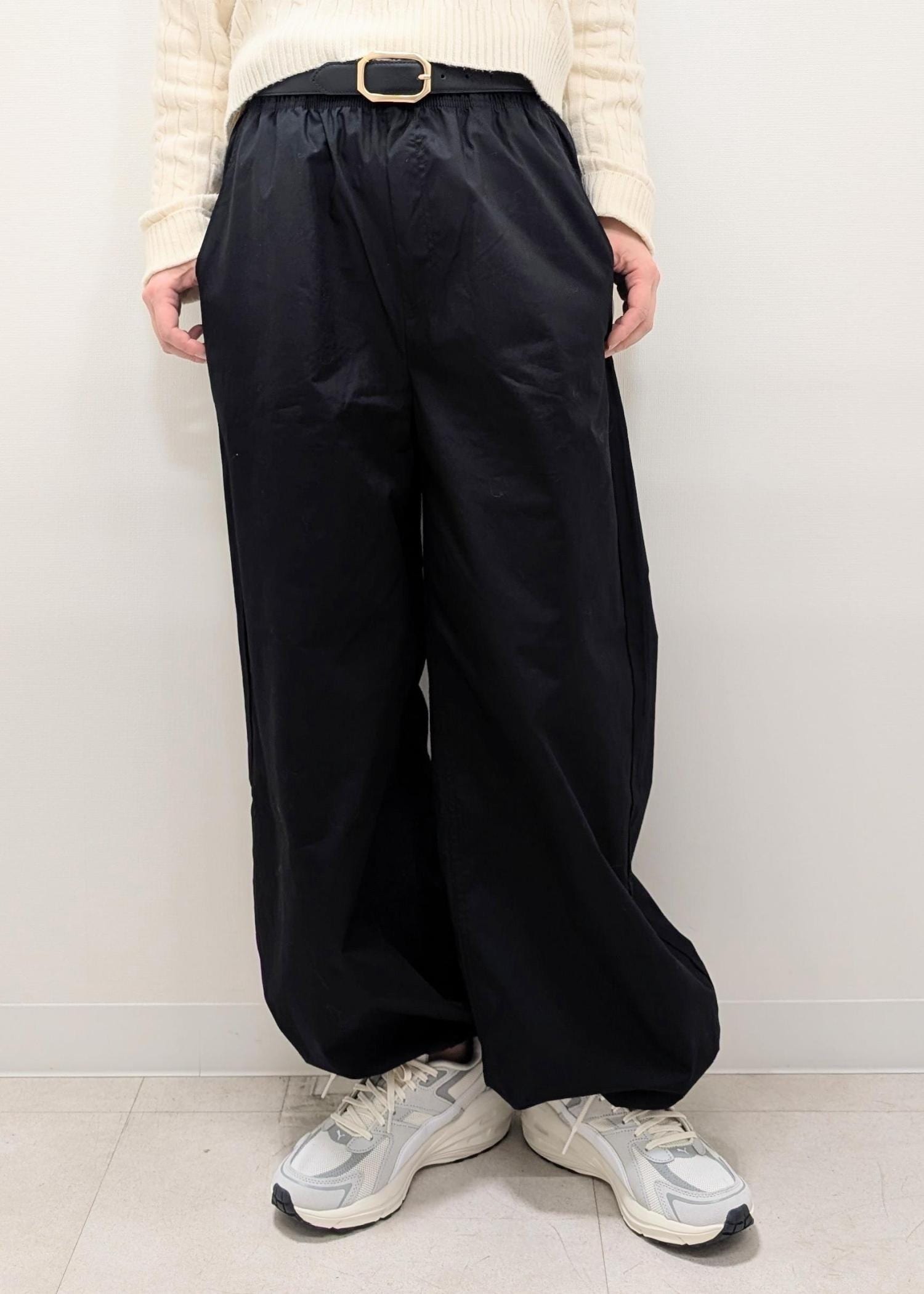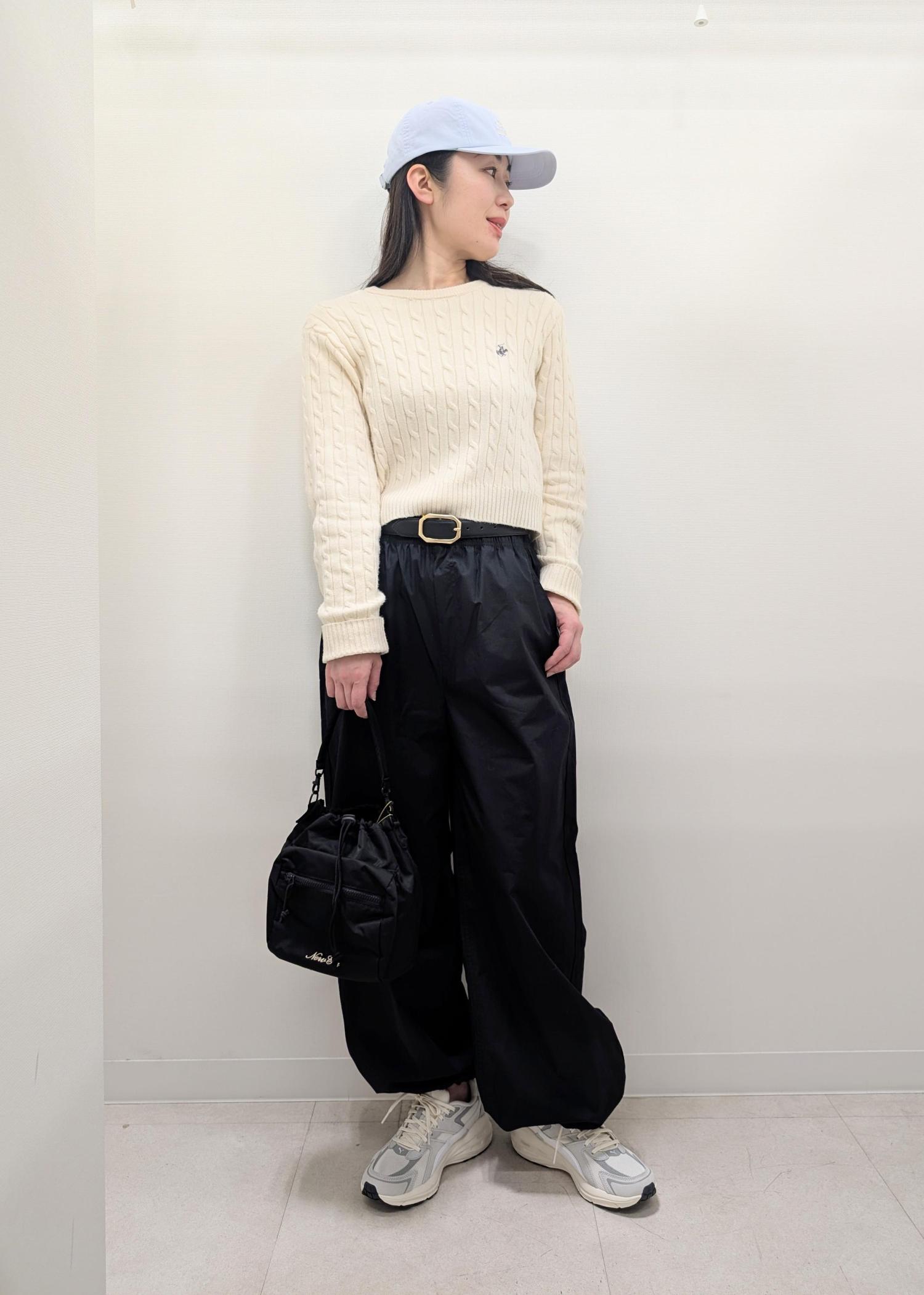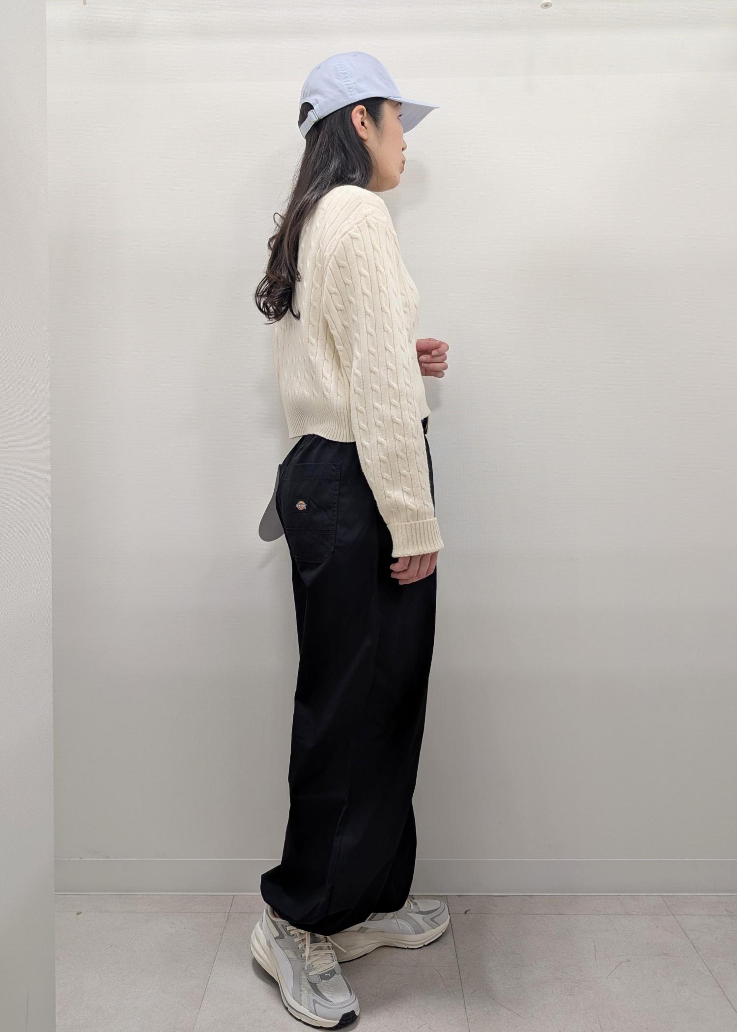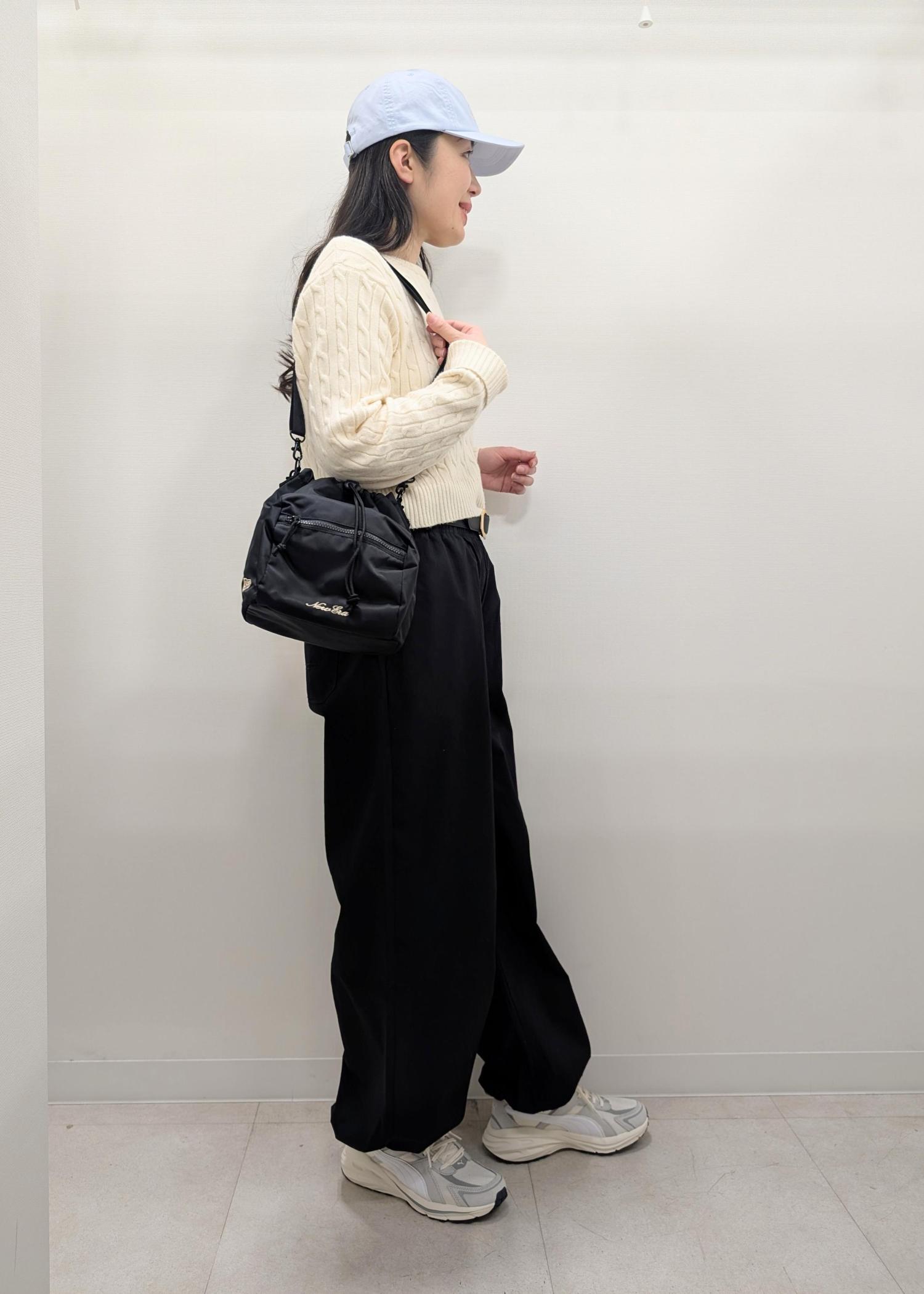 ニット×パンツのシンプルな組み合わせなので、トップスはケーブルニット、ボトムはボリュームのあるパンツを合わせ