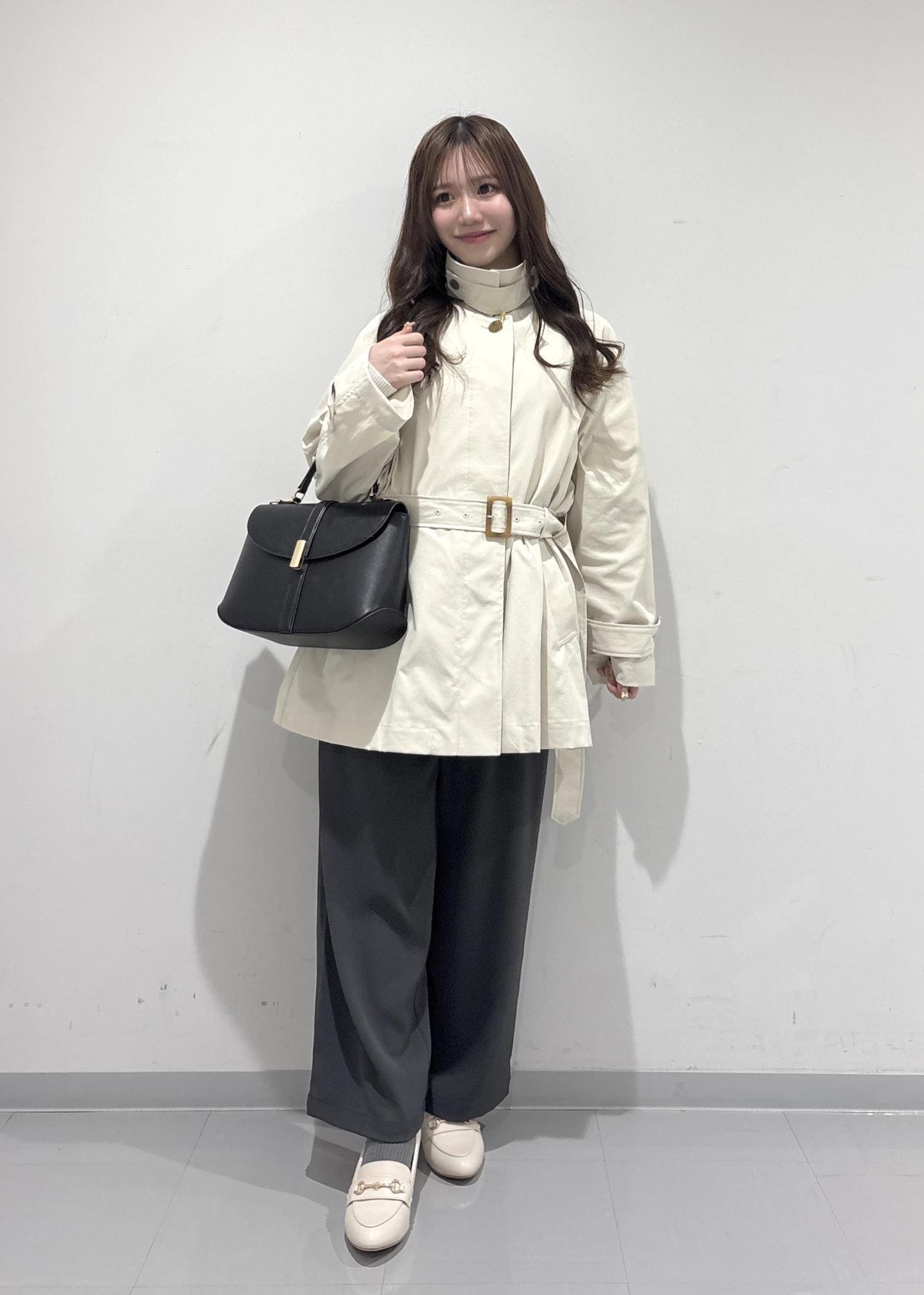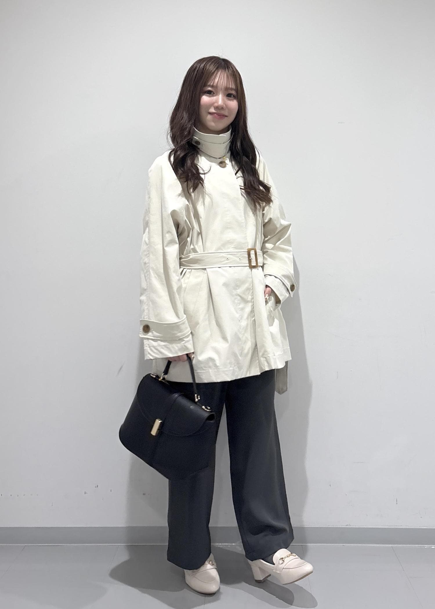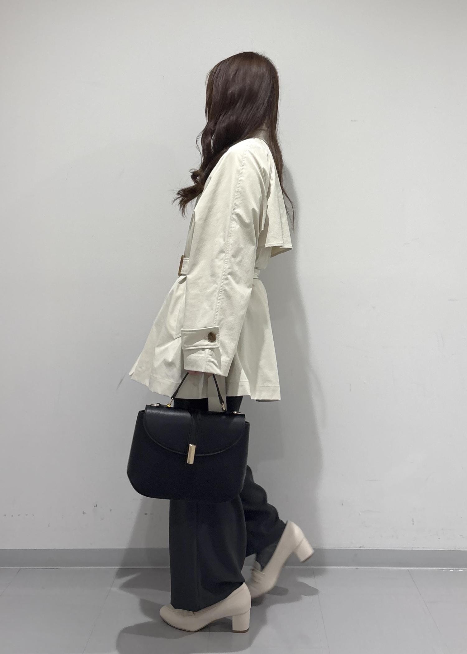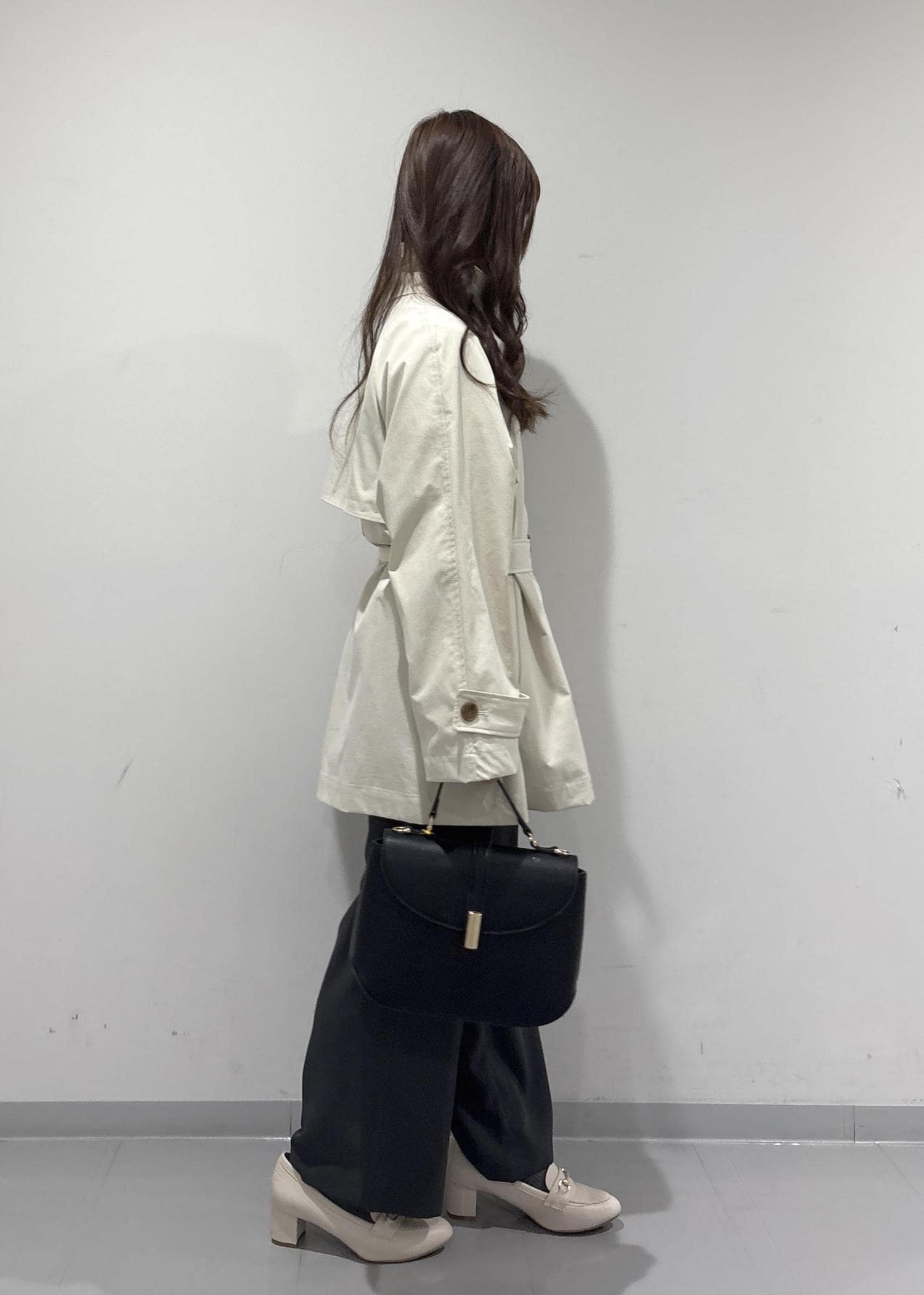 軽く羽織れて、ベルトがアクセントになっています!サラッとしたチャコール色のパンツで上下とモノトーンに。バッグは綺麗めな黒でパンツと色を合わせてみました!あとはヒールつきのパンプスで大人っぽい背伸びした印象にして、大人っぽい綺麗めなスタイルで周りと差がつけられるコーデになっています!