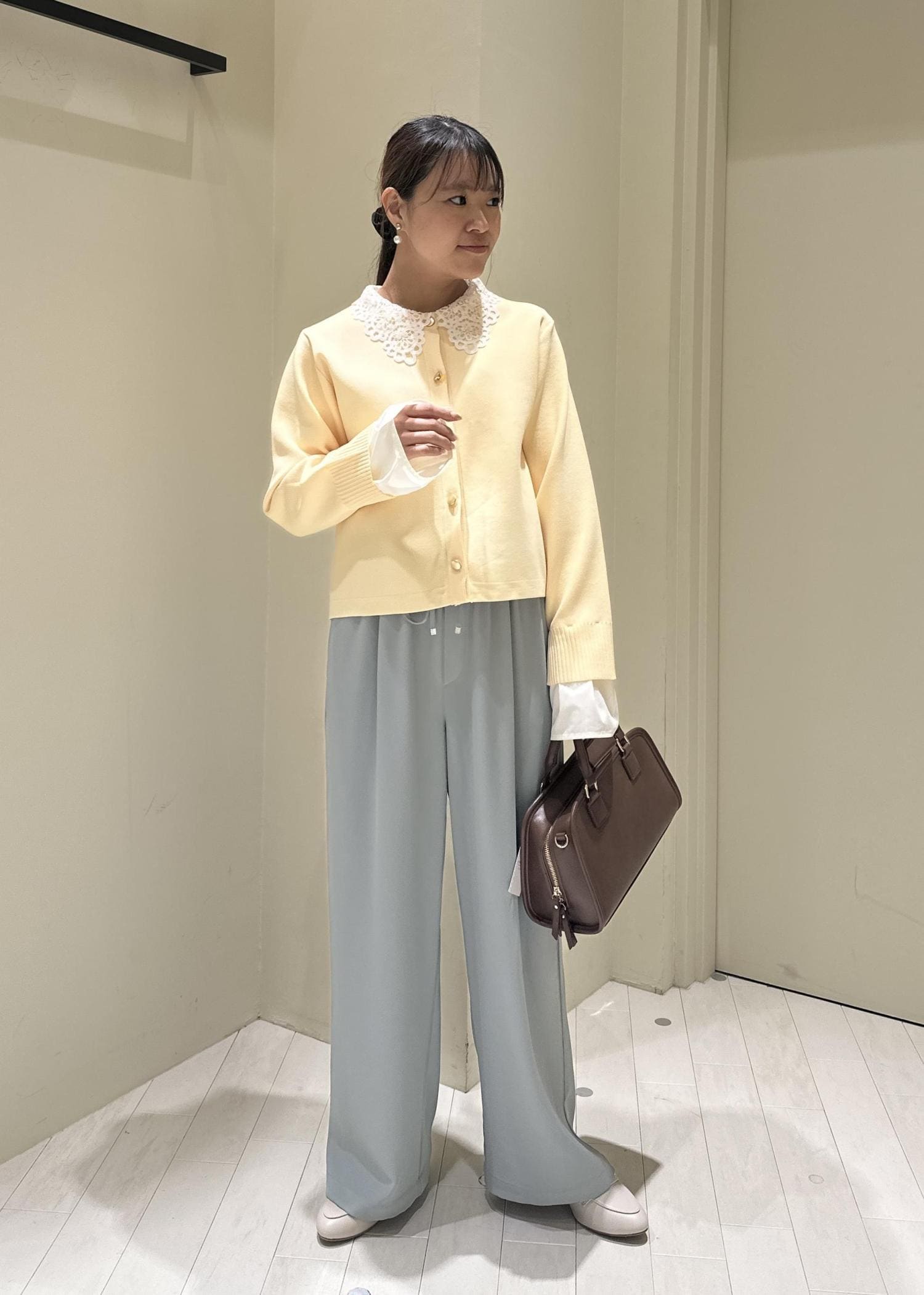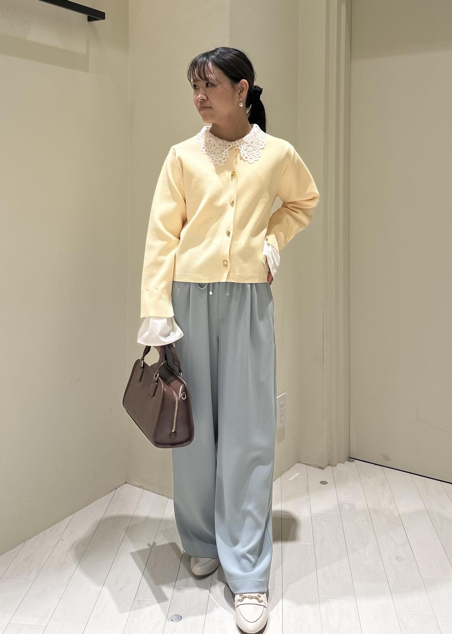 フリルドッキングカーデのフリルを外し、中に襟付きニットを着用してみました!