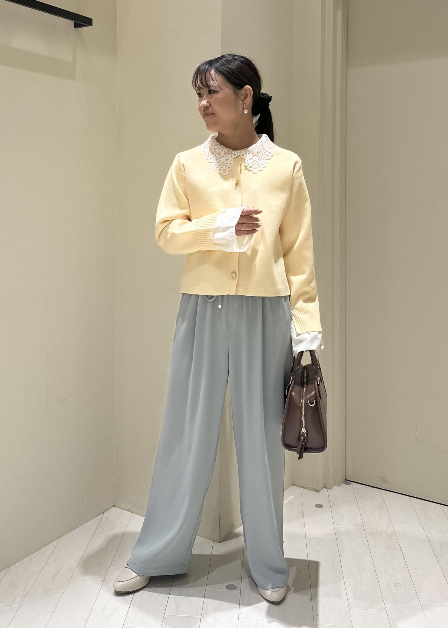 春フェミニンコーデのパンツスタイル