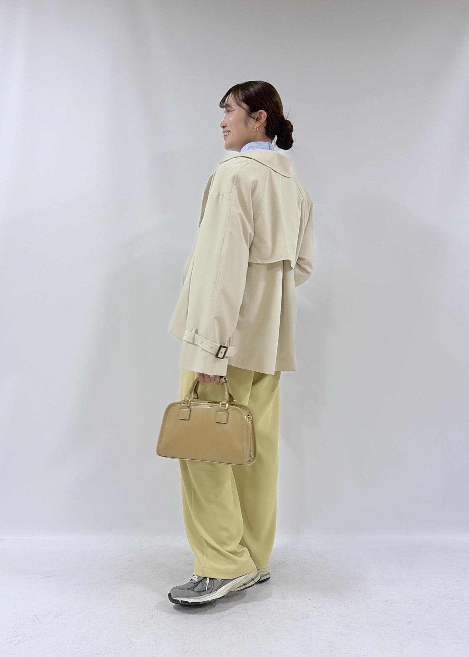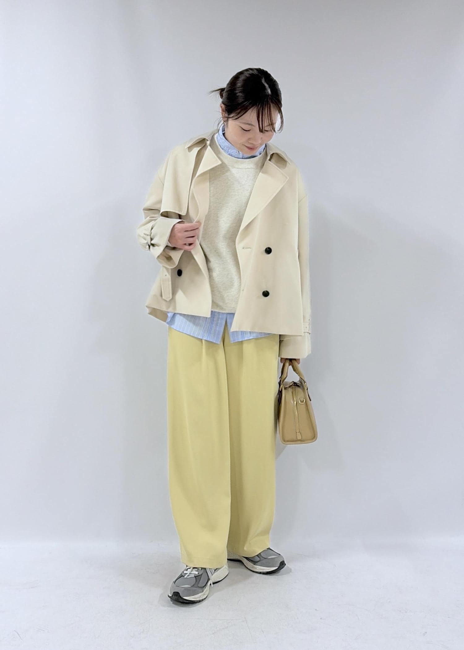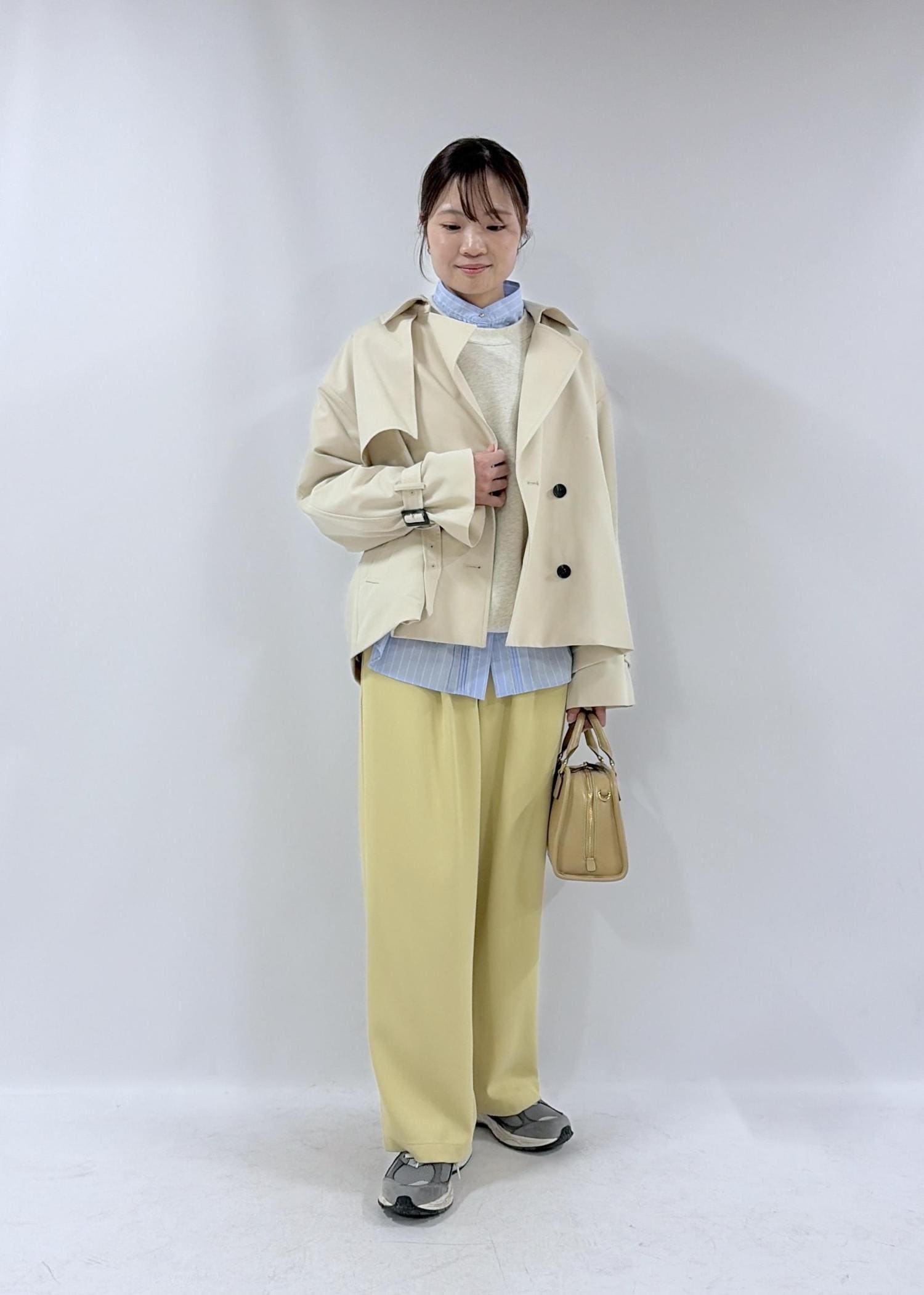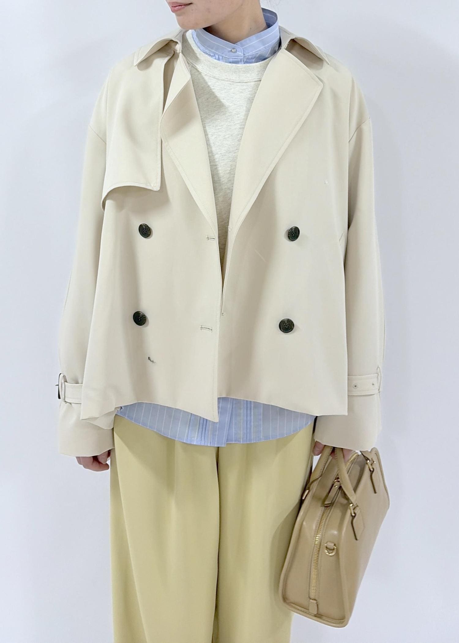 ROPÉ PICNICショート丈トレンチコート/撥水・花粉ガードベージュ / F¥13,200レビュー軽くて羽織りやすいトレンチです。肩や袖周りがゆったりしていて中に少し厚手のものやデザイン性のあるものも着やすいです。袖口のベルト調整でキャンディスリーブのようなシルエットにできます。