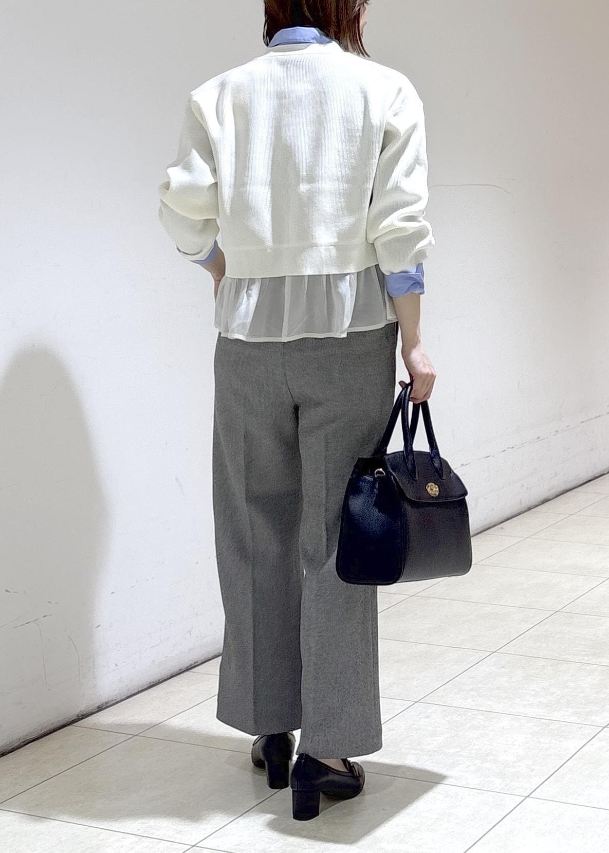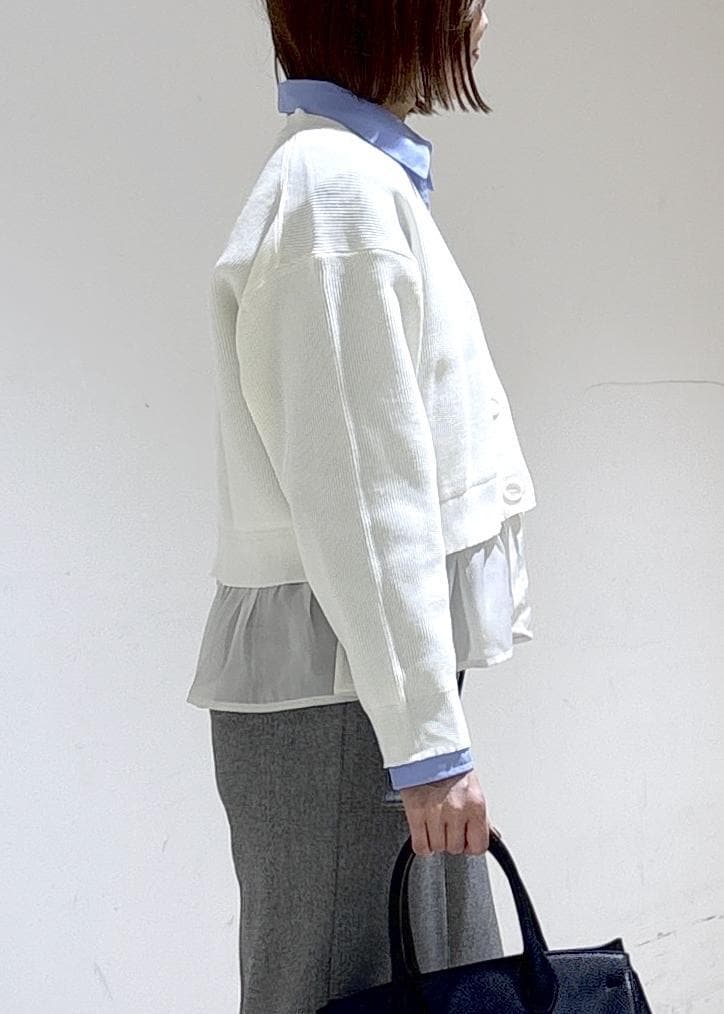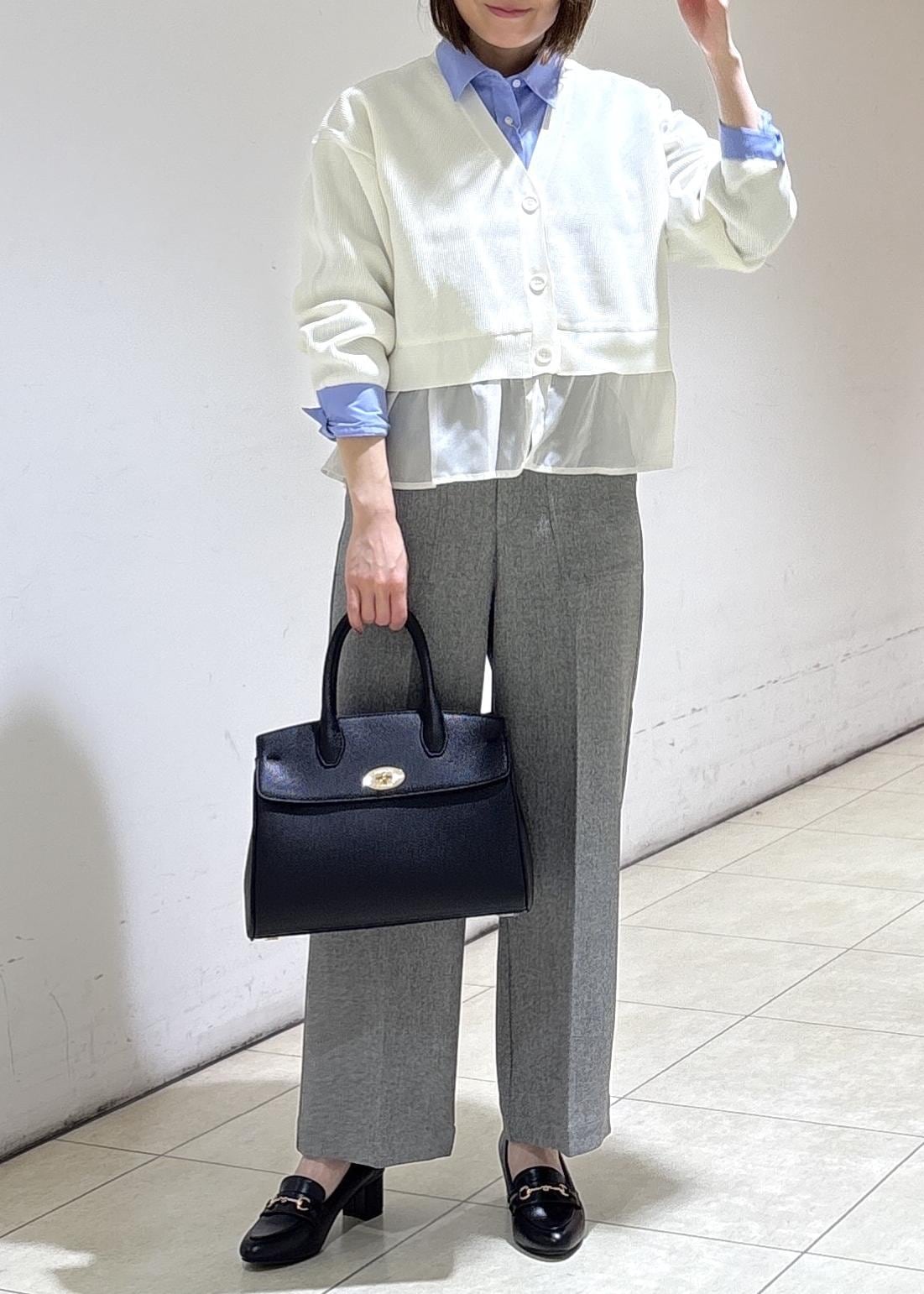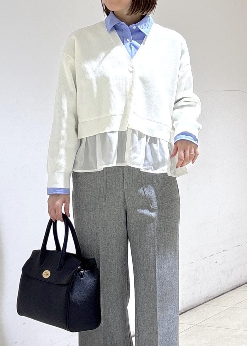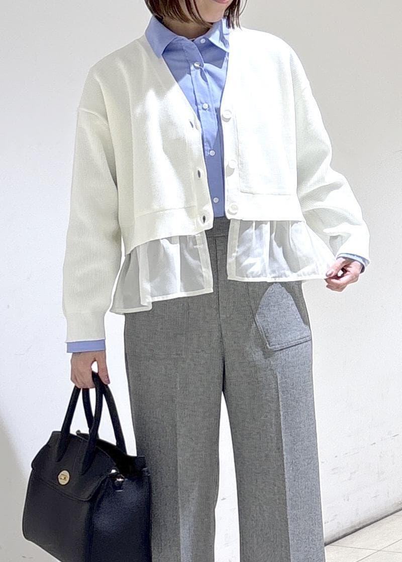一枚で重ね着してるようなカーディガンなので忙しい朝にも時短コーデにぴったりです♪