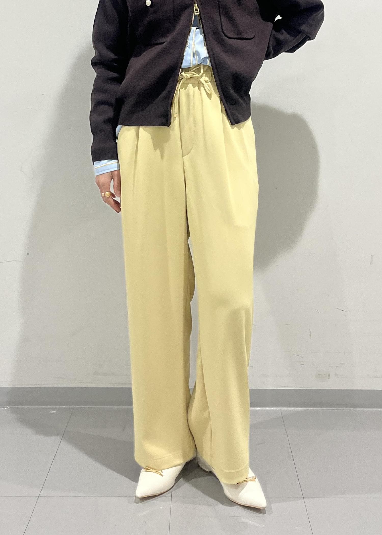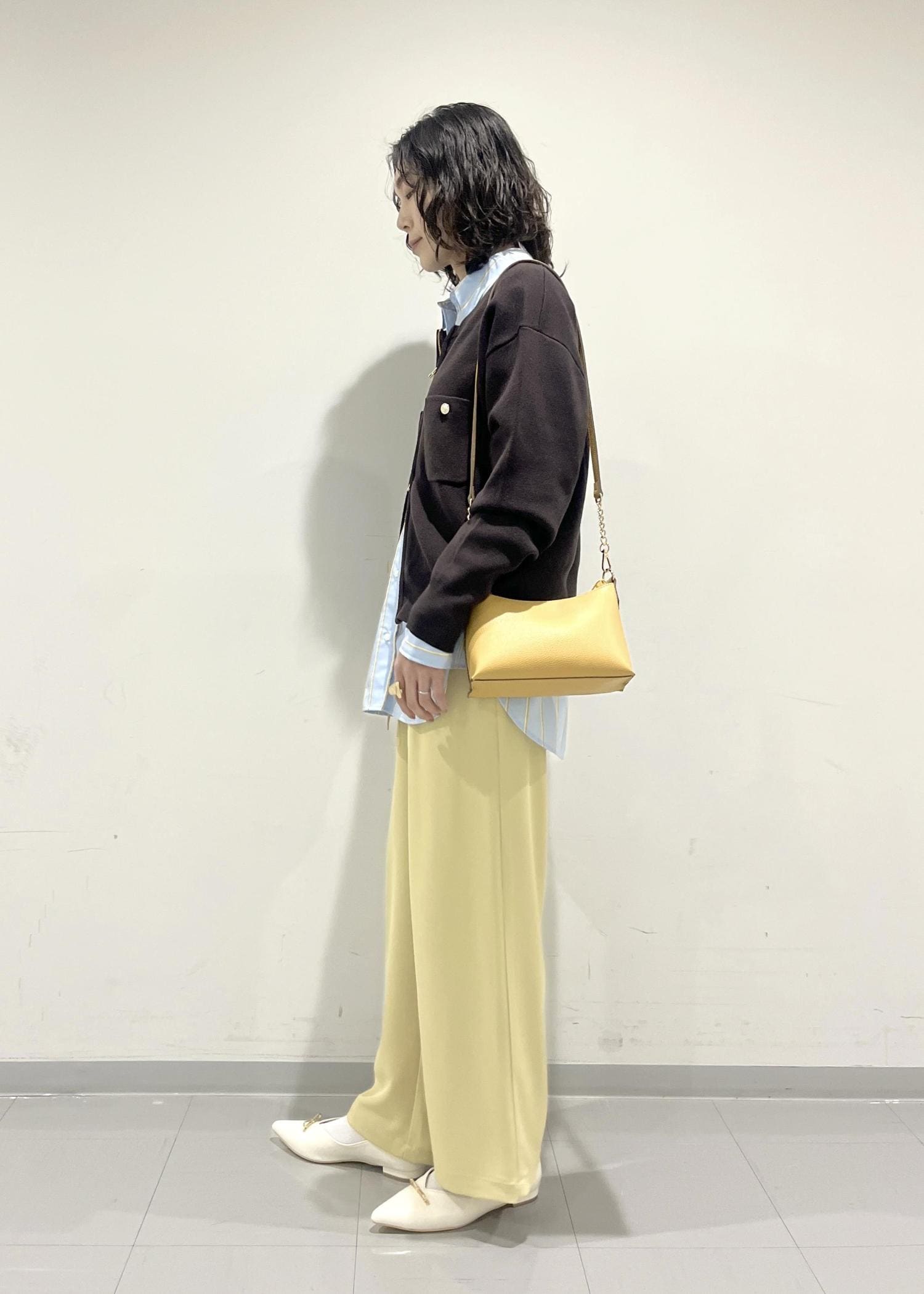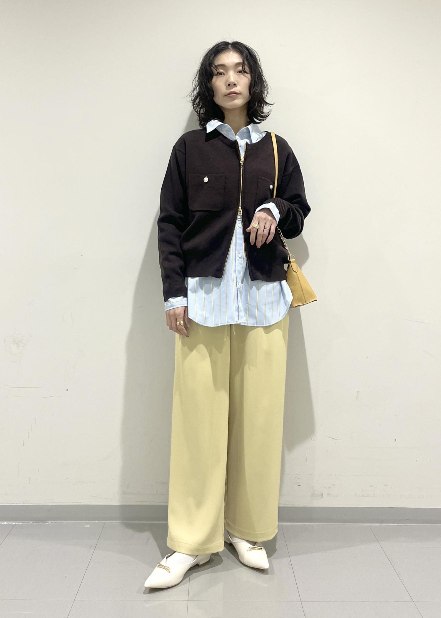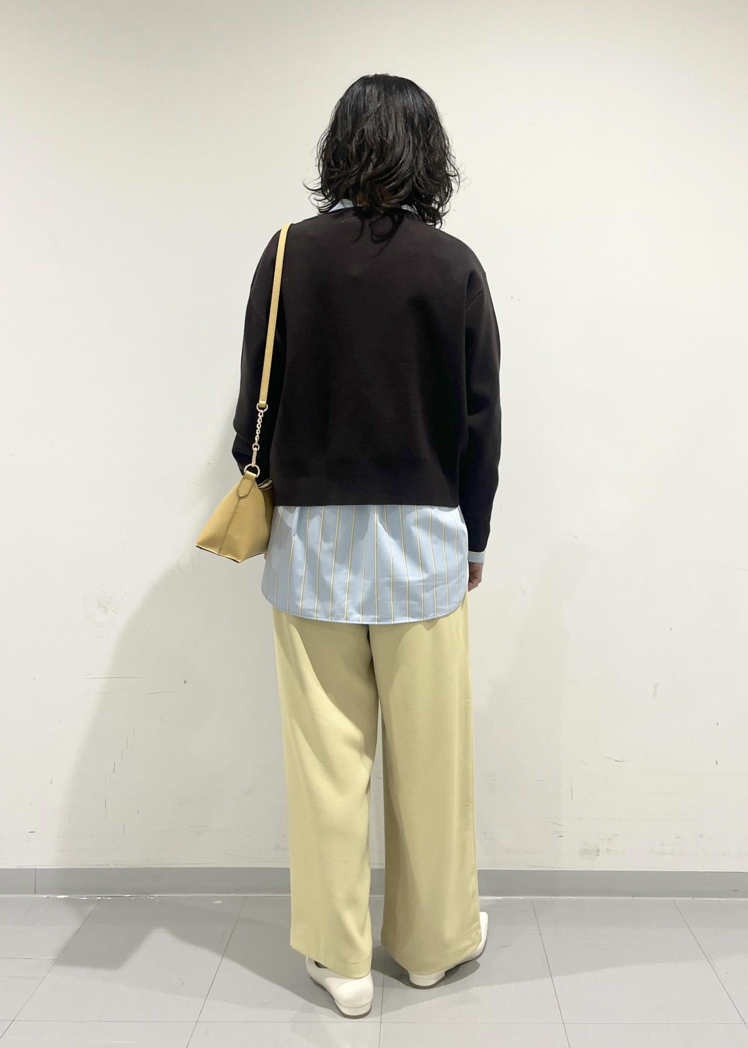ダークブラウンのトップスも淡いブルーやイエローとの組み合わせで春にも使いやすいアイテムになります。