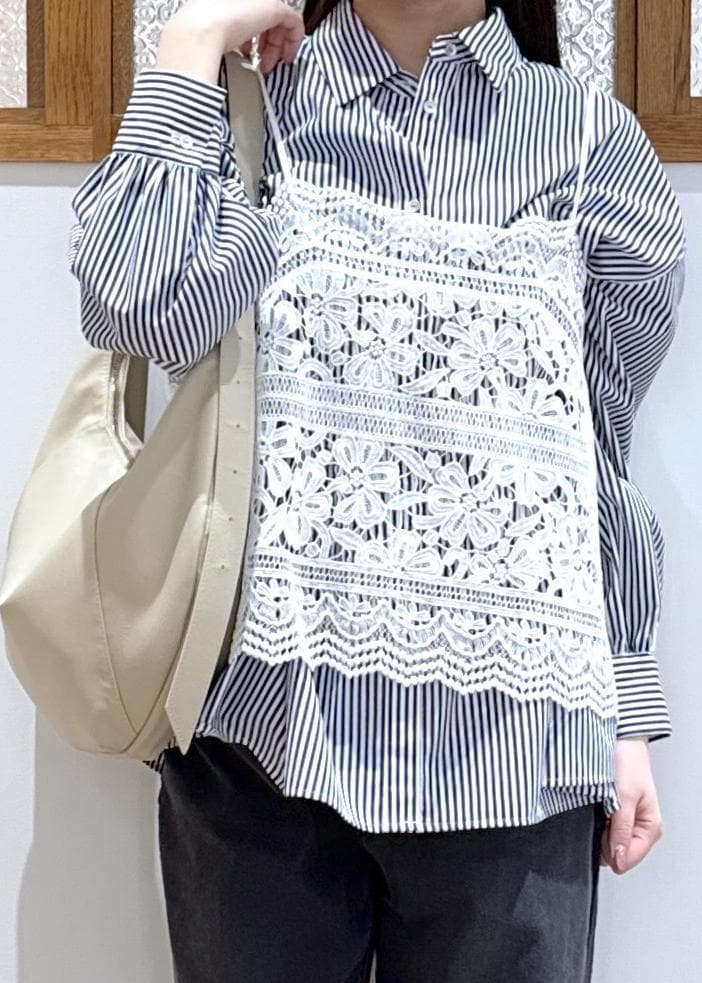 ストライプのシャツにビスチェをレイヤードした簡単お洒落見えコーデです。