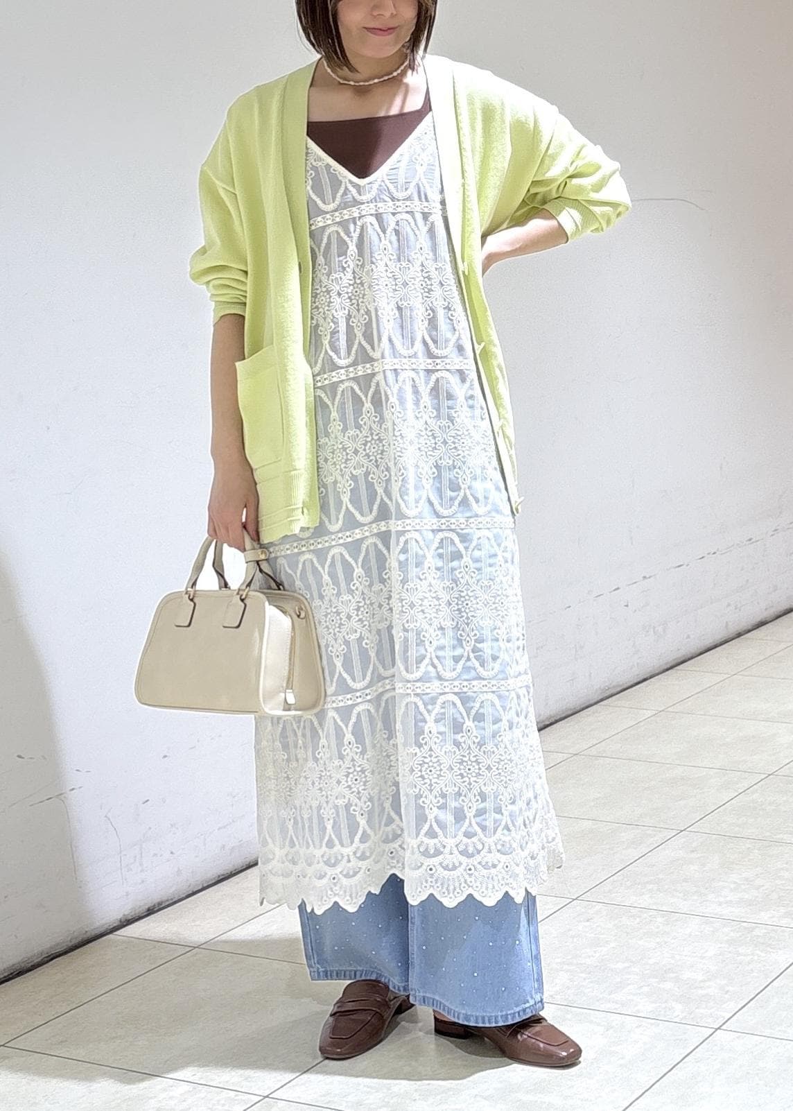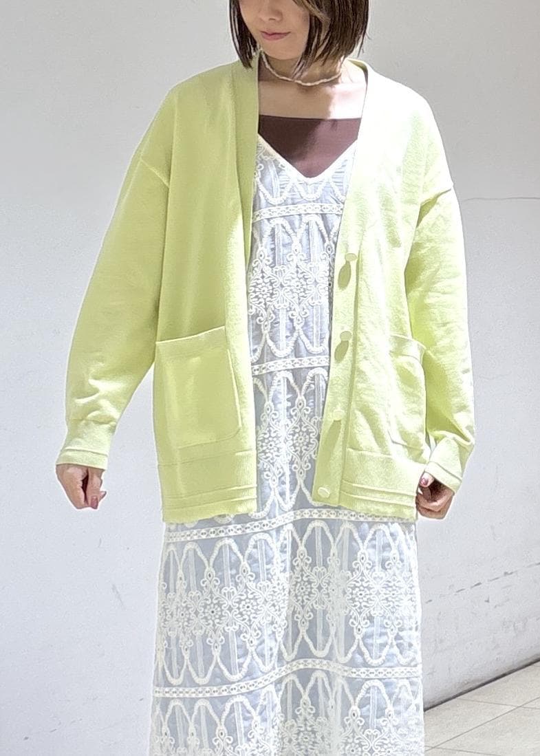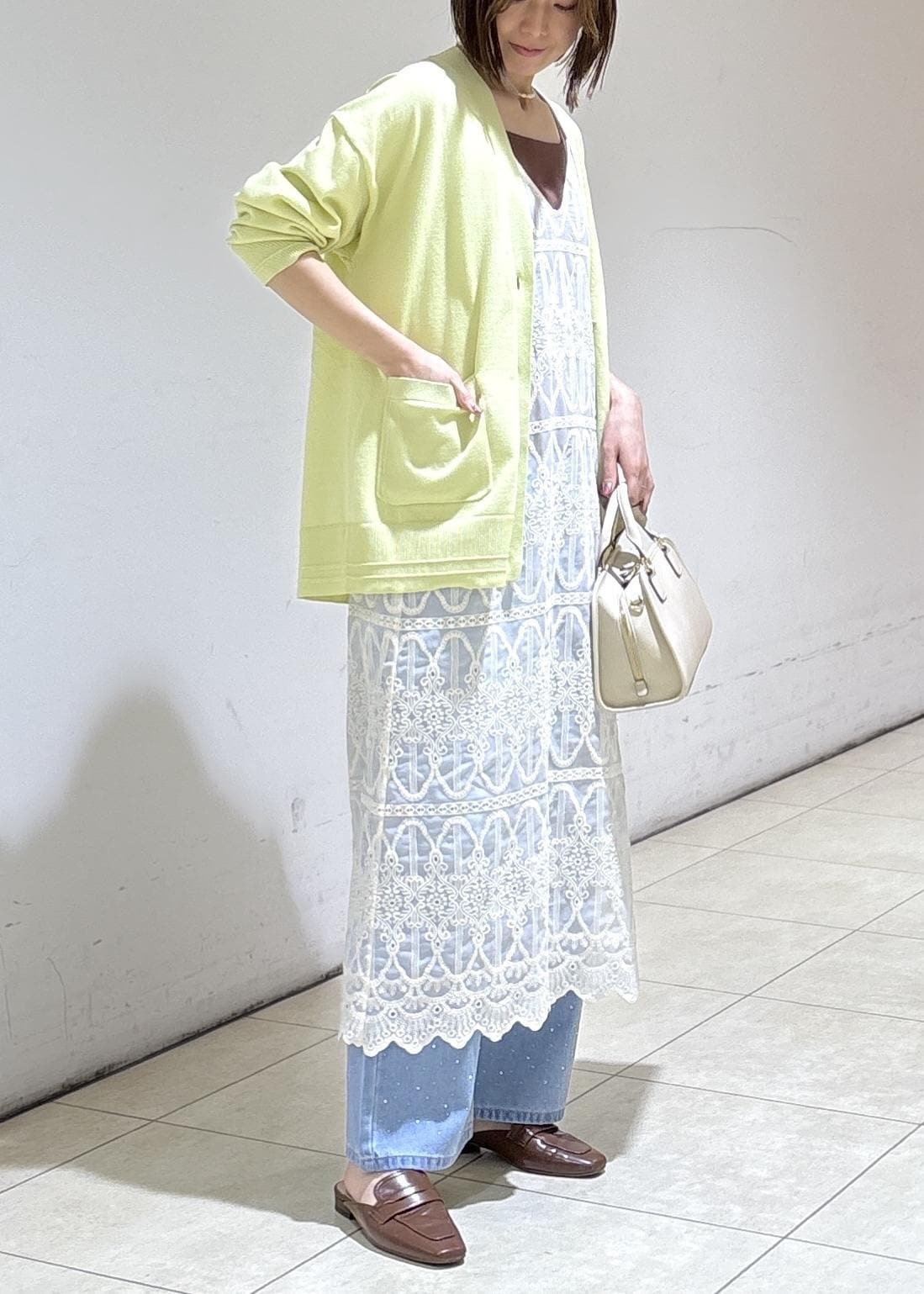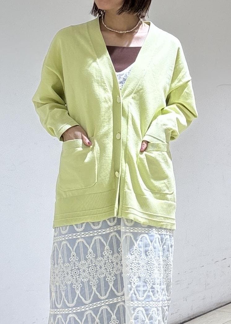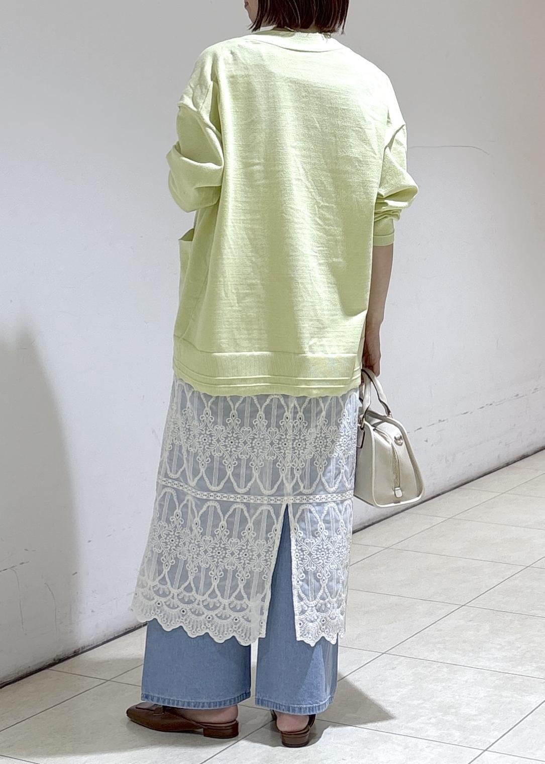春らしいカラーのカーディガンと合わせて軽やかに。