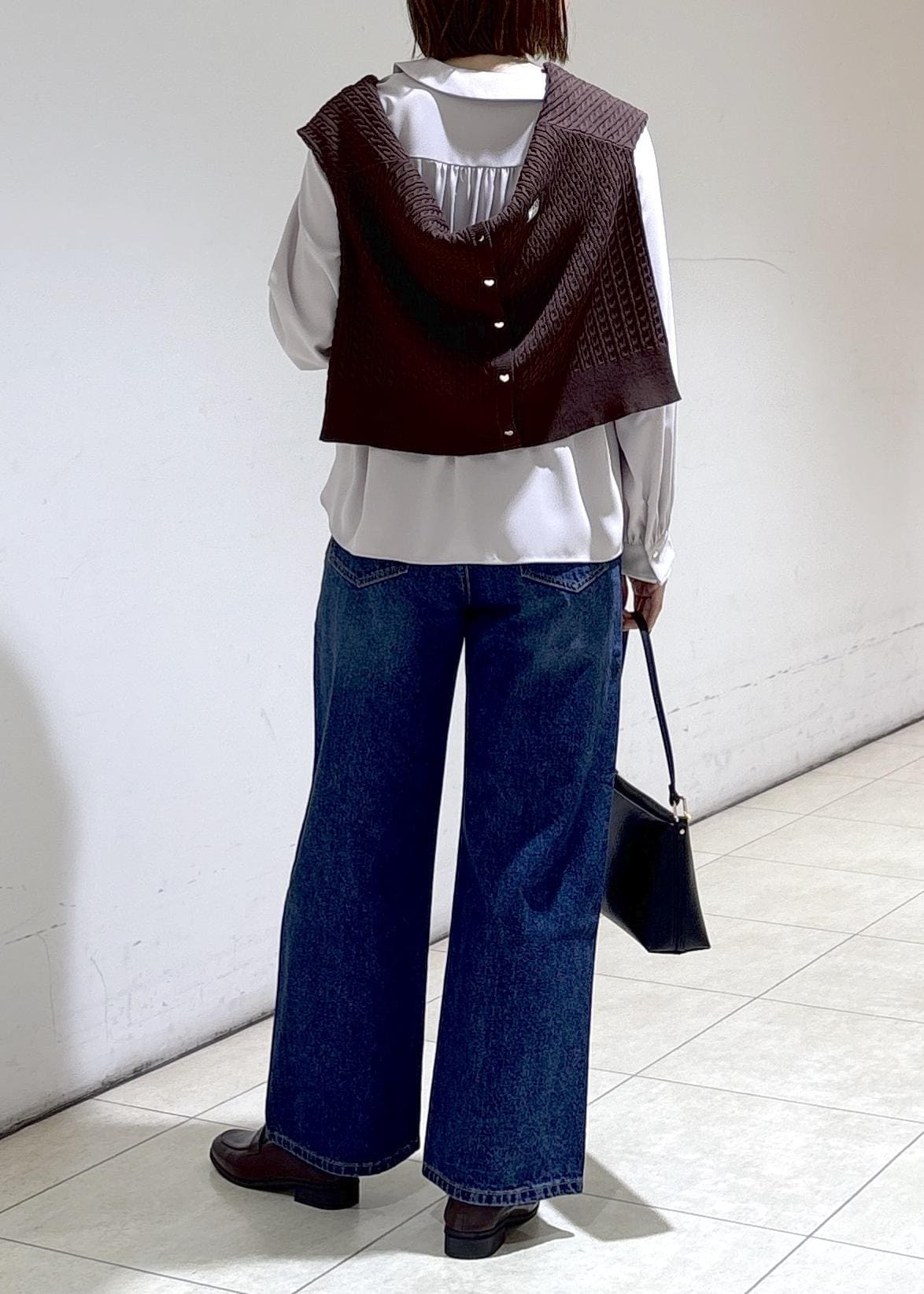 カーディガンを肩がけして
