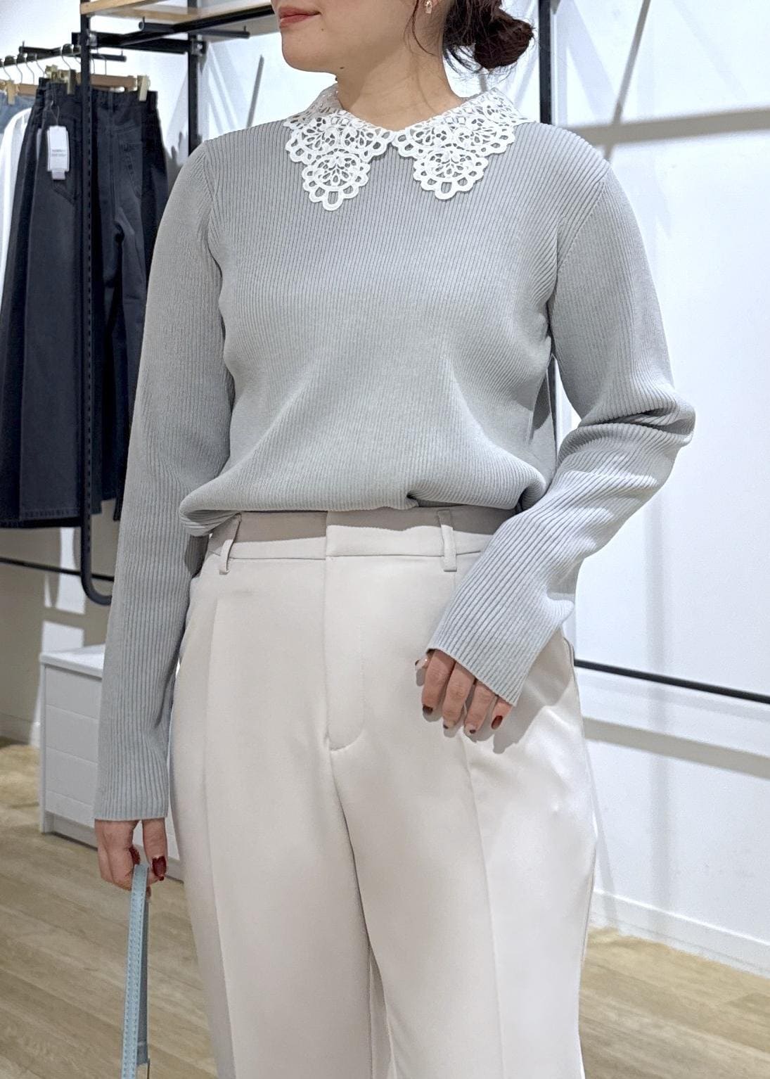トレンドのレース襟ニットで少し甘めなフェミニンスタイルに!
