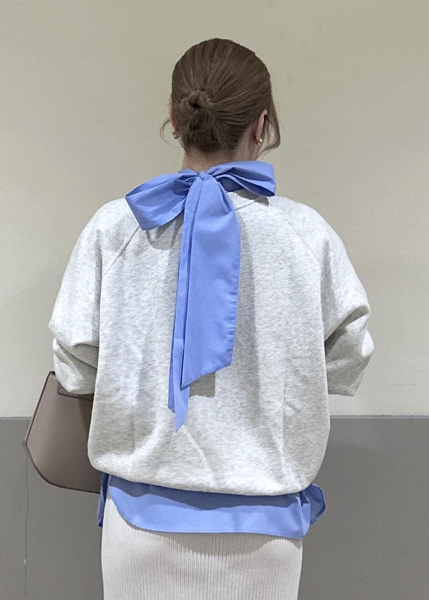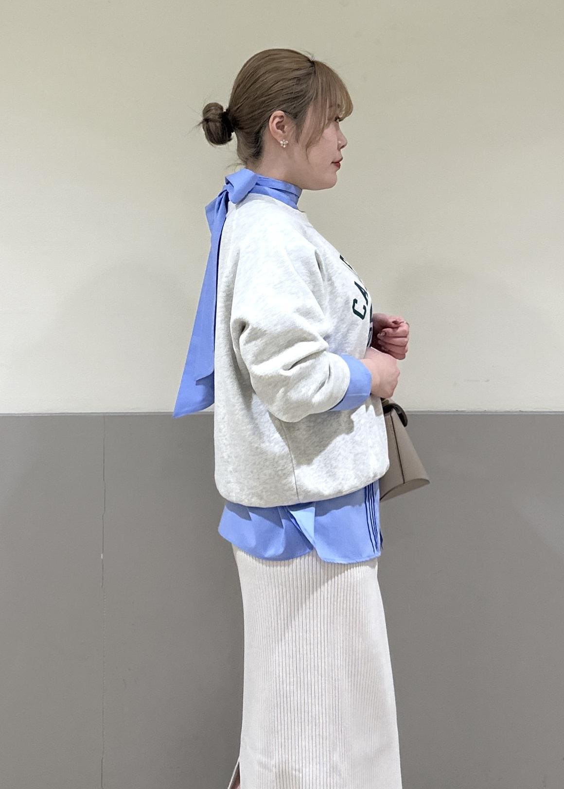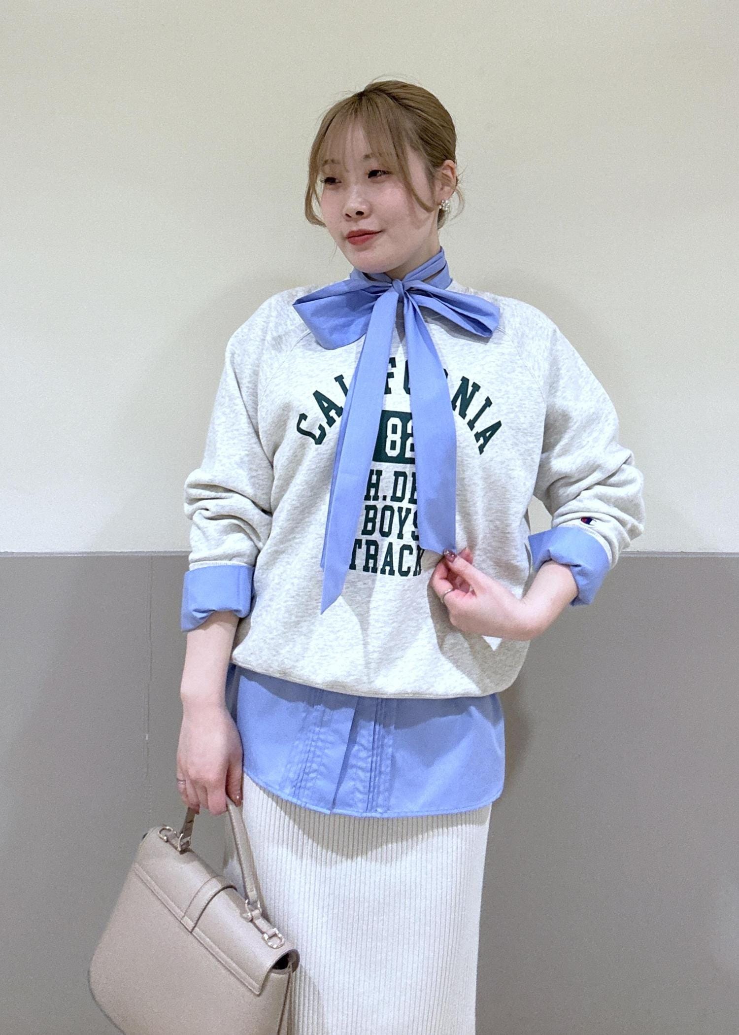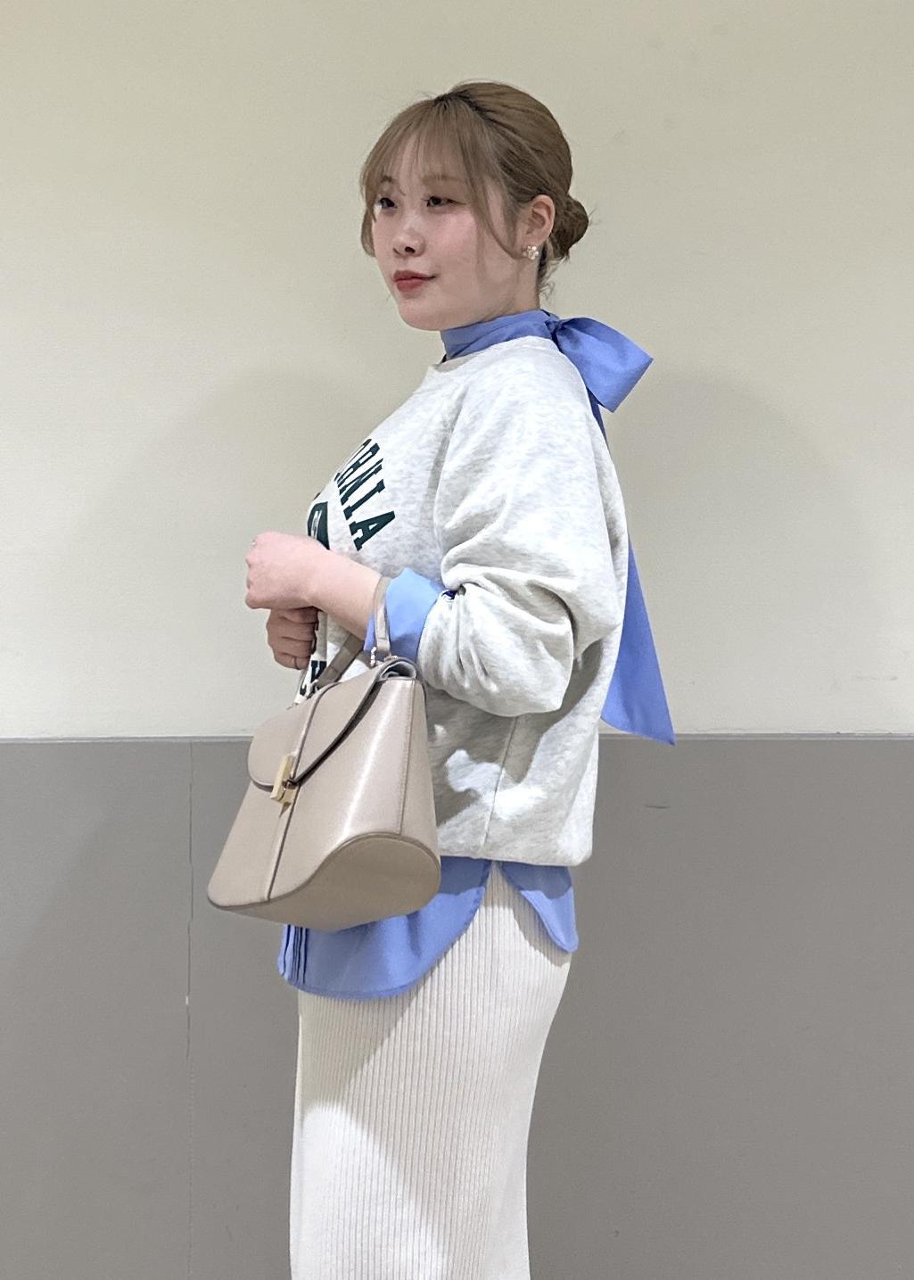 アウターを気ない季節にシンプルになるスウェットですが、レイヤードするブラウス次第で変化が出せます!