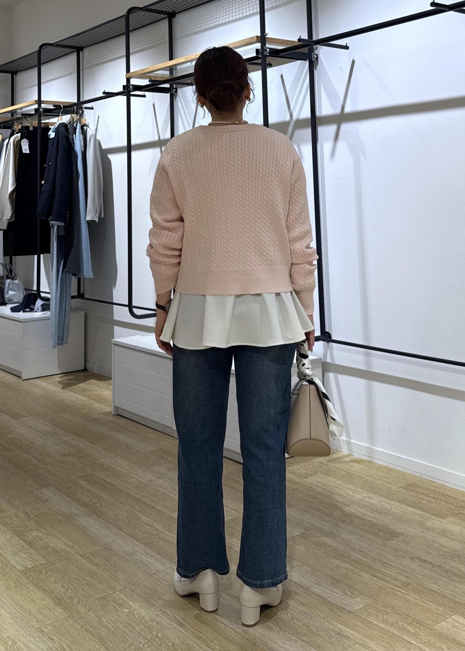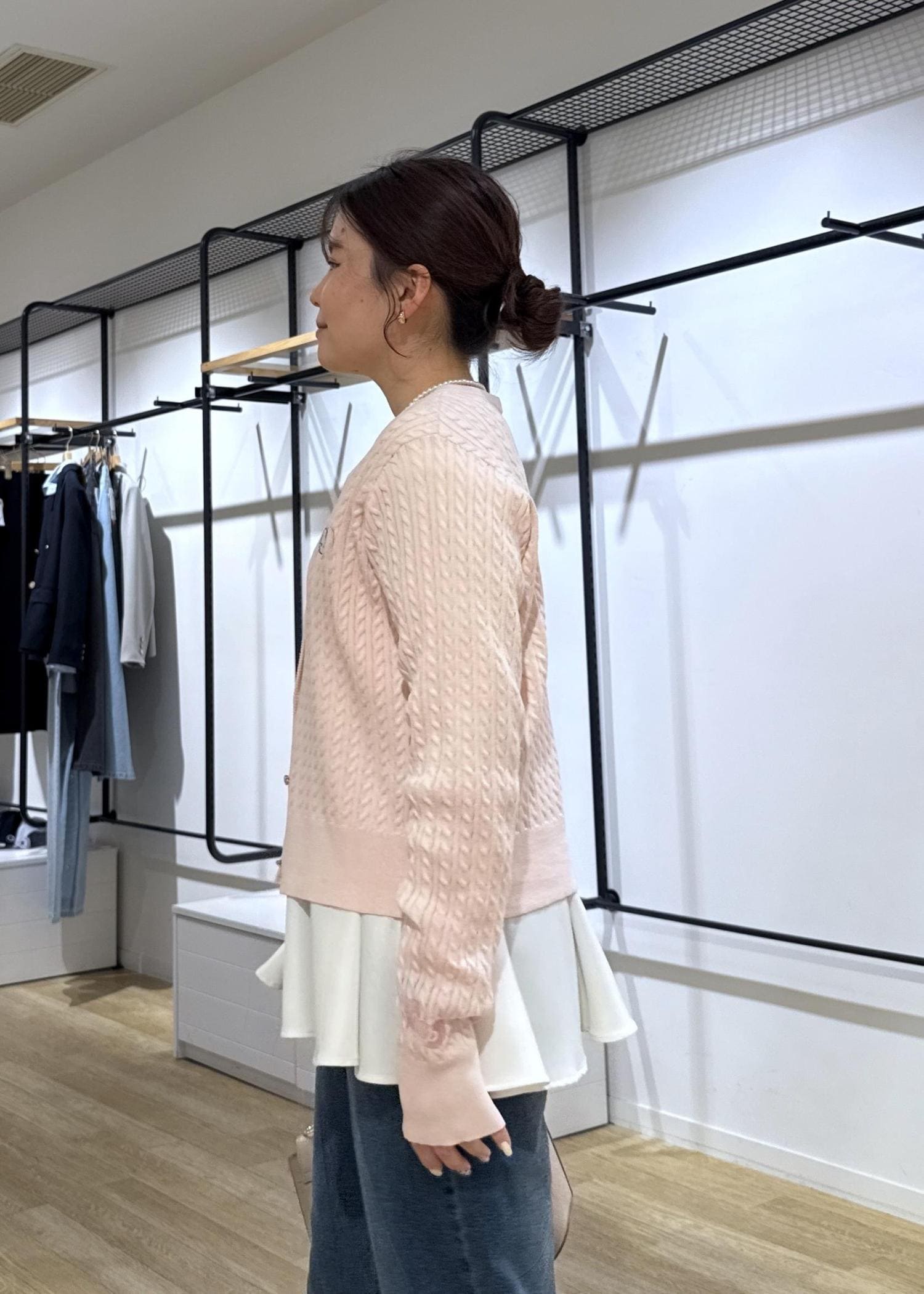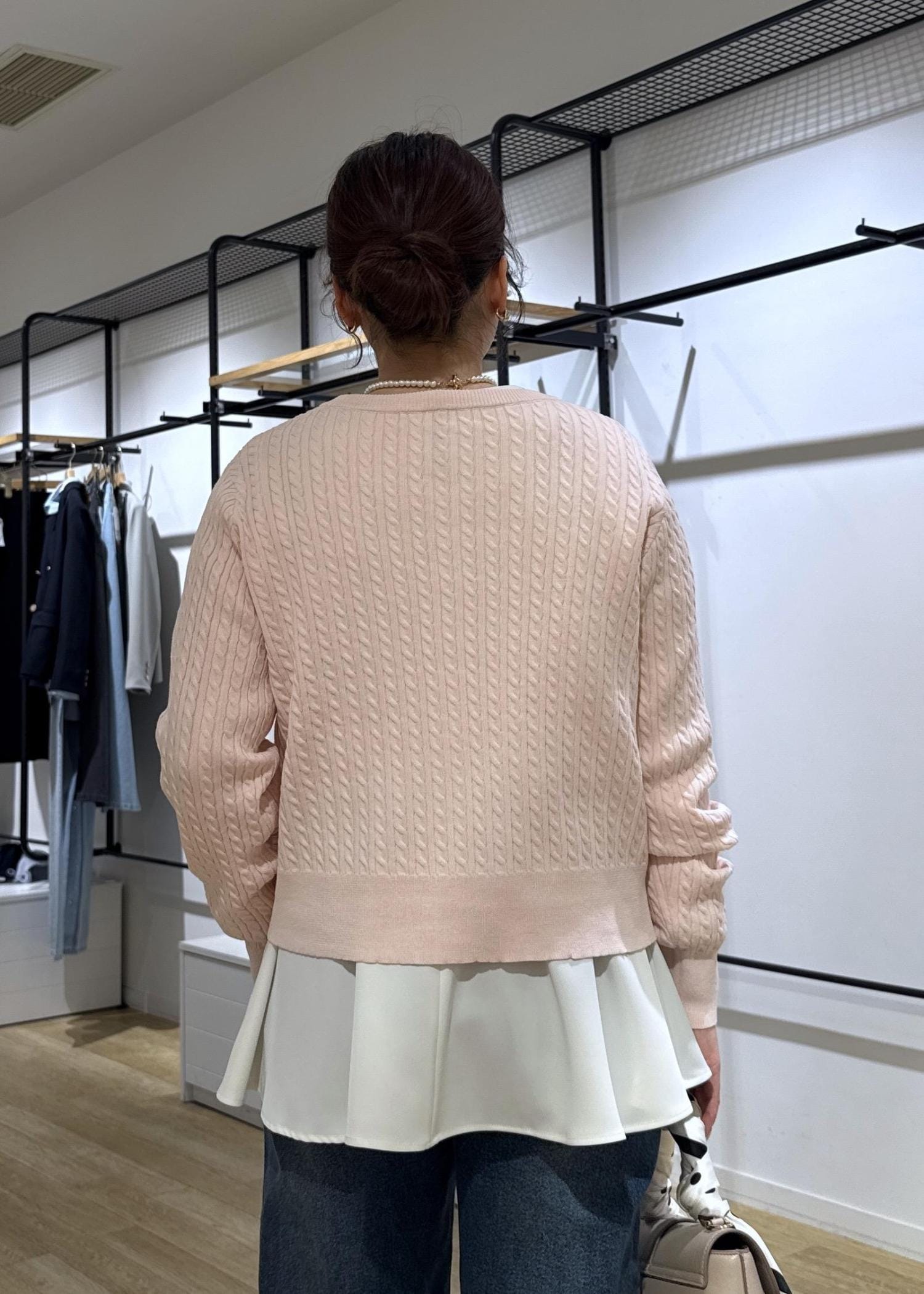 カーディガンにペプラムブラウスをレイヤードして