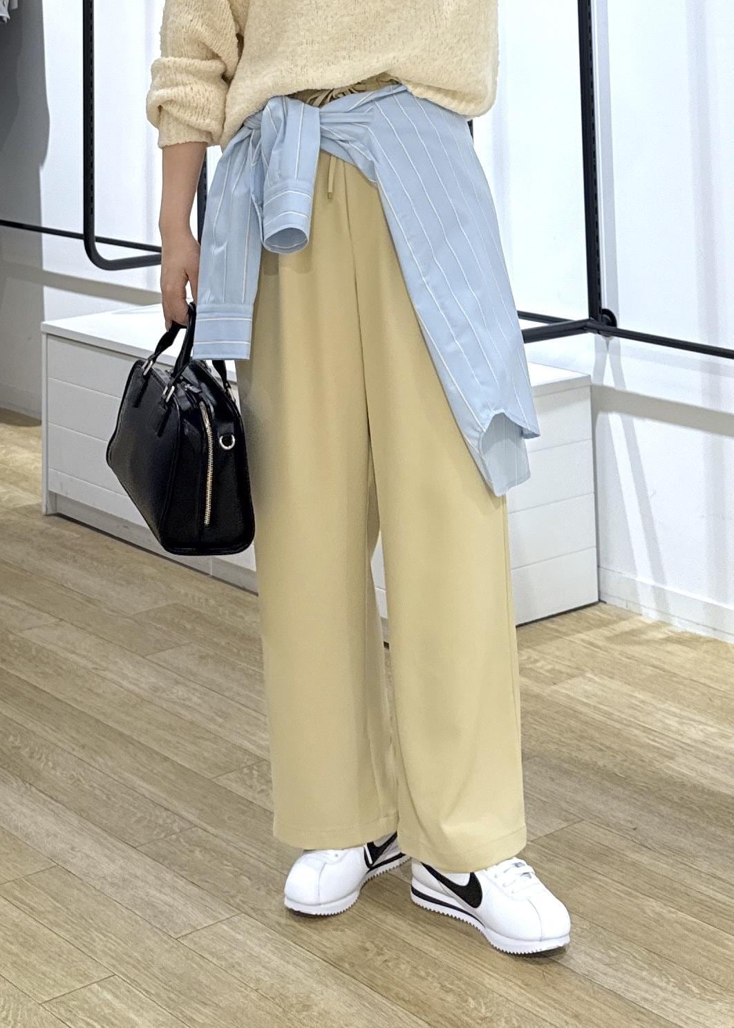 着丈がフラットシューズでも引きずらない長さで、ウエストはゴムなので履き心地ラクです◎