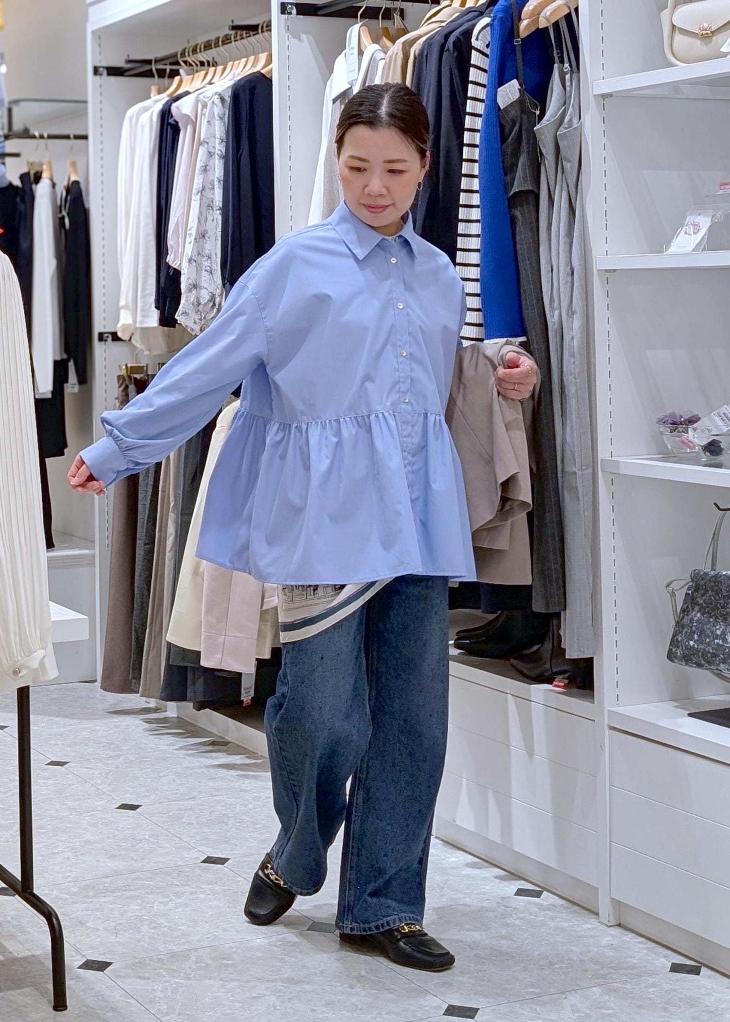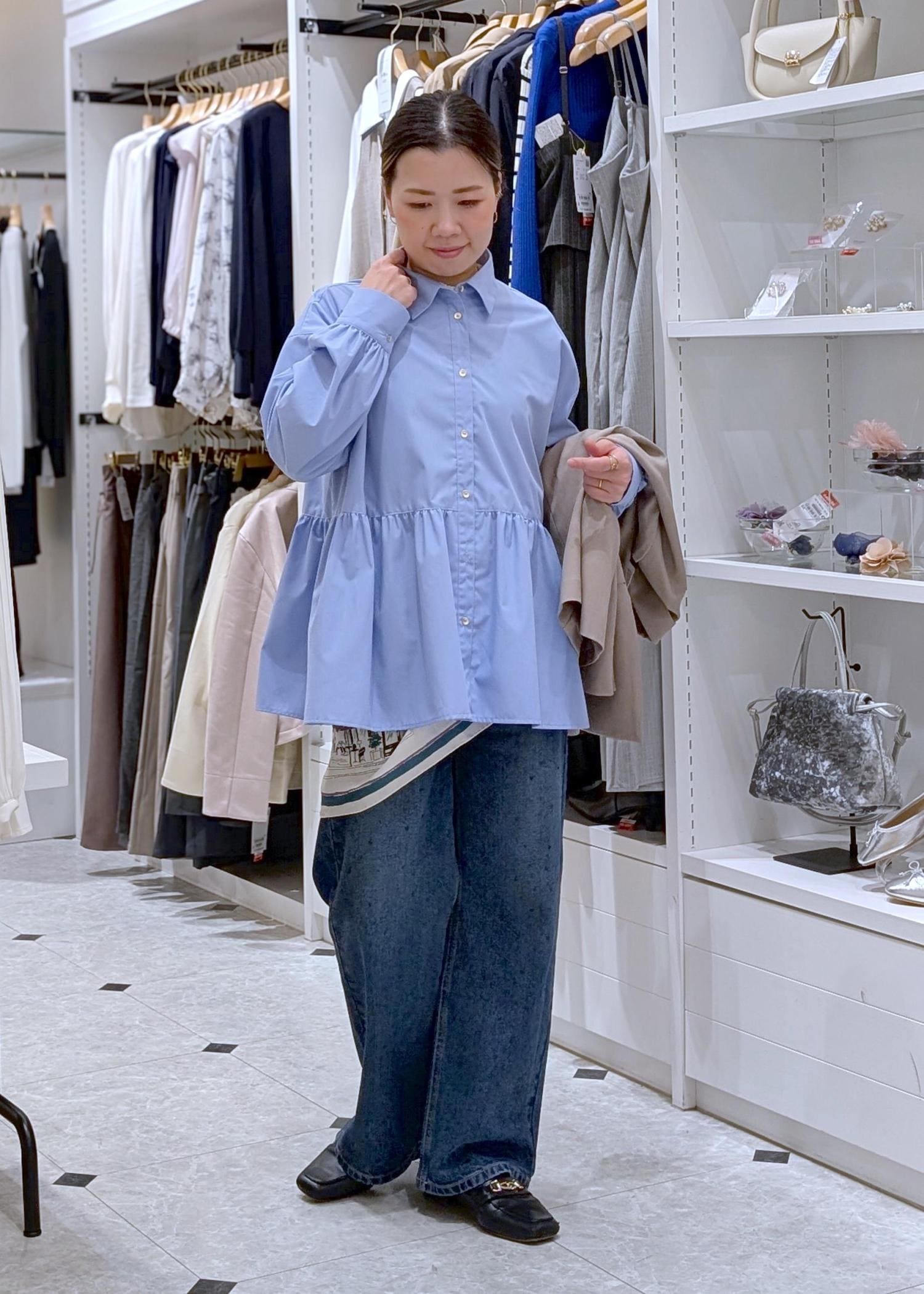 ブルーのペプラムシャツは、ジャケットを脱いだ時も可愛く着こなせます。