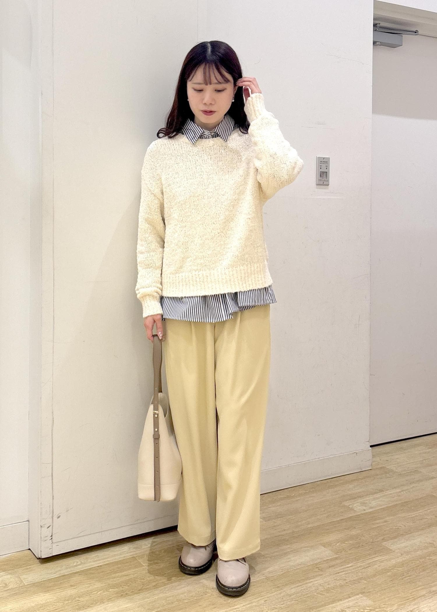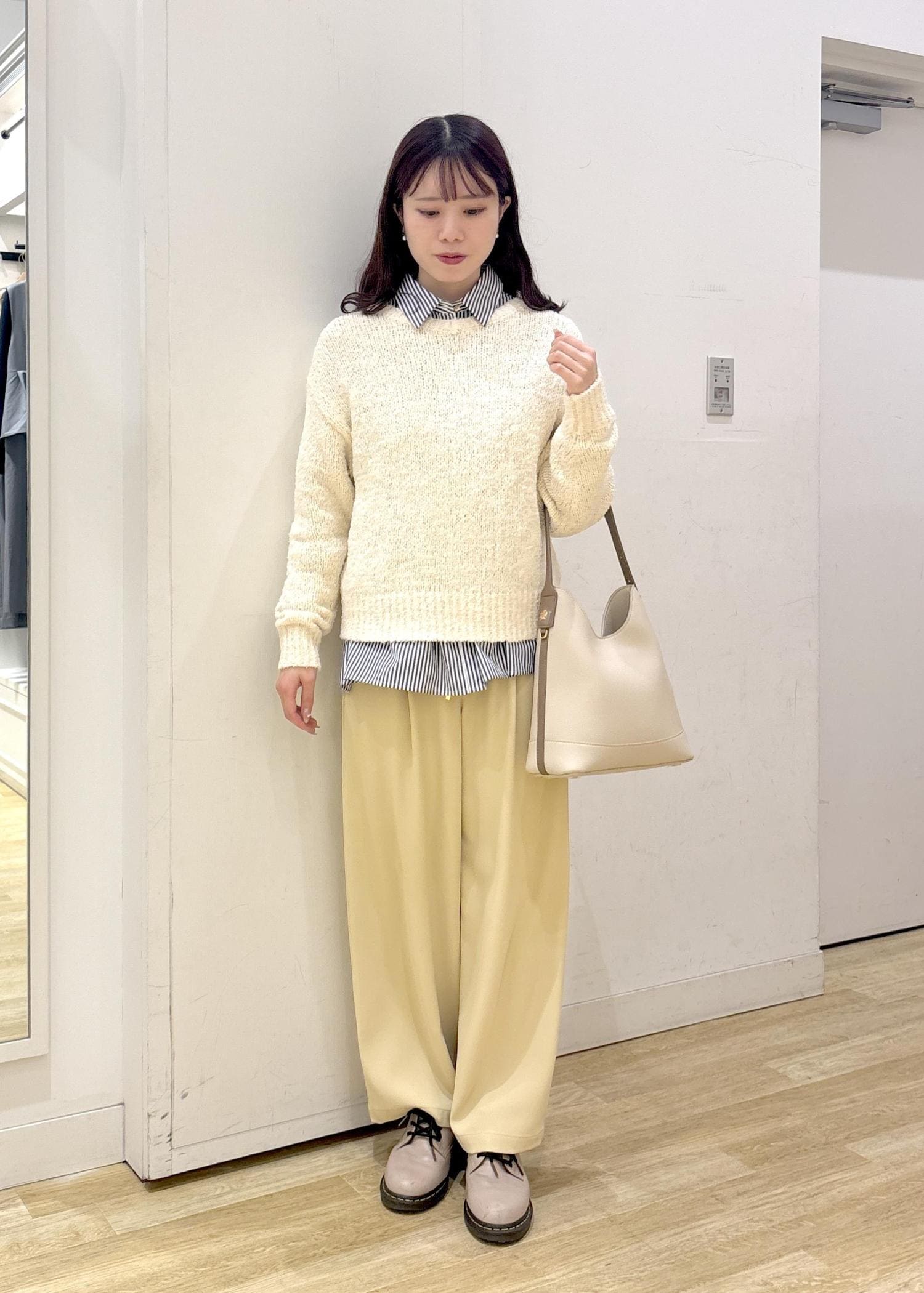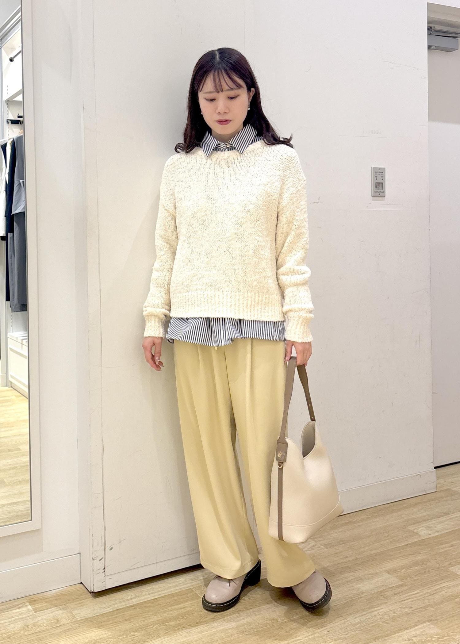 ストライプシャツをレイヤードすることで淡すぎず、トレンド感のあるコーディネートに仕上げました◎