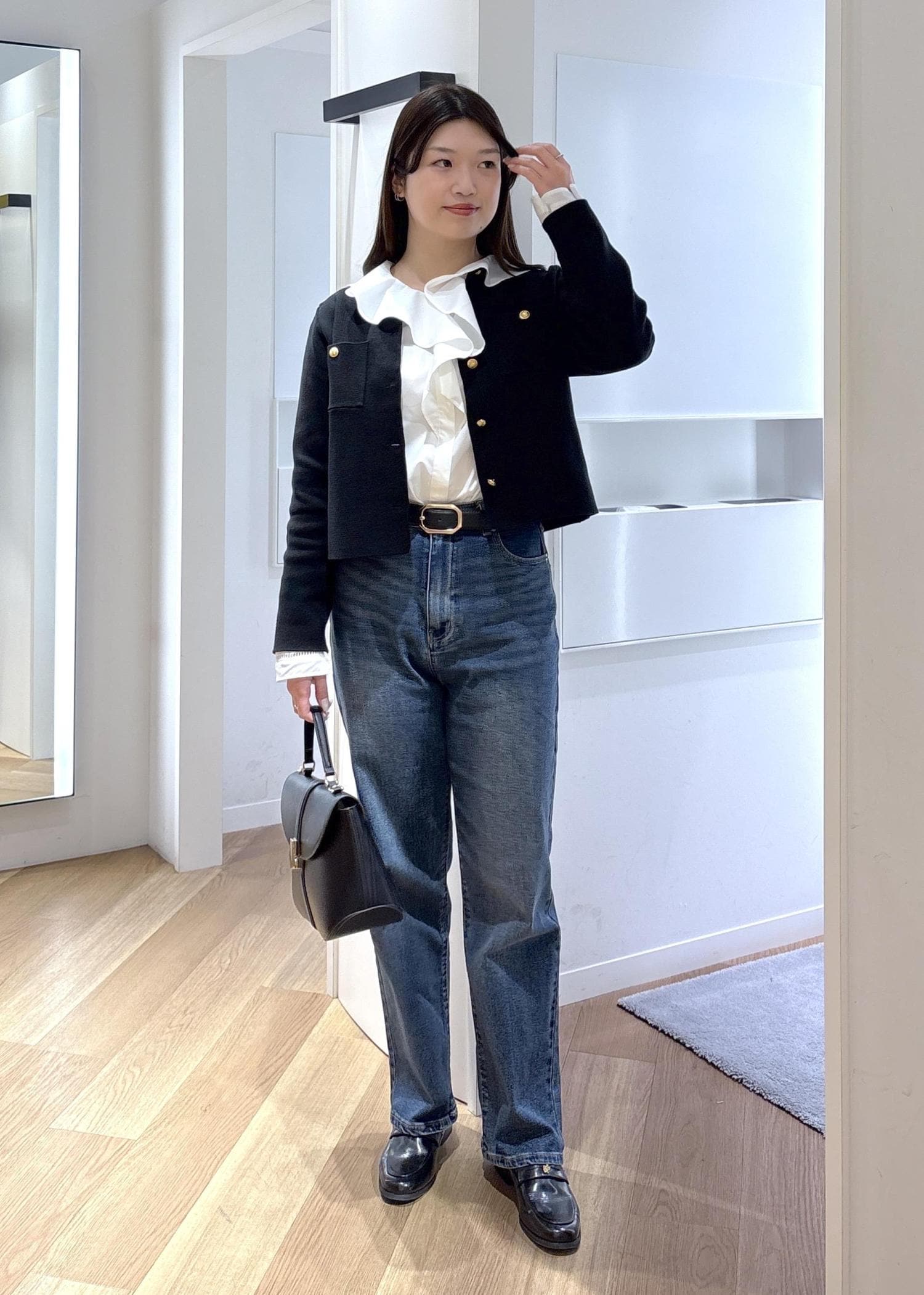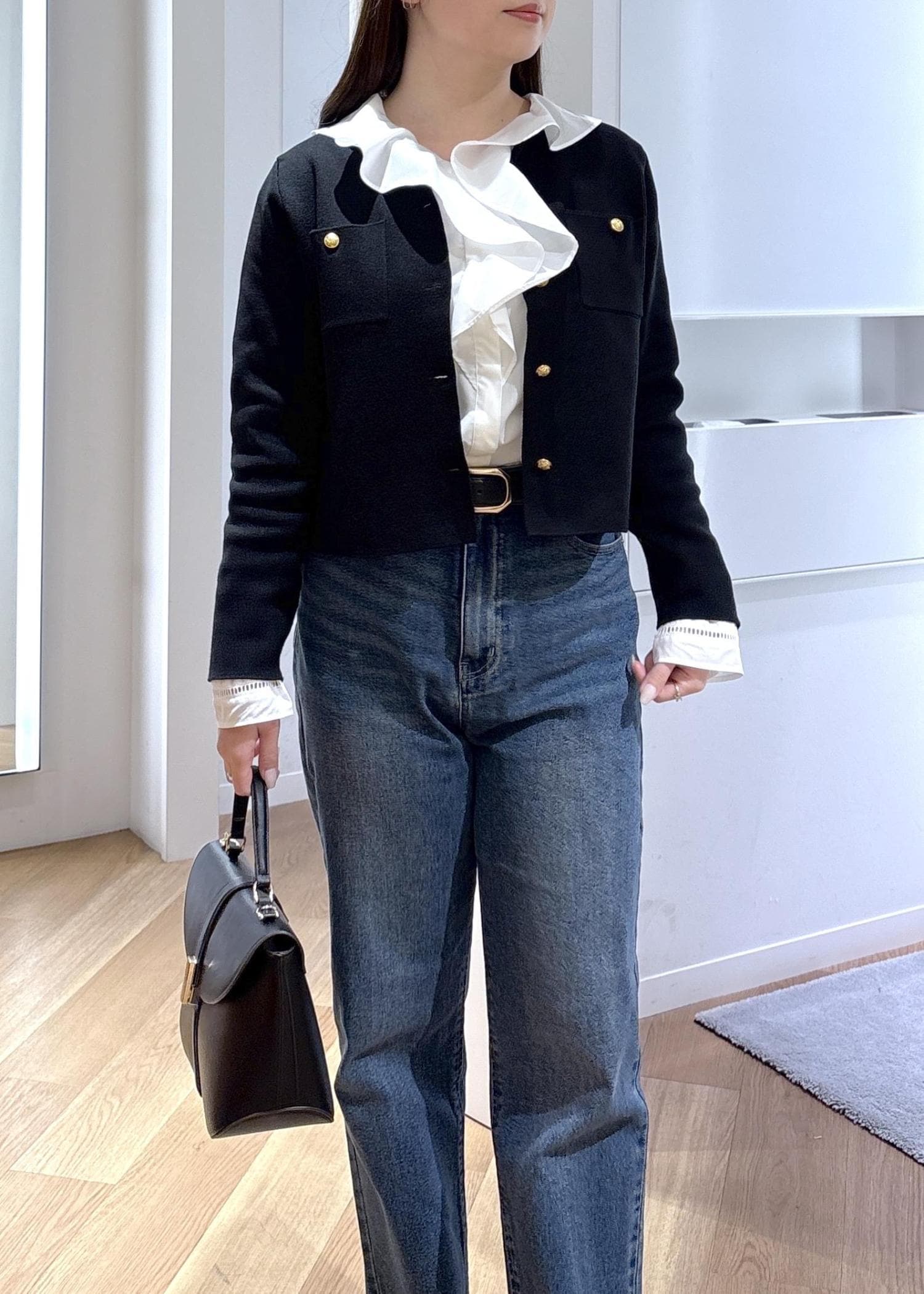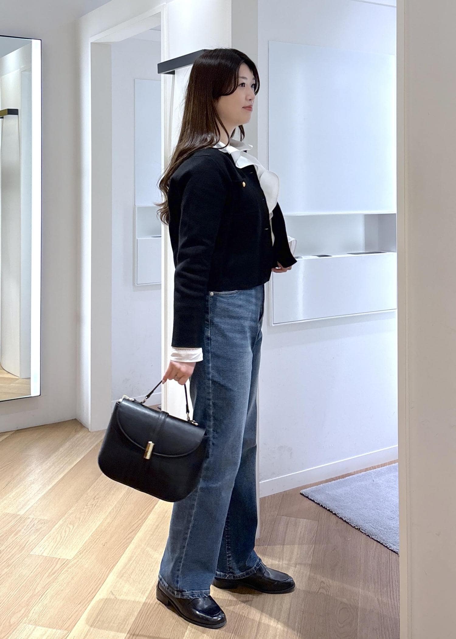 スッキリ見えるコンパクトな形ですが、中にシャツや薄手のニットをインできるゆとりがあります。