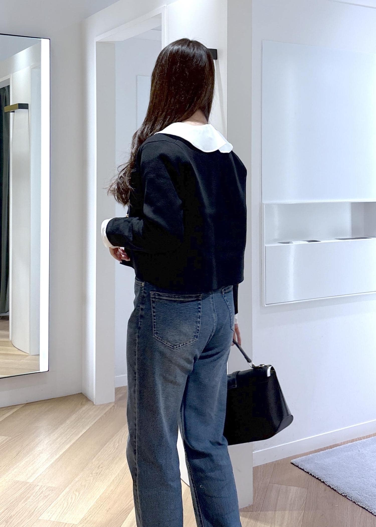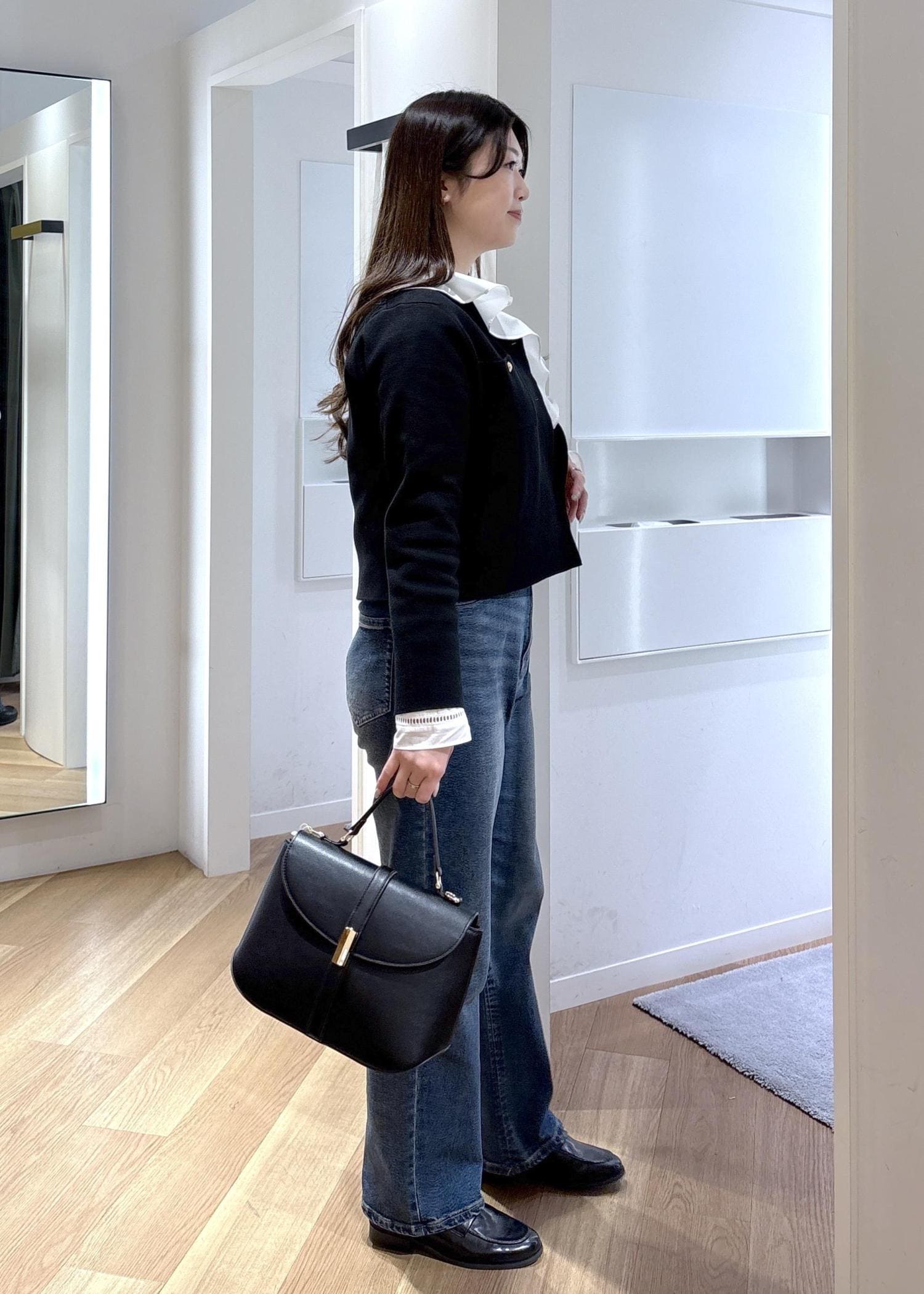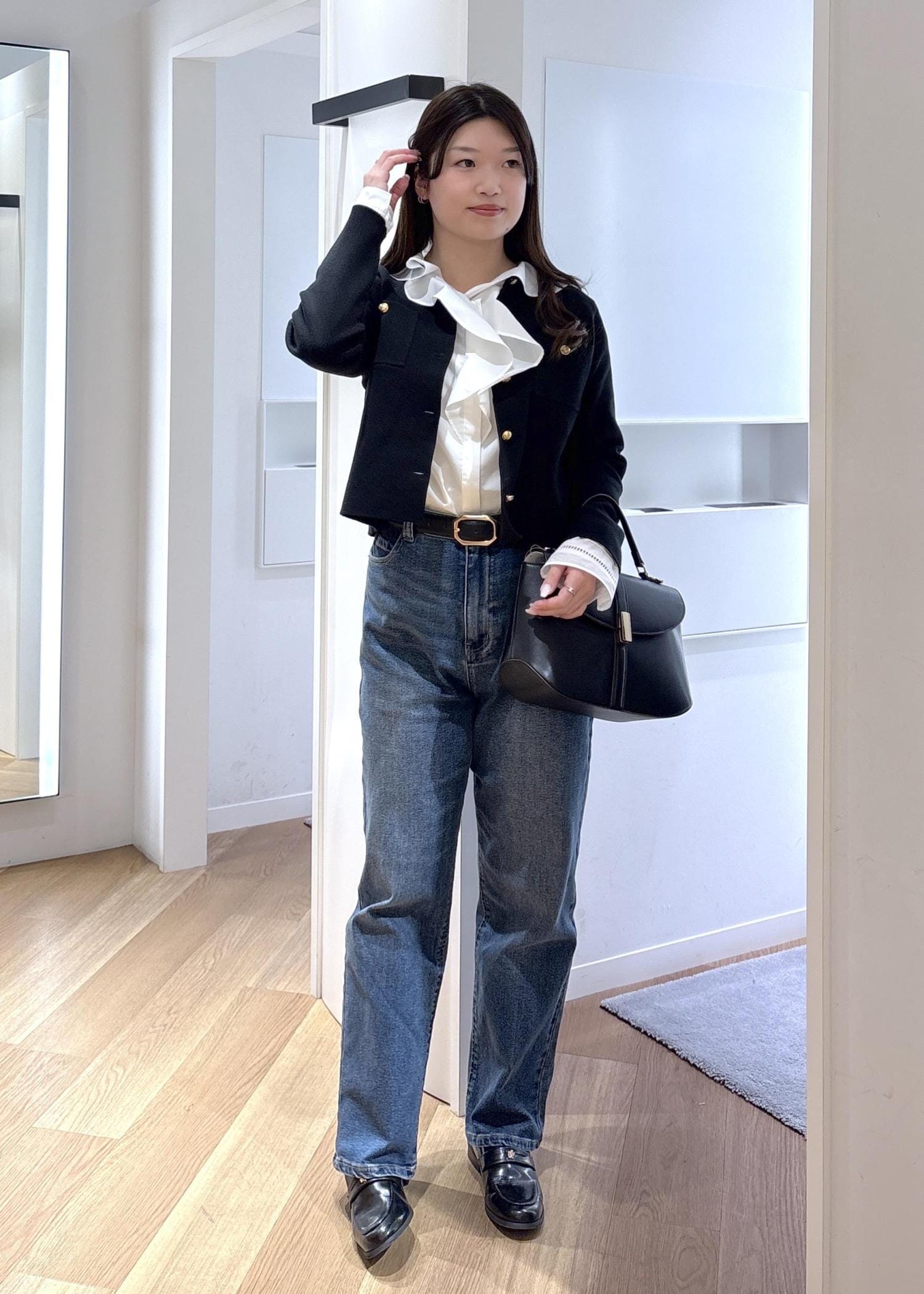 スッキリ見えるコンパクトな形ですが、中にシャツや薄手のニットをインできるゆとりがあります。