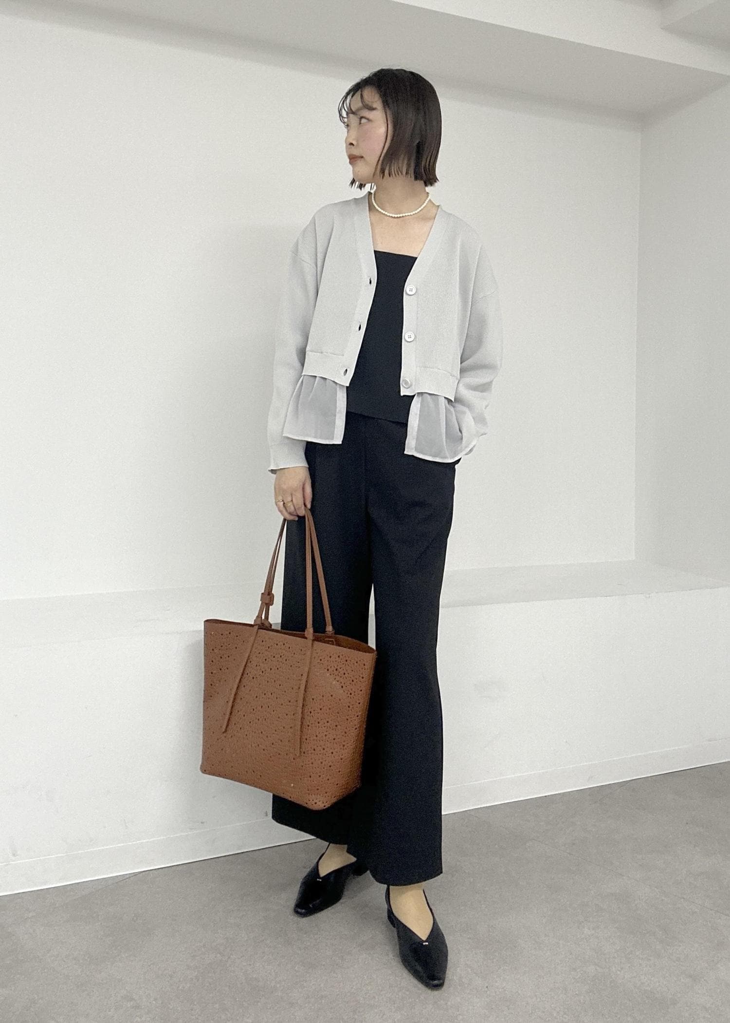 ブラックとグレーの落ち着いたカラーで合わせたオールインワンコーデに、春夏らしいブラウンのバッグでお出かけ♪
