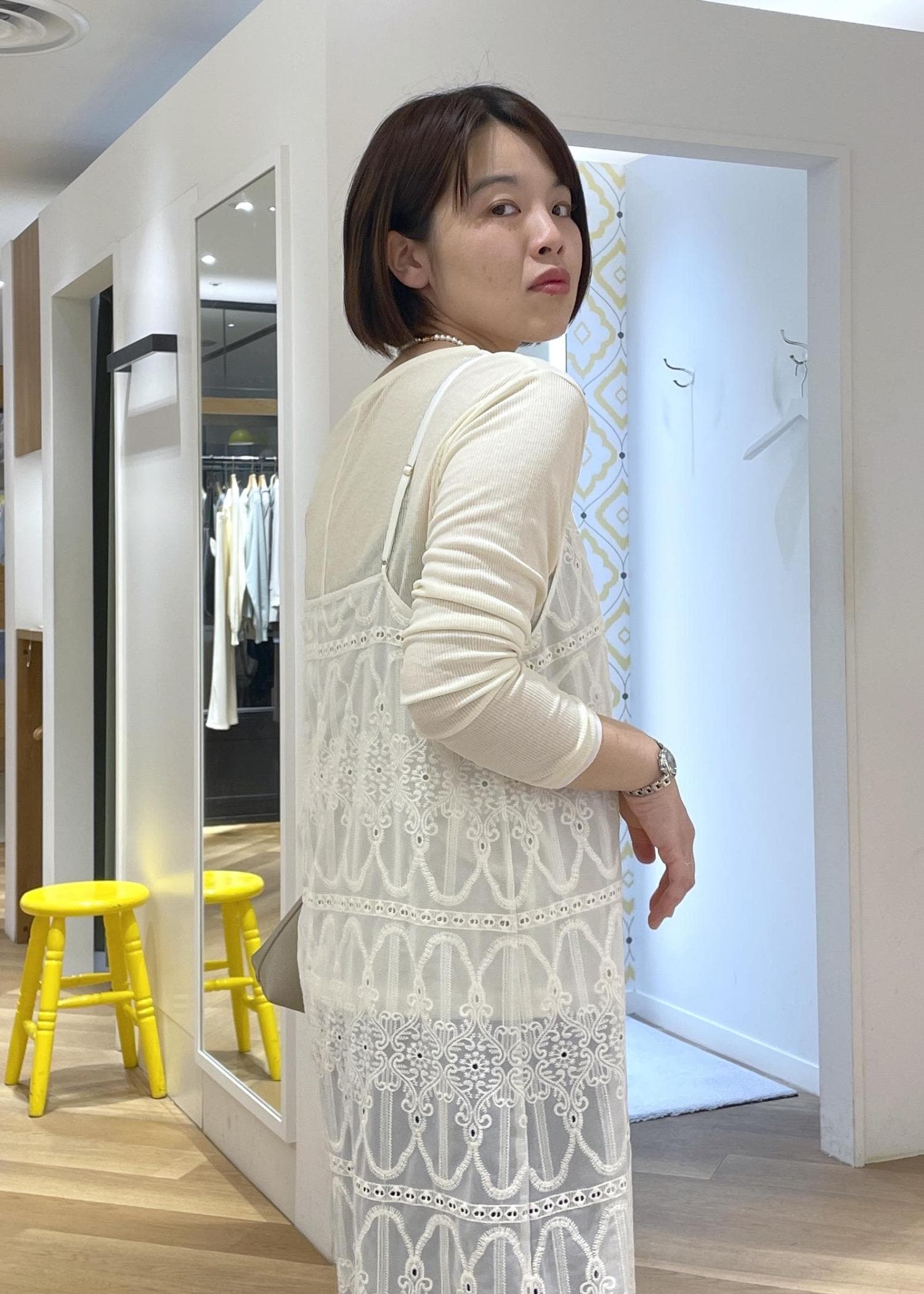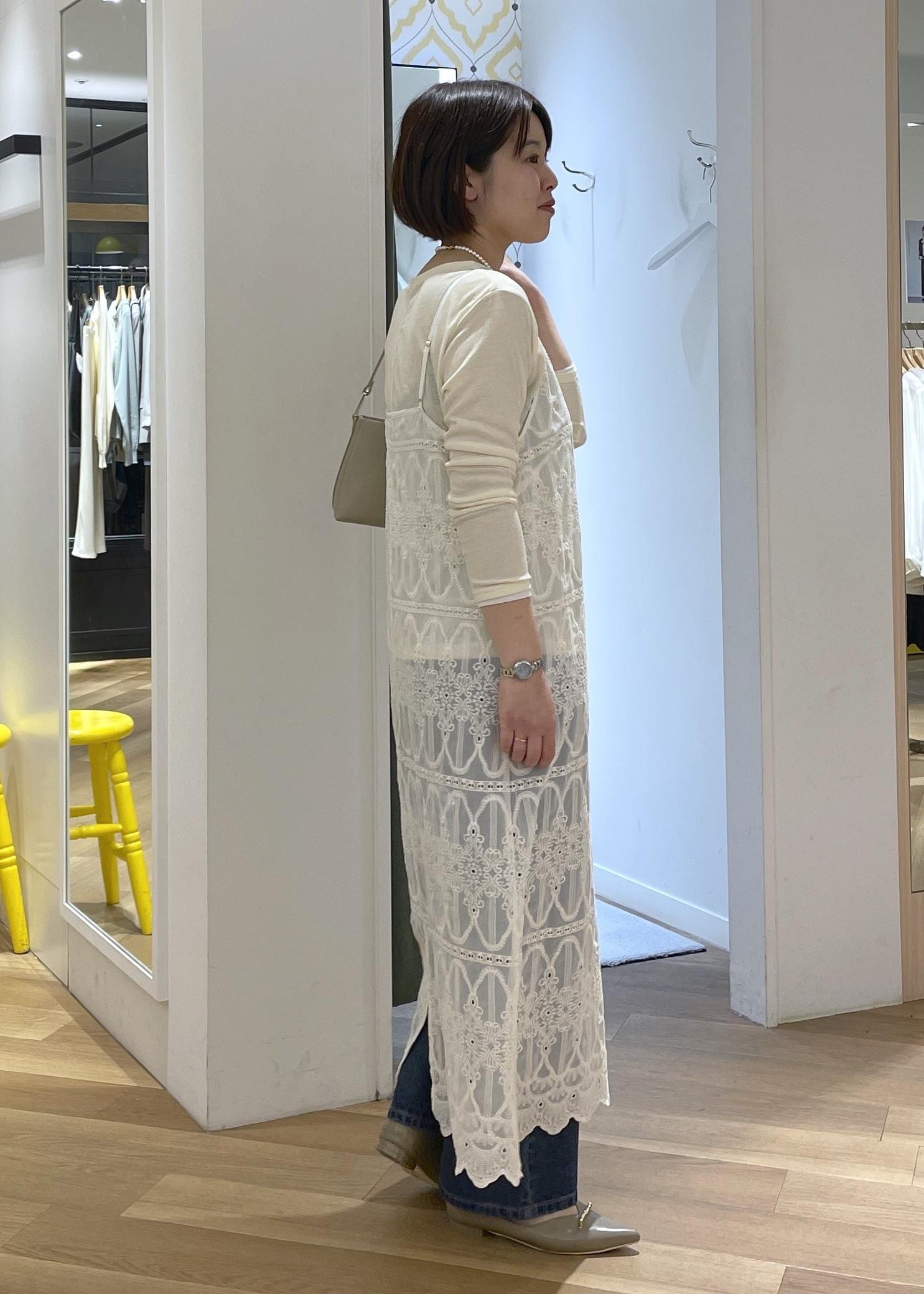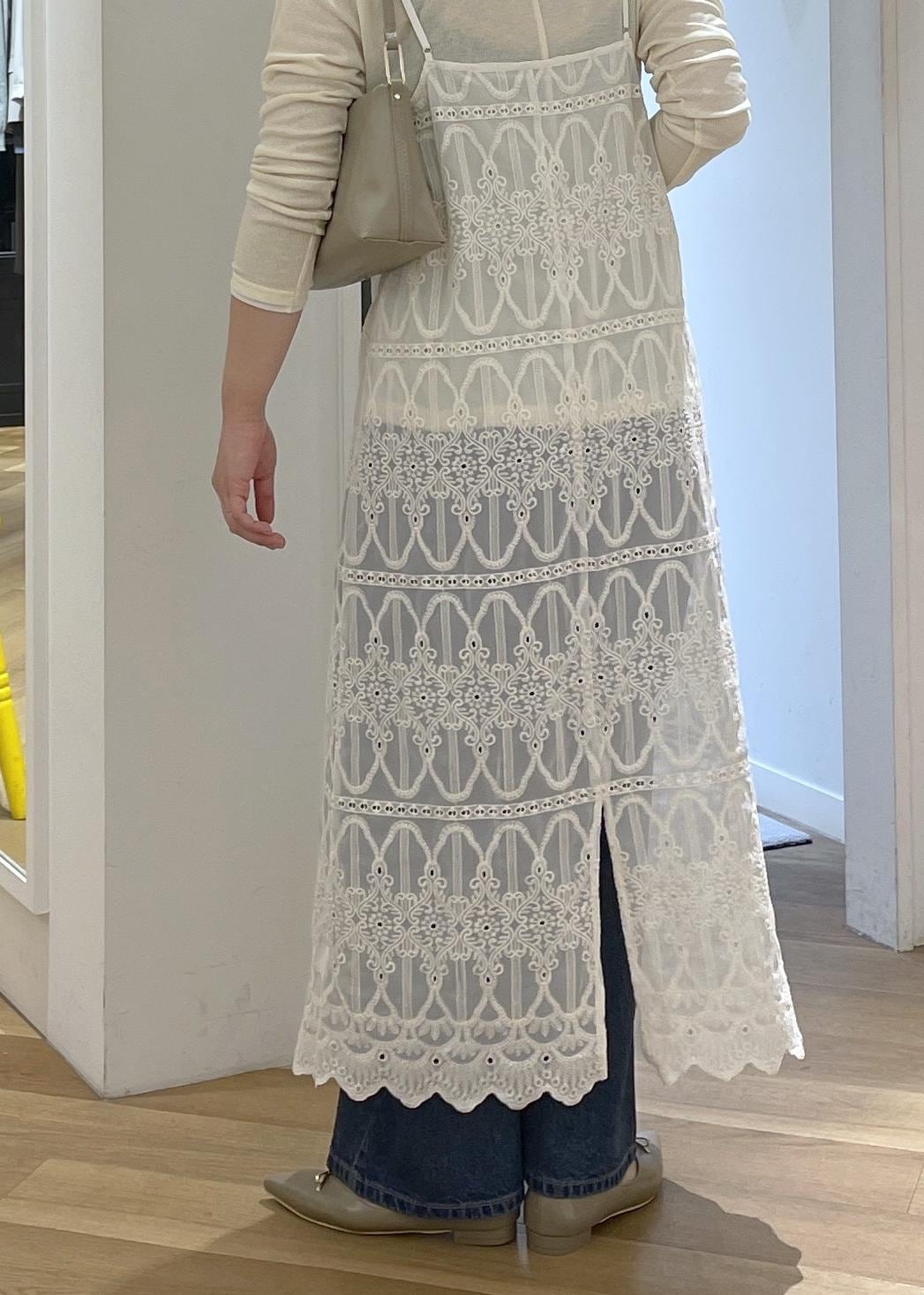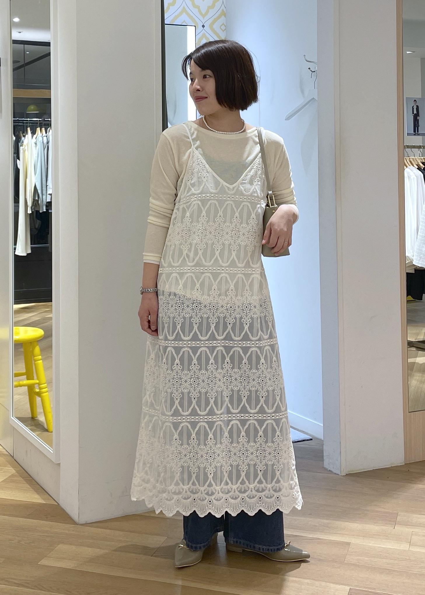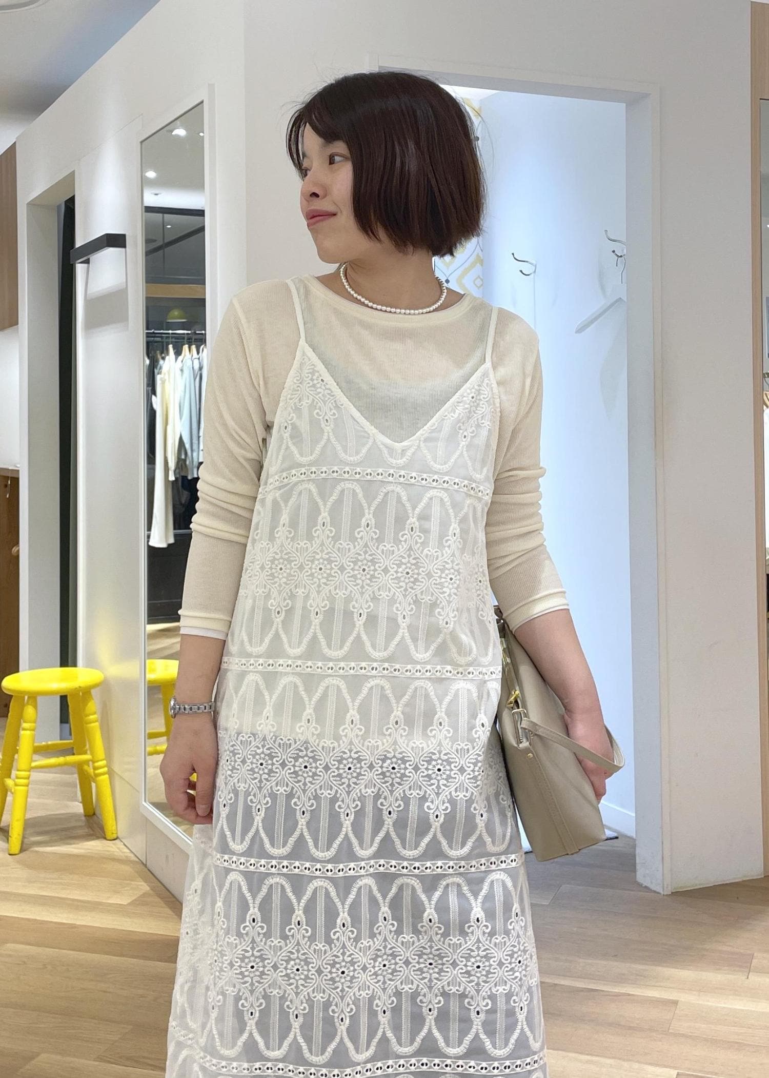 総レースデザインがトレンド感のあるキャミワンピースです。軽やかな生地感で、春夏のレイヤードコーデにもぴったりです。身頃は程良くゆとりがあります。着丈はふくらはぎが隠れるくらいの長さです。