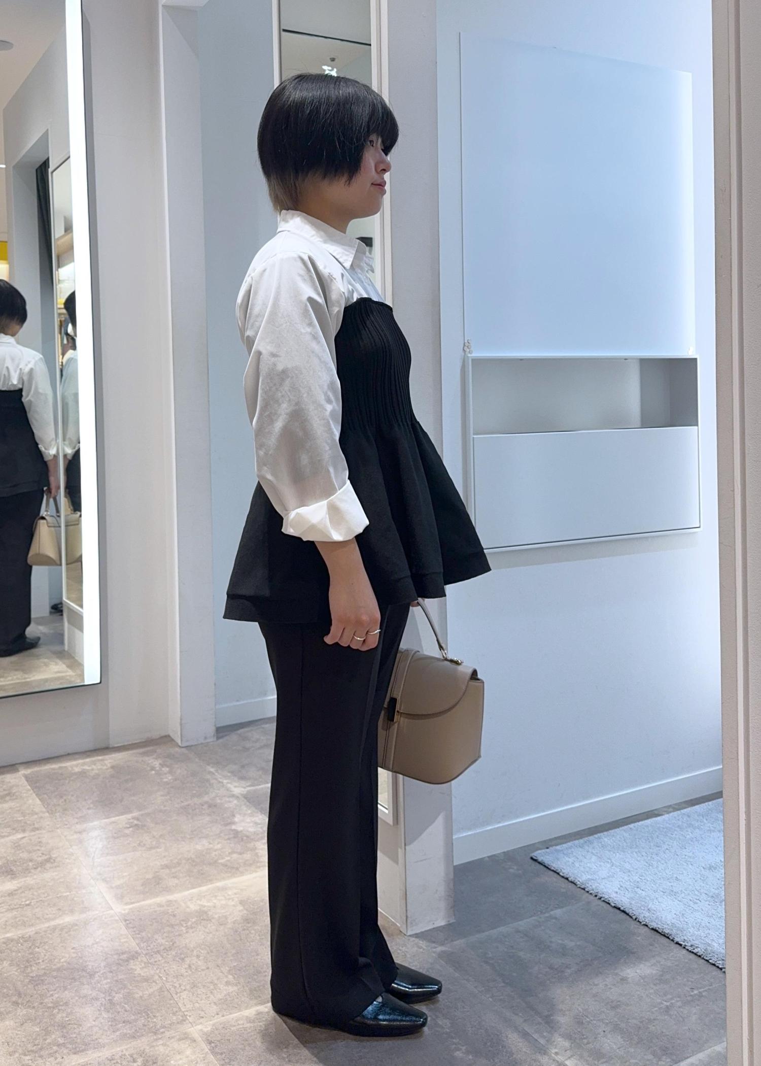 きちんと感も残しつつ少し華やかにも見せたい...そんな時に合わせたいコーディネートです!ニット部分とボトムをブラックで引き締め、シャツやバッグで明るさをプラスして暗くなりすぎない印象にまとめました。